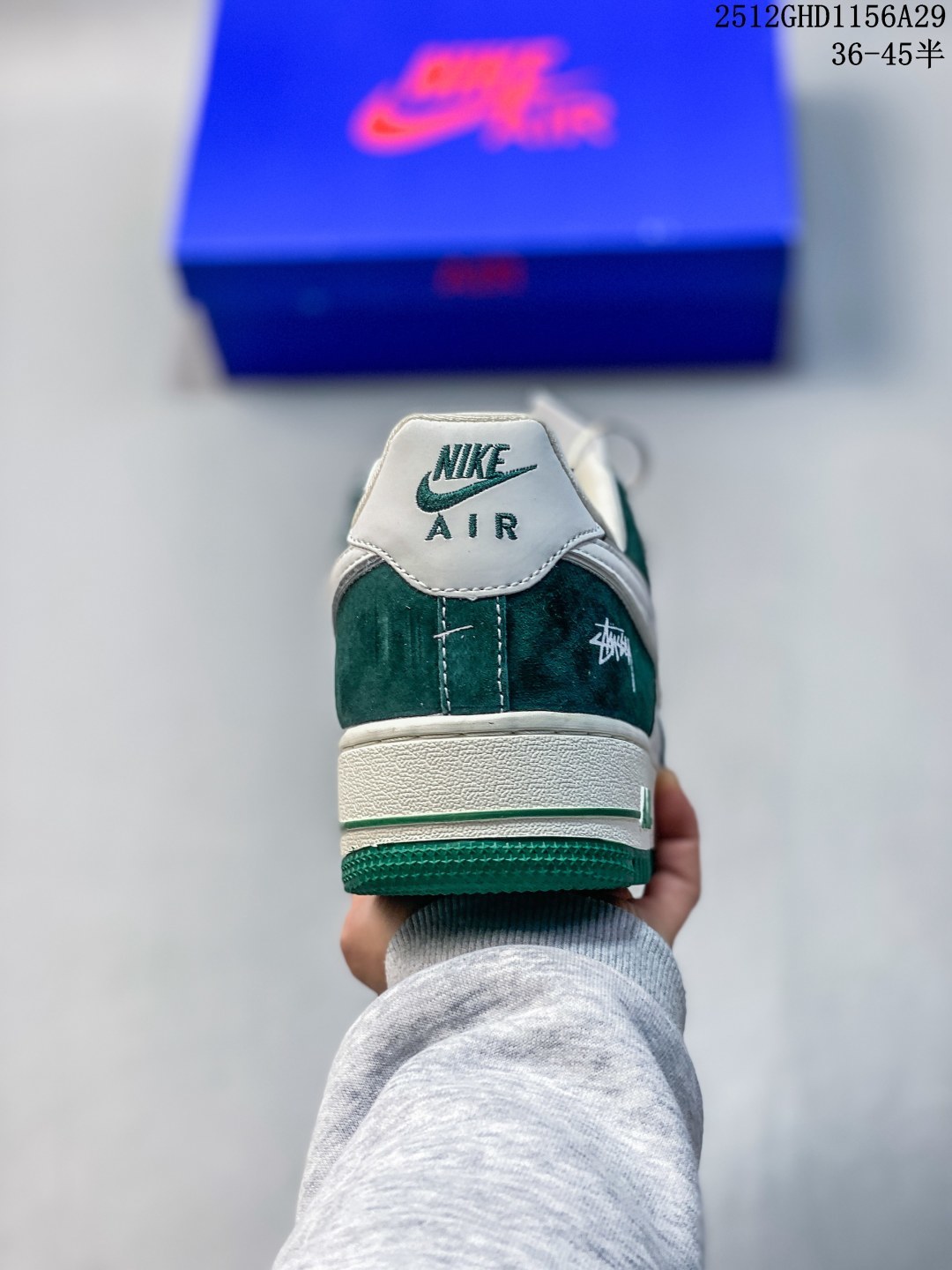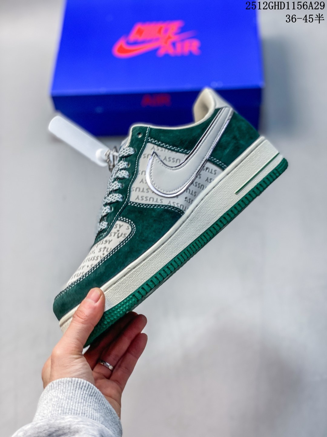 鞋身以墨绿麂皮为主调 质感细腻又自带复古腔调 鞋头与鞋侧拼接印有Stüssy标志性字母的印花材质 潮牌基因直接拉满 鞋侧的Nike Swoosh以白绿双色呼应鞋身 搭配鞋帮处的Stüssy手写体刺绣 再加上鞋带上的金属吊牌装饰 每一处细节都透着联名款的独特质感 让整双鞋的设计感与辨识度双双拉满 Air Force 1的经典气垫中底延续了舒适脚感 米白中底搭配墨绿包边 与鞋身色彩完美呼应 上脚既保证了日常穿搭的舒适度 又能轻松驾驭各种风格 不管是搭配工装裤打造硬核美式街头风 还是配休闲卫裤玩转慵懒潮范 这双鞋都能成为造型的点睛之笔 瞬间提升穿搭的潮酷指数 作为Nike与Stüssy的重磅联名款 它不仅是脚下的穿搭利器 更是街头潮流爱好者的收藏佳品 入手即解锁纯正的美式街头潮流密码