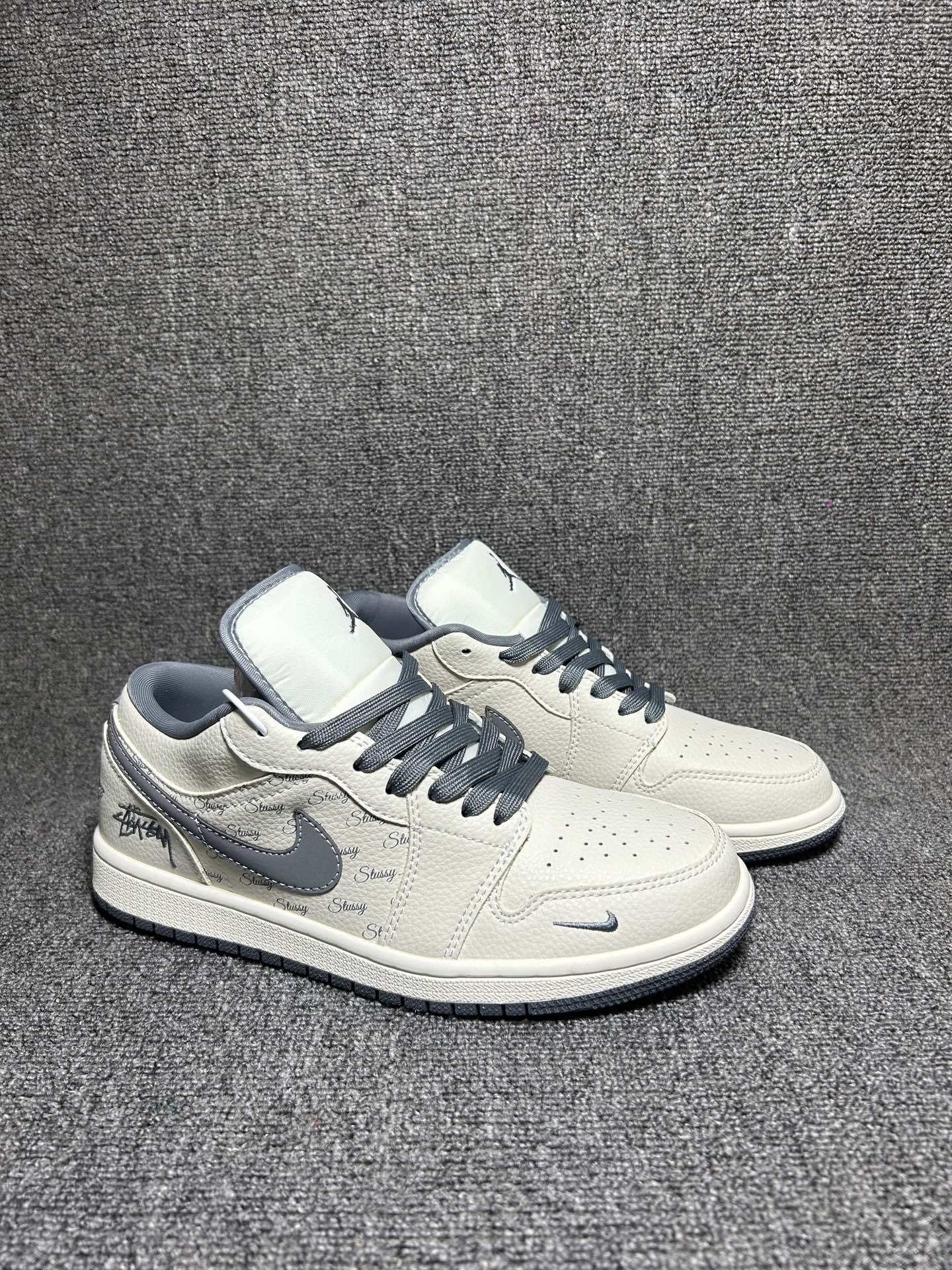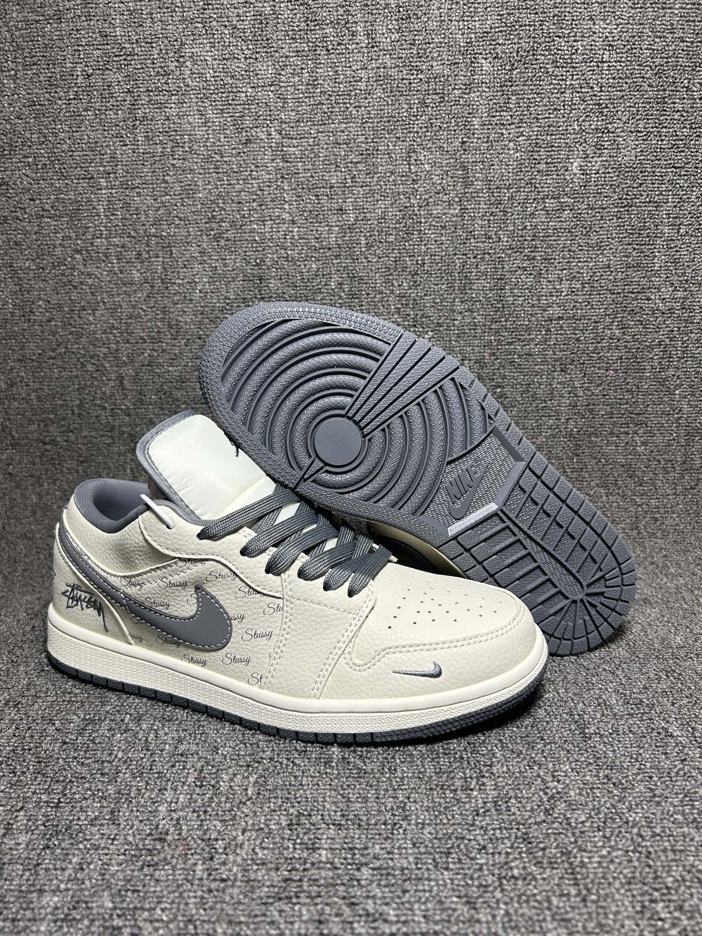 海外爆款限量发售 Nike Jordan Air Jordan 1 斯图西联名 米灰印花 高端定制 低帮 复古 减震 防滑 耐磨 篮球鞋 定制鞋盒 大厂纯原品质出货 超高清洁度 皮料切割干净无任何毛边 细节完美