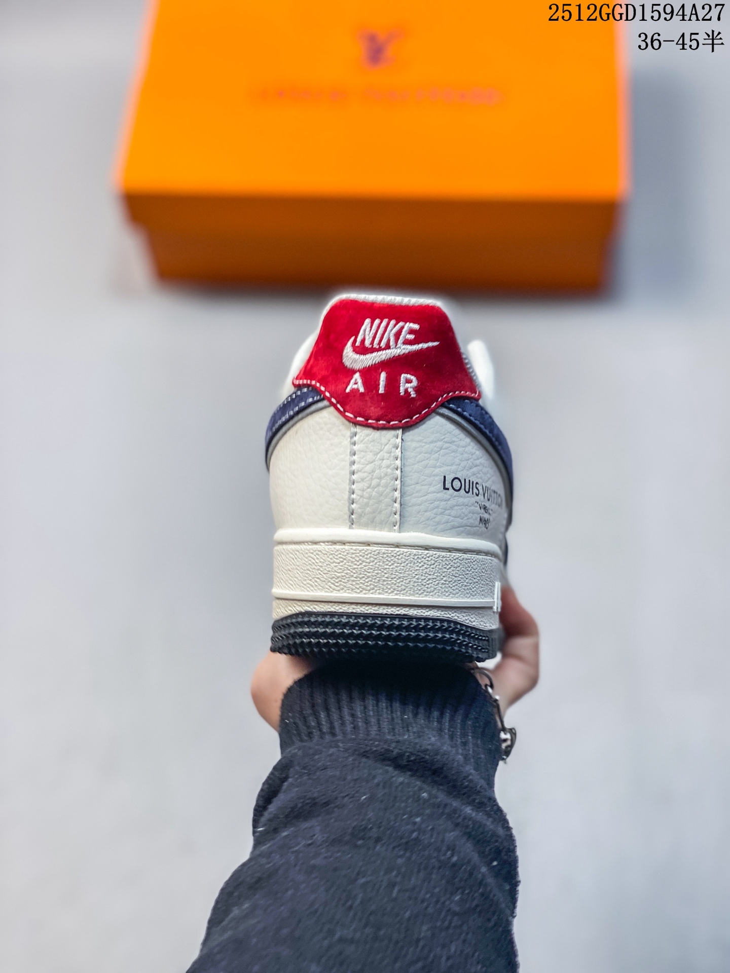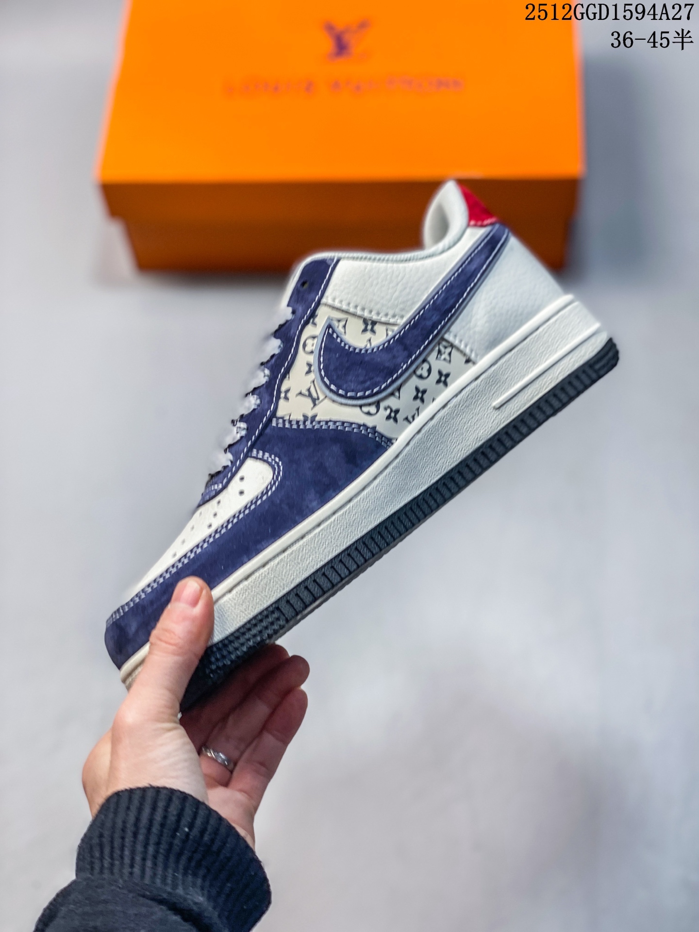 鞋身以蓝白为主调 细腻的磨砂皮革搭配满印的LV经典Monogram老花暗纹 低调中暗藏奢华底蕴 鞋头醒目的红色LV标识 鞋侧灰调Swoosh与后跟红色 LOUIS VUITTON 字样形成视觉呼应 灰蓝拼接的鞋领包边更添层次 每一处细节都将LV的奢雅与AF1的街头基因完美融合 经典的米白中底保留了AF1标志性的 AIR 刻字 搭配黑色外底收尾 延续鞋款的舒适脚感与经典轮廓 无论是高街穿搭的奢潮表达 还是收藏级的鞋款珍藏 这双联名款都以奢潮跨界的独特魅力 成为足下的顶级风景线 让你在潮流圈层中轻松脱颖而出