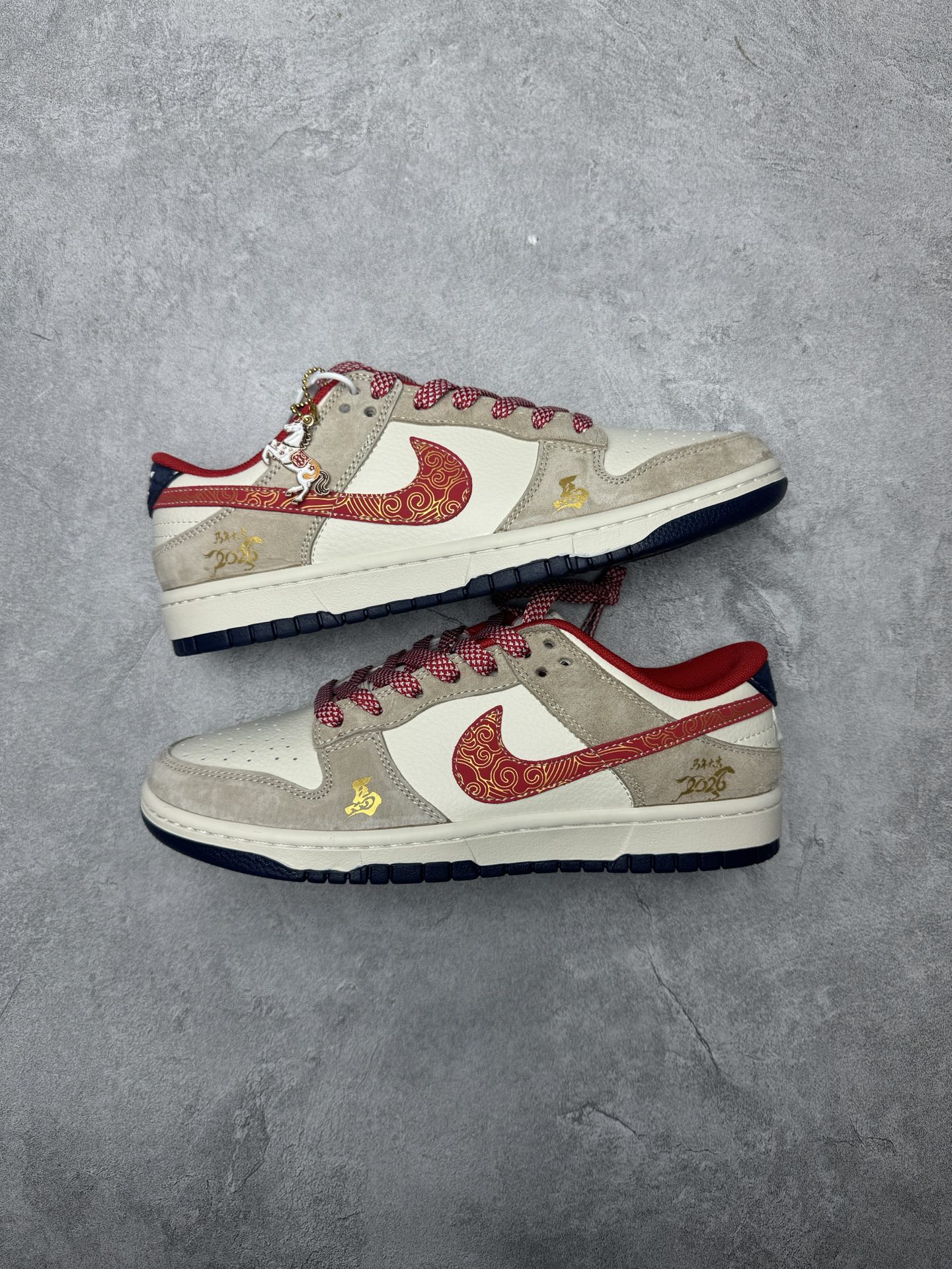 这双鞋将生肖元素与街头潮流完美融合 灰白主调优雅低调 鞋侧的鎏金Swoosh与红色马形刺绣是点睛之笔 后跟的 2026 字样则赋予了它独特的纪念意义 无论是迎接新年还是日常穿搭 它都能让你的风格脱颖而出 迈出的每一步都别具一格