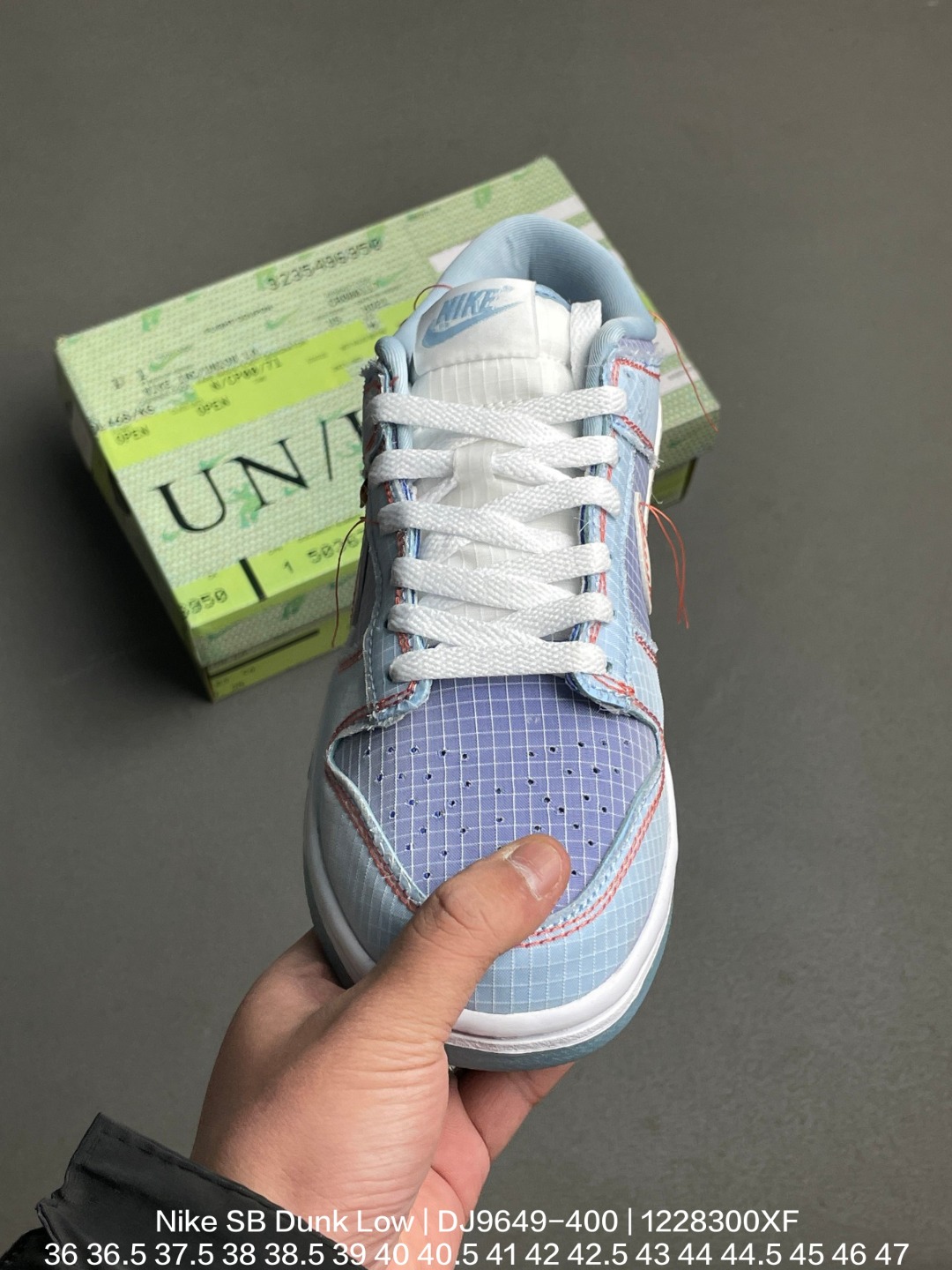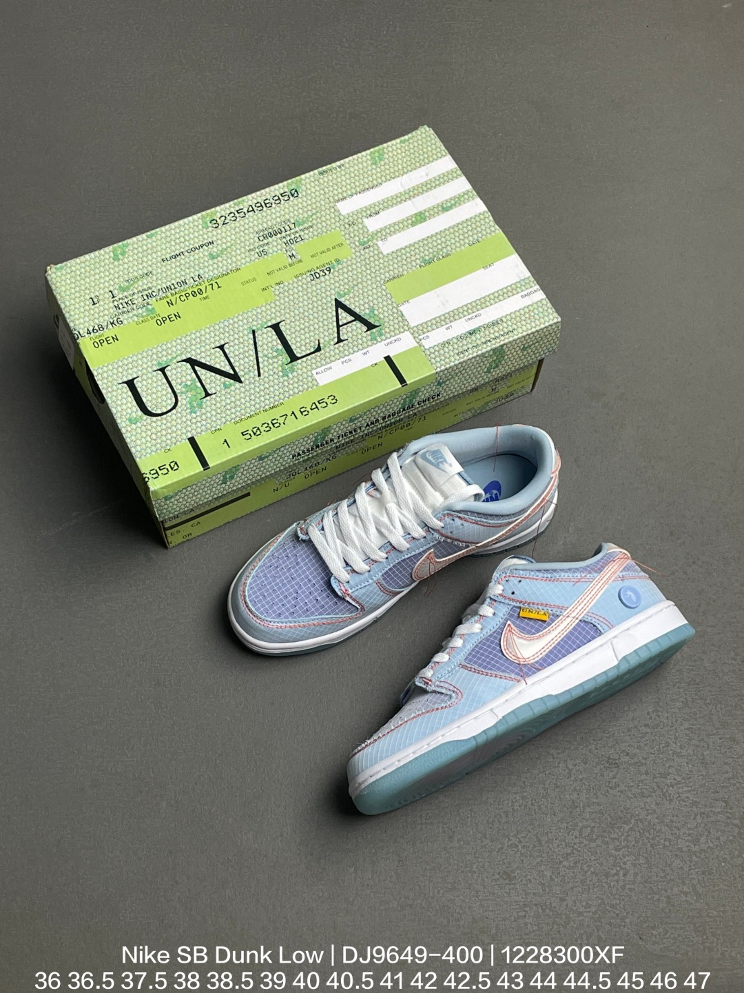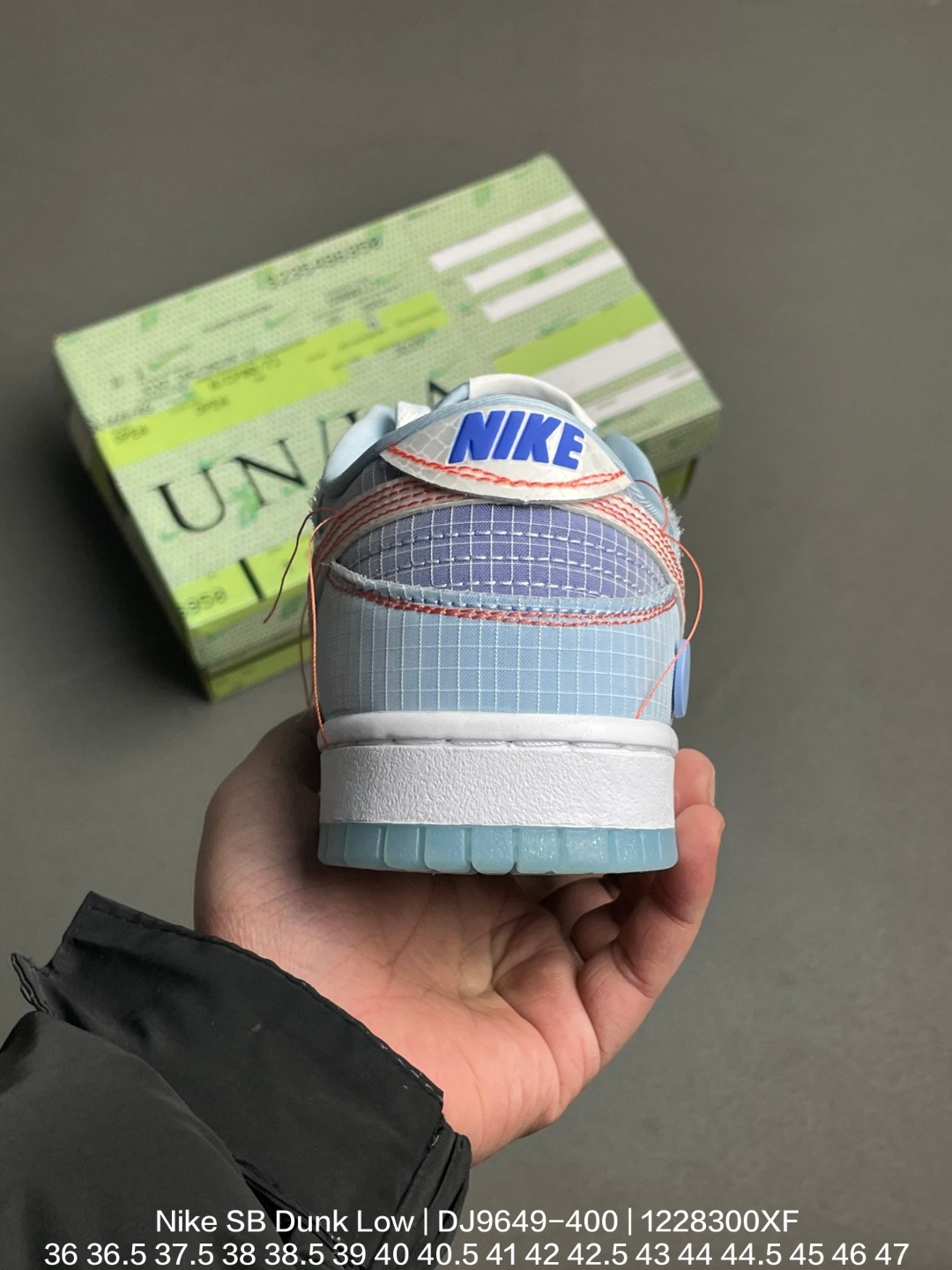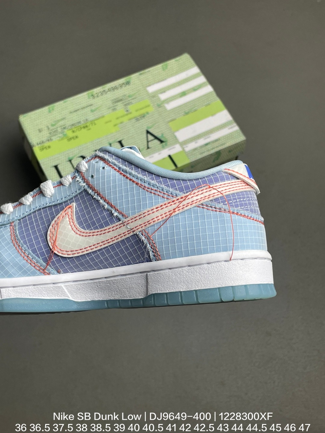 Nike 耐克 采用防剐尼龙布材质鞋面 垫嵌入缓震乳胶 Sole真气垫装置 外置耐磨橡胶大底2022年推出第三款配色 颜值超高洛杉矶知名店铺Union LA x Nike SB Dunk Low Blue 扣篮系列低帮休闲运动滑板板鞋 浅蓝联名蓝缝线 DJ9649 400
