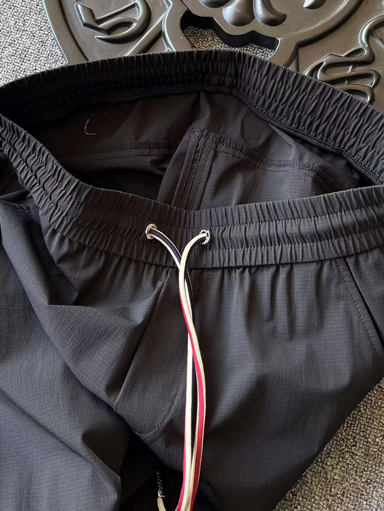 细节细节再细节 Moncler家商场新品束脚裤 裤前缝制最新蒙口米标 后裤腰口刺绣Moncler标识 口袋处夹着蒙口彩三色标 YKK代工高光金属抽绳孔金属头配合蒙口标志性彩色抽绳 十分精致 国内一线大厂代工出口品质 精湛无可挑剔做工