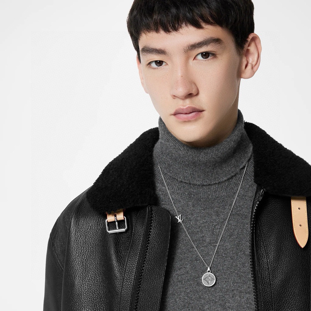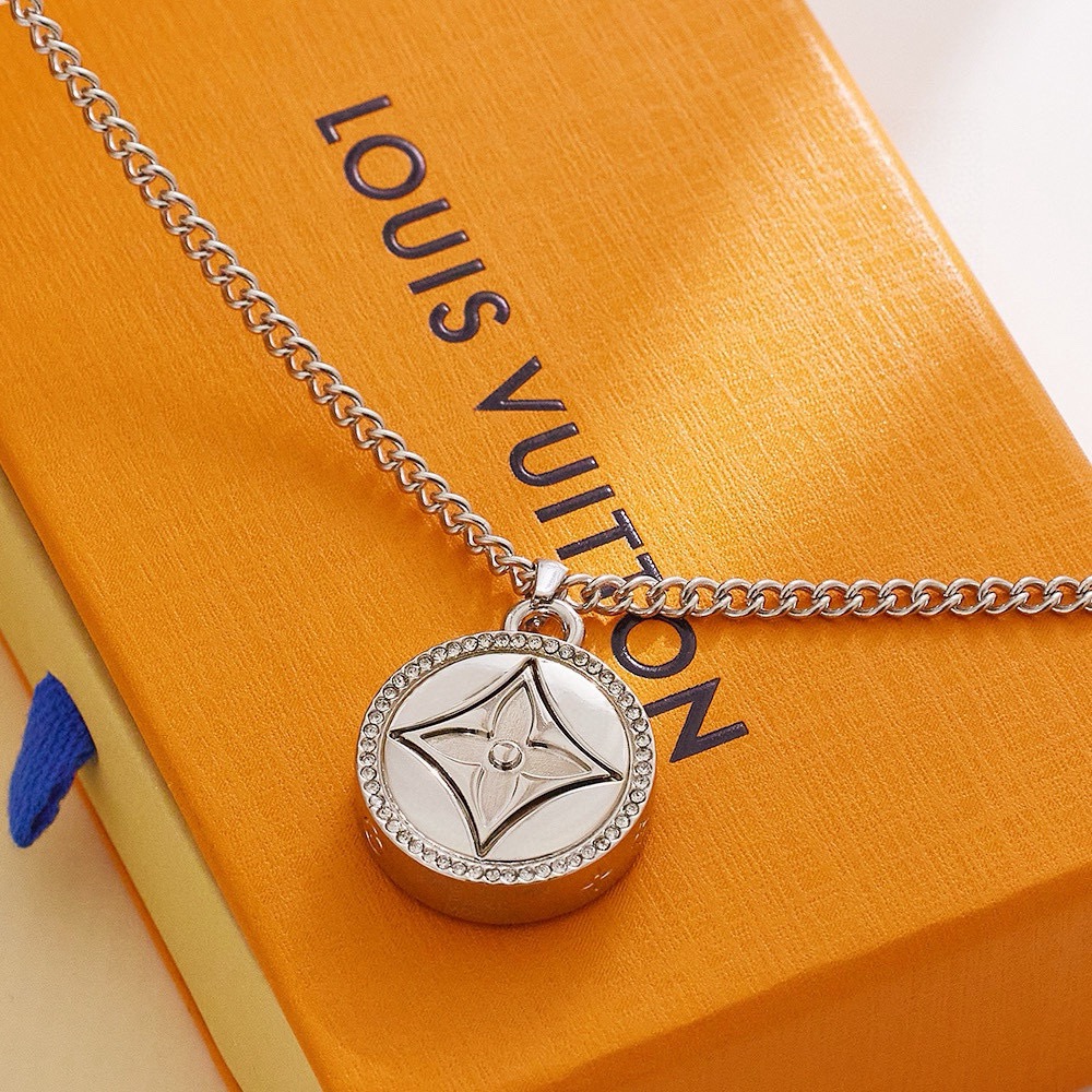 LV Twisted Flower 项链为圆形挂饰镂刻 Monogram 花卉 四周环绕精致水晶 滑动开合开启内部空间 LV 字母点缀可调节链条