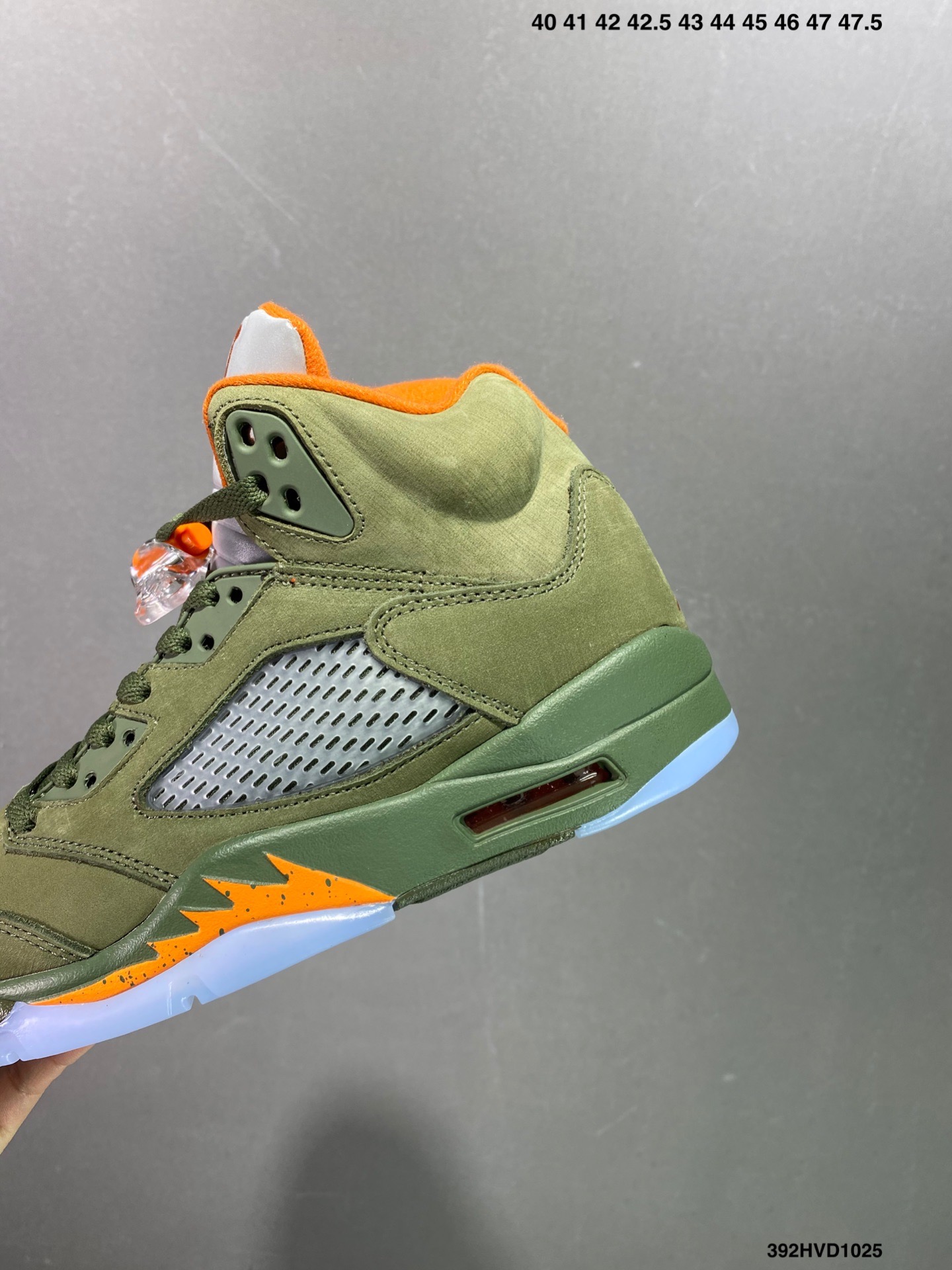 鞋款采用绒面革抽象设计鞋面 搭配黑色 Jumpman 标志 其他细节包括绒面革鞋舌 半透明网 侧面鲨鱼牙齿上的金属银色饰边和标志性的透明系带扣 帆白中底和乳白色半透明外底完善了设计