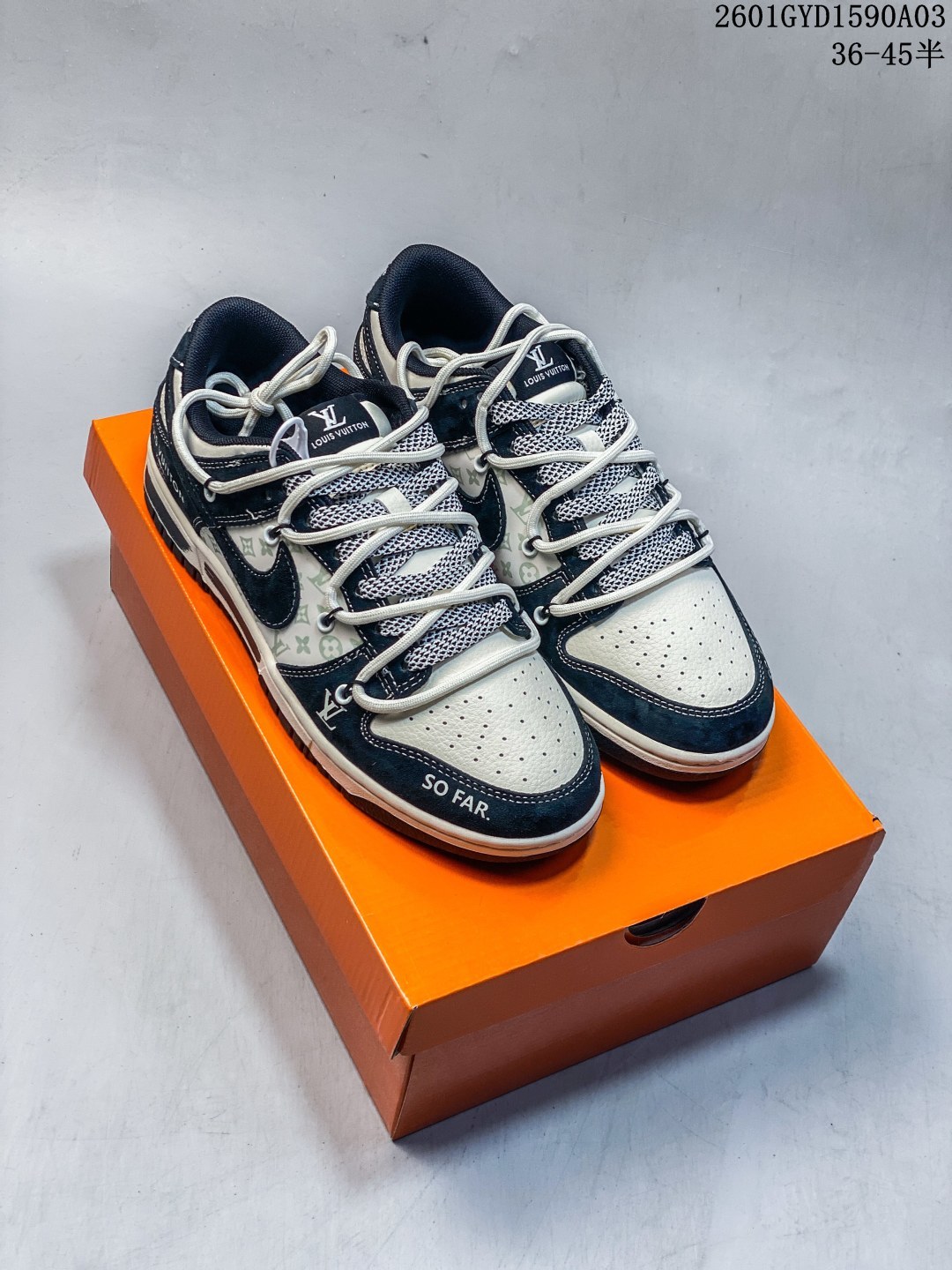 当街头标杆Nike Dunk Low遇上奢品巨头Louis Vuitton 这双CX5050 Y55直接将奢潮融合的魅力展现到极致 经典的黑白熊猫配色为基底 鞋身点缀的LV经典老花图案暗藏奢华基因 侧边的 LOUIS VUITTON 标识与鞋头的 SO FAR 字样形成视觉冲击 做旧风的中底设计更添复古解构感 Dunk Low的经典鞋型保留了利落的线条与舒适的脚感 LV的奢品元素则为鞋款注入了高阶时尚感 每一处细节都彰显着联名的独特巧思 不管是作为收藏级的潮流单品 还是日常搭配中打造高街造型 这双鞋都能成为你造型中的点睛之笔 让你轻松拿捏奢潮结合的穿搭腔调