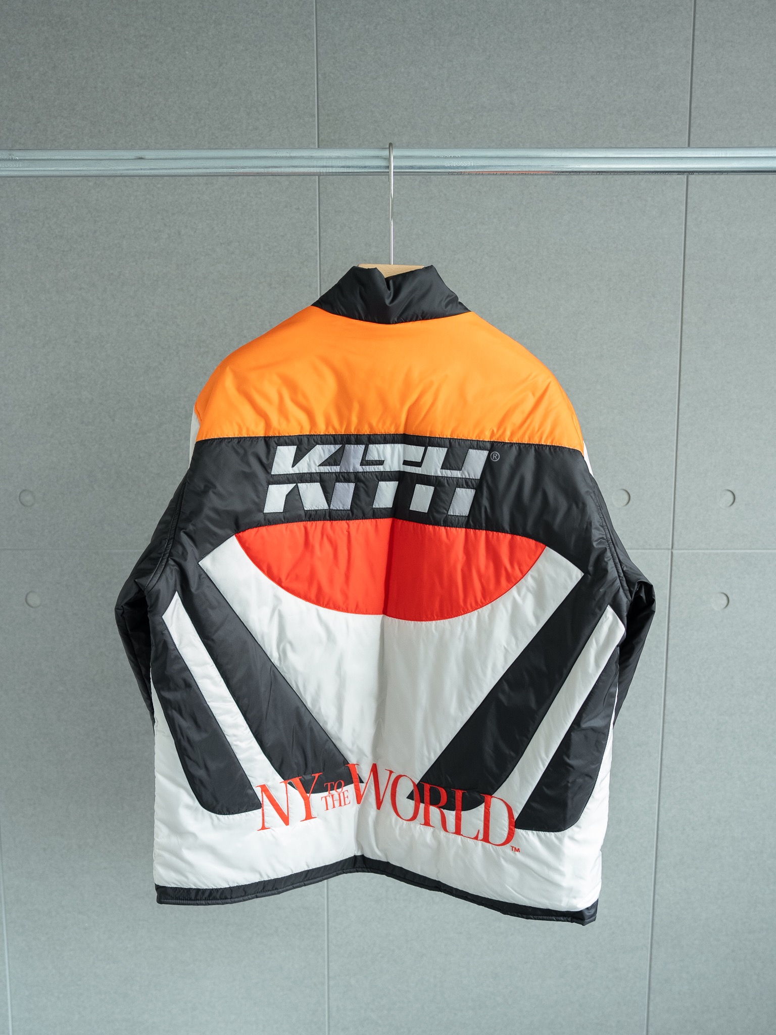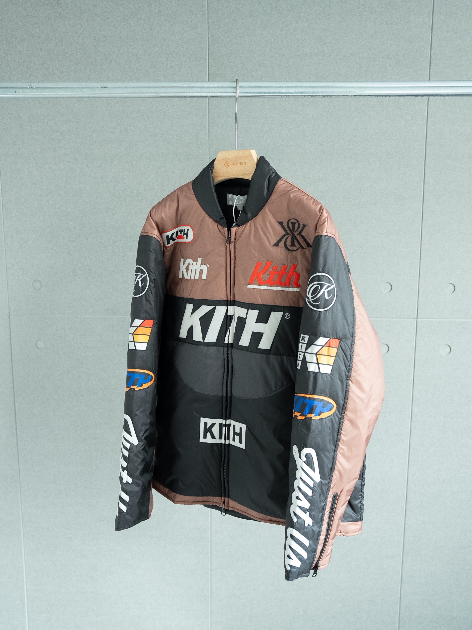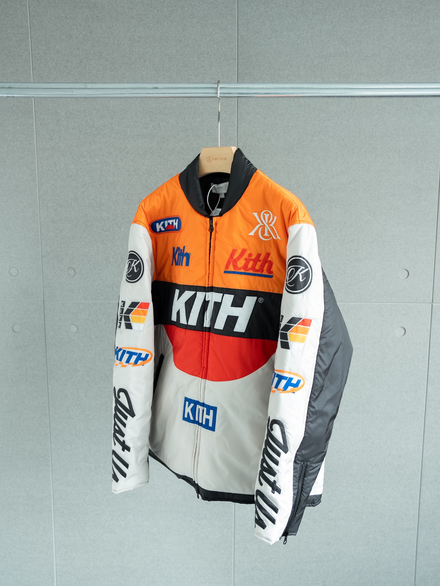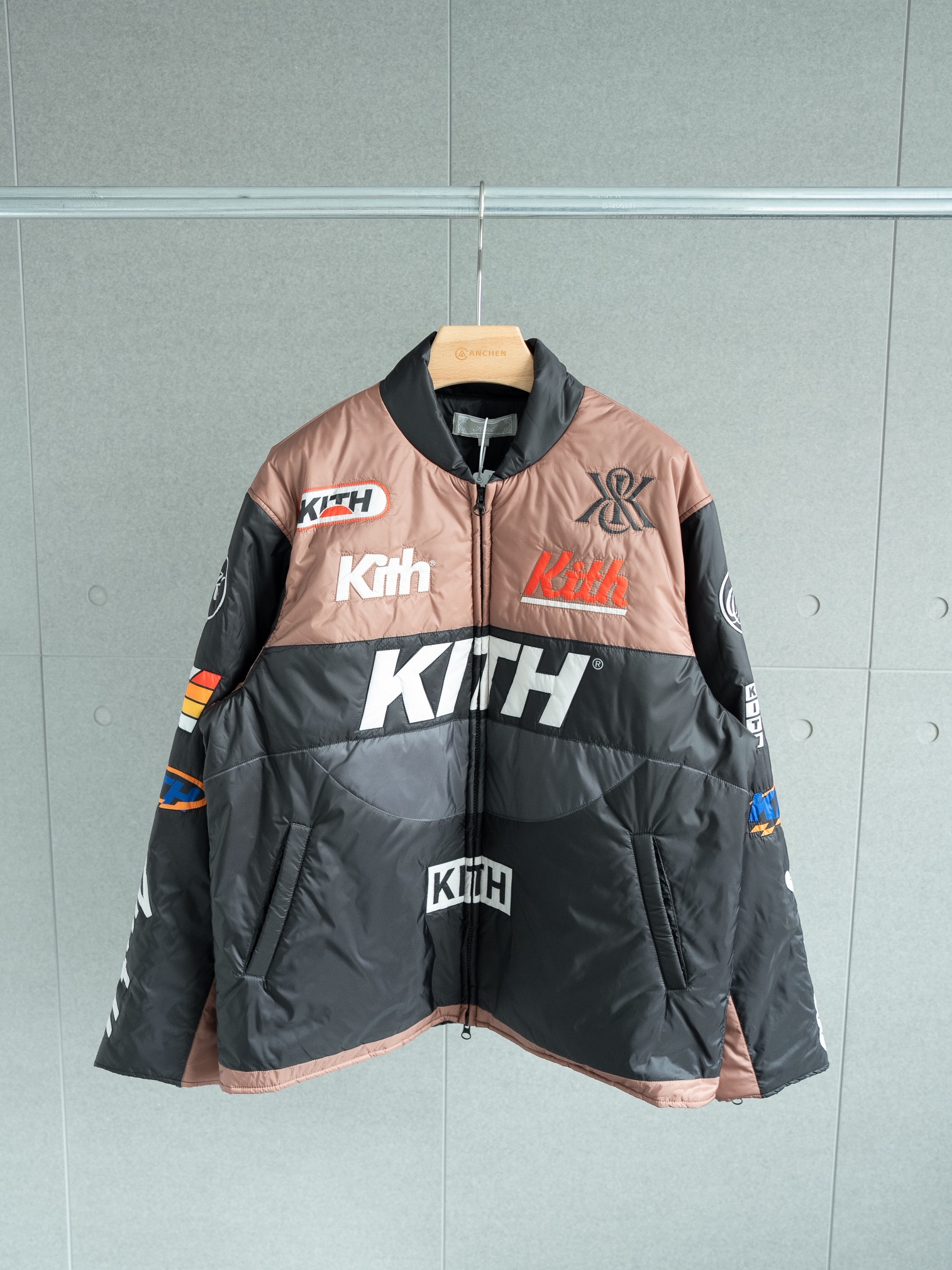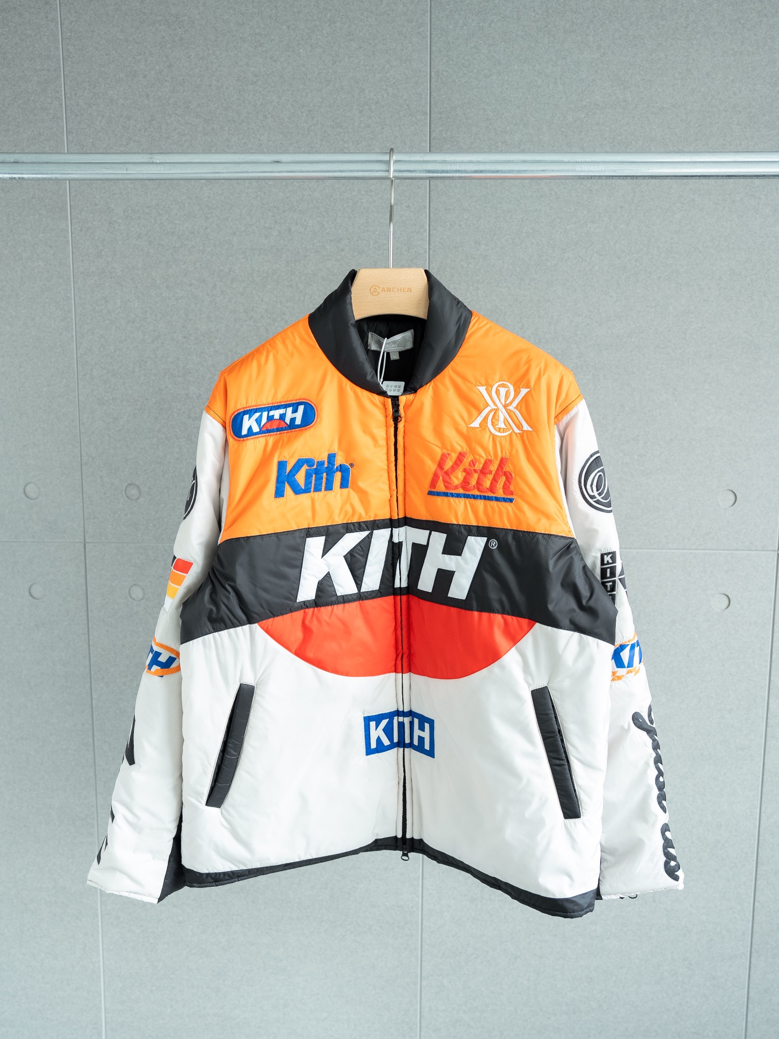 代工厂原样购买 1 1定制出货 还原度达到95 以上 具体请看对比图 难点就在裁剪上 巨费工时 衣服主体有五套色 定位裁剪后去做绗绣 非常繁琐 内里填充的棉使用新雪丽的G型 40g棉 非常轻薄但很保暖 开模定制Kith五金拉链 丝滑进口拉链 三标均为制定 细节请看对比图 十星强推单品