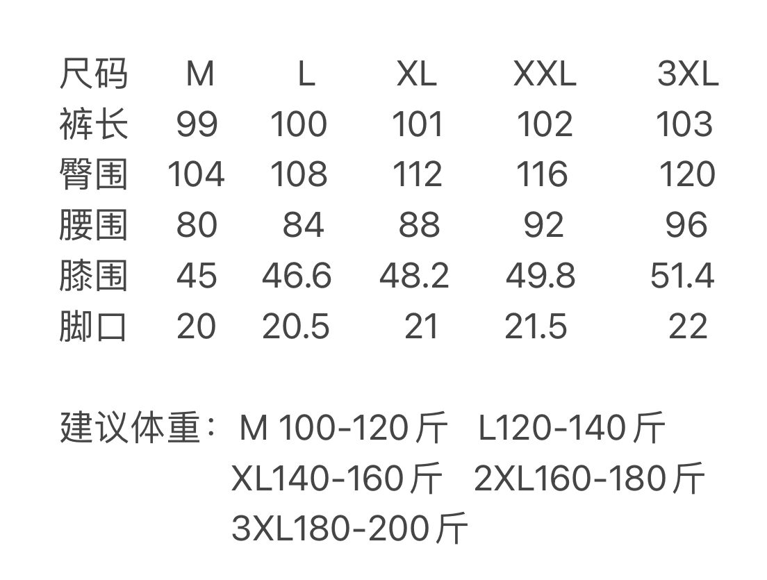 尺码 M 3XL