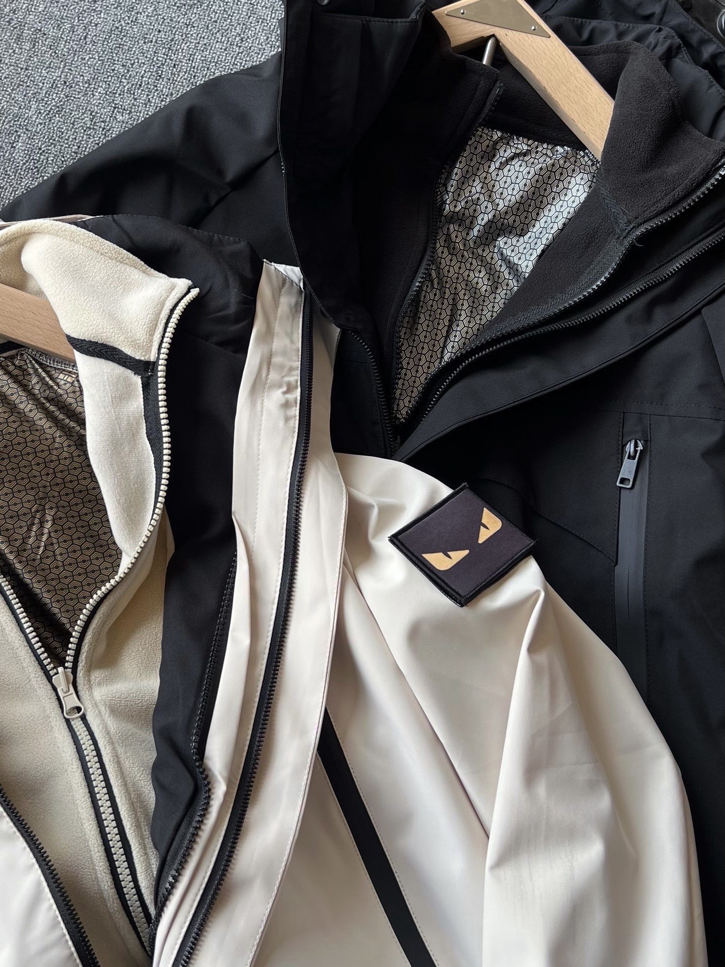 细节细节再细节 Fendi家商场两件套三合一可拉链一体加厚御寒外套冲锋衣 内里是保暖亲肤超柔细腻摇粒绒内胆 可以在适温时穿 单度外面冲锋衣可以单独作为外套穿着 寒冷天气利用内嵌式双拉链可以将内胆和外套合成一体 抗寒保暖性极强 防水大齿拉链口袋设计 袖子带有芬迪小怪兽标识 十分精致 内里带有石墨烯保暖工艺 静态锁温