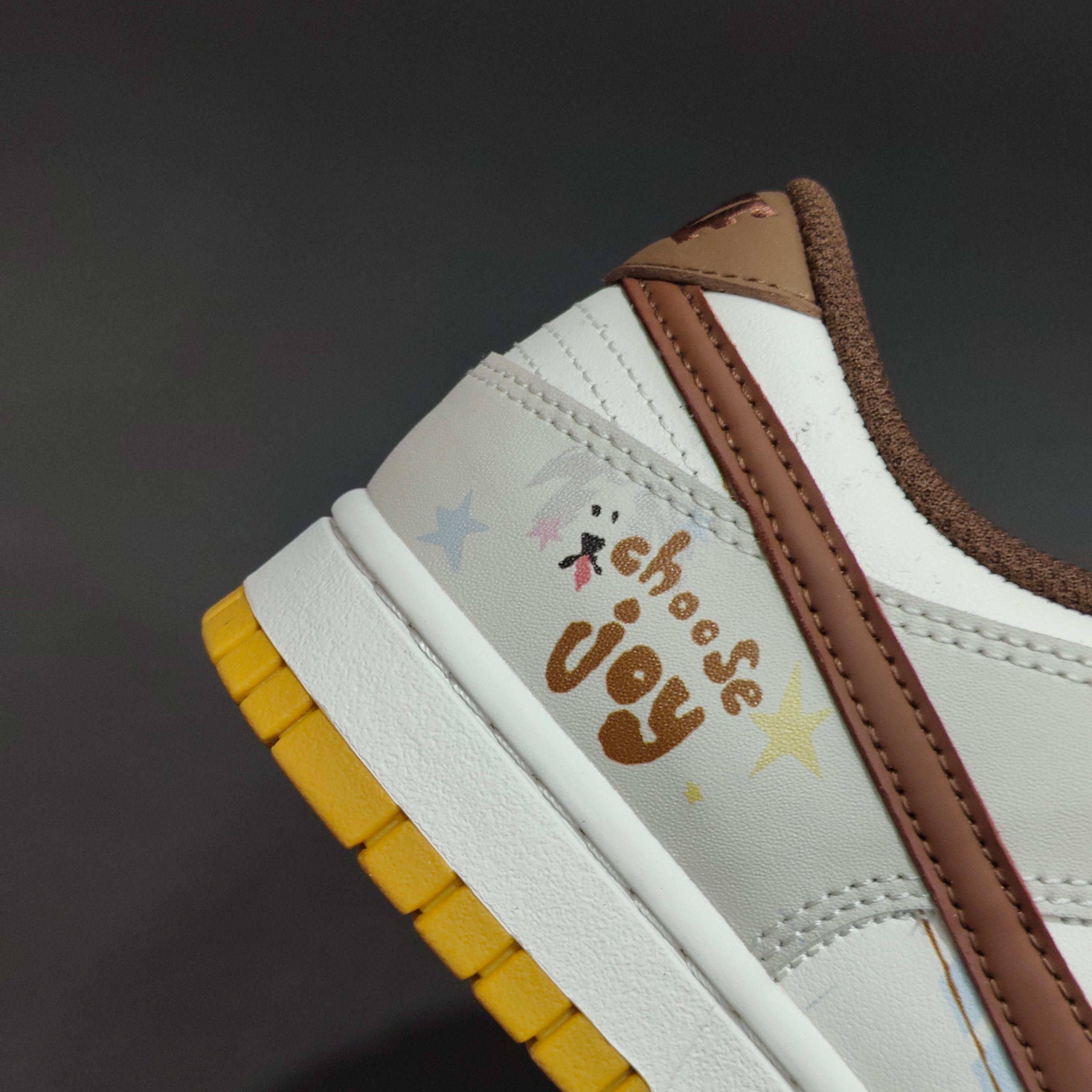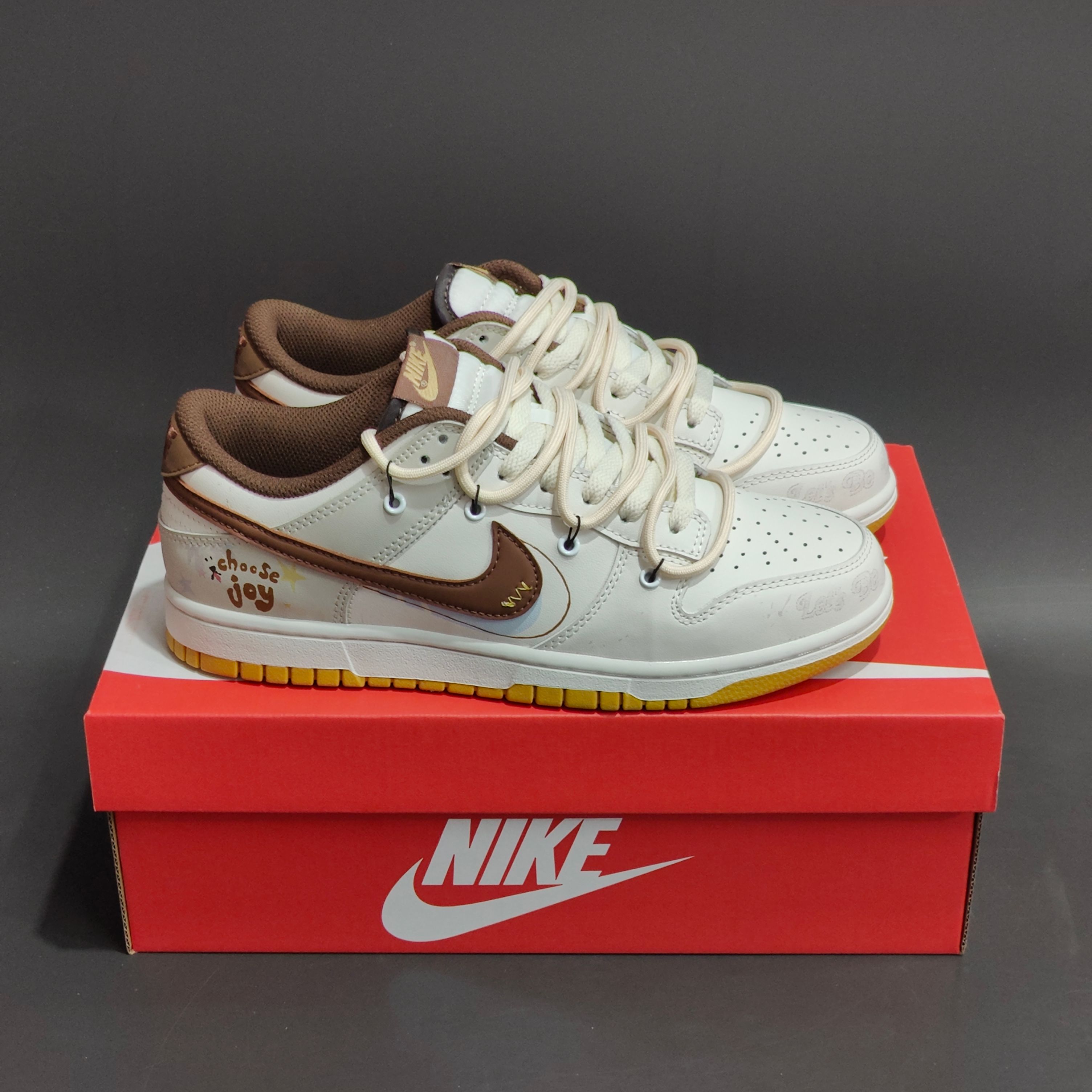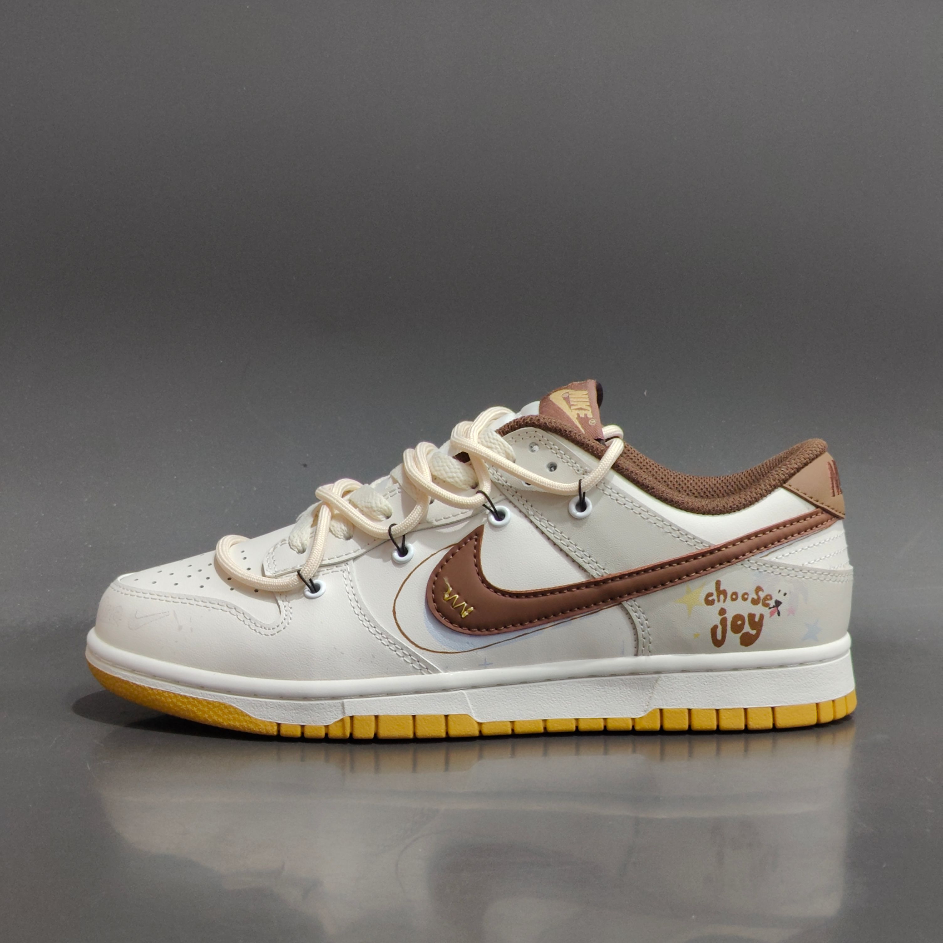 纯净白色鞋身 如绵密奶泡轻柔包裹双足 细腻的皮革质感让简单的白也拥有层次 深棕色Swoosh划过侧边 仿佛一杯醇香可可轻轻勾勒 低调却醒目 是整身搭配的温柔焦点 后跟俏皮英文搭配小小星标 是悄悄藏起来的积极暗号 生活可以加点甜 每一步 都是柔软而明亮的自我表达