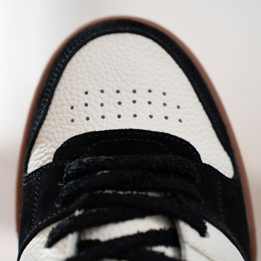鞋面采用麂皮和胶片拼接组合