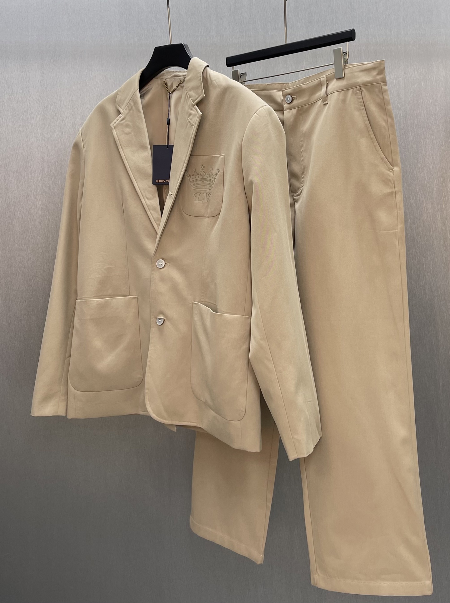 本款棉质休闲裤铺陈可 借正面褶裥烘托垂坠质感 再为后袋压印心花卉标识搭配衬衫或 T 恤出席各式场合 亦可与同款那不勒斯式夹克共筑考究造型