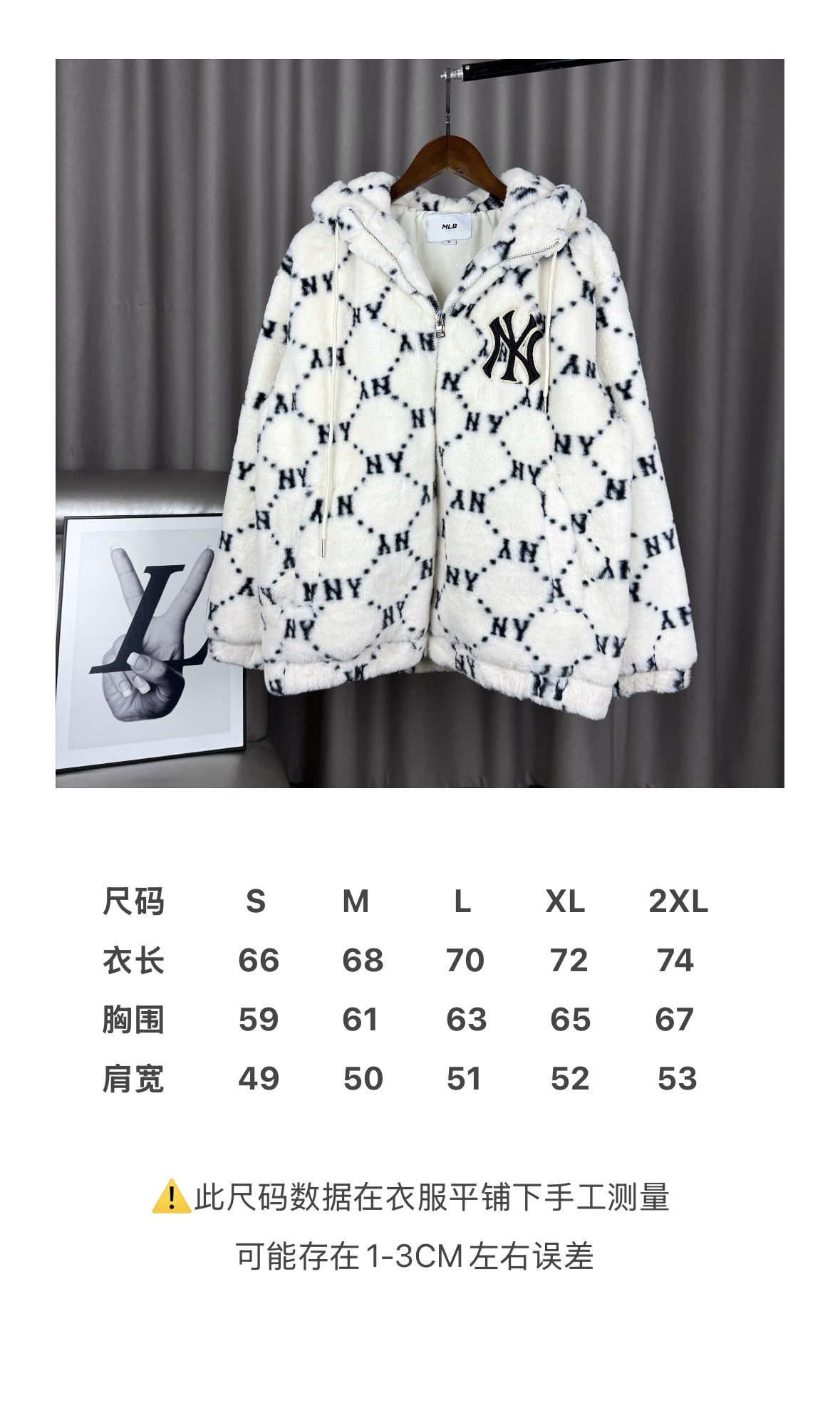 面料采用原版定制高克重优质仿兔毛 上身柔软舒适 保暖防风 搭配满印logo里布 帽子上原版贴布刺绣 棒球人 标志 所有五金都有钢印logo 胸前刺绣立体饱满 宽松的版型男女同款不挑身材