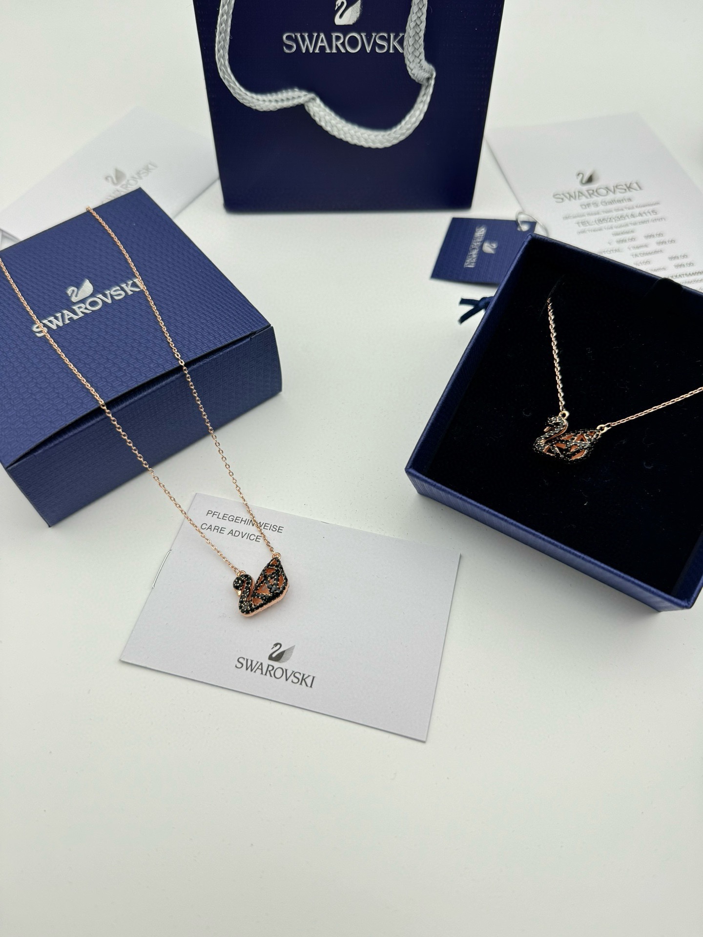 售后不停可退换 SWAROVSKI施华洛世奇黑白双面天鹅项链 配全套包装 款405 施华洛世奇原厂订单 深圳出口港货 仅此一批 礼物准备好了吗 天鹅 象征优雅及高贵是施华洛世奇首饰的标志 自信 幸运并且天鹅一生只有一个伴侣 象征着一心一意 代表珍贵而永恒的爱情 这款时尚迷人的项链 以施华洛世奇的品牌标志 天鹅为特色 并将黑白造型提升至另一层次 令人想起仿水晶切割面的设计 在立体饰框两面分别密镶精致闪亮的黑色和透明仿水晶 富现代感与线条美之余 又与其他首饰巧妙配衬 随附一条饰链 带上它尽显风情 让你在每个场合更添优雅 链长 45CM可调节 尺寸 长2CM 宽1 5CM 颜色 玫瑰金 材质 V金 仿水晶 多种金属润饰
