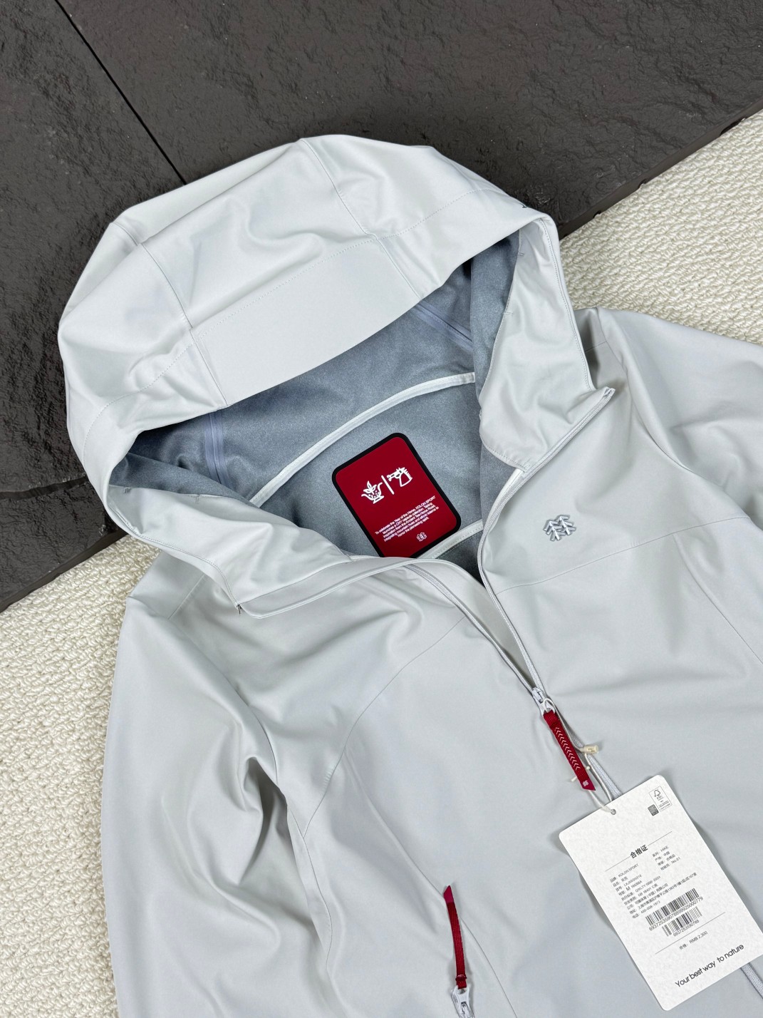 春秋户外徒步日常都能穿 内里灰色 微收腰 弧形下摆 显瘦温柔 穿上很有气质 袖口 拉链头红标细节 山川刺绣logo 中国风元素 做工精致