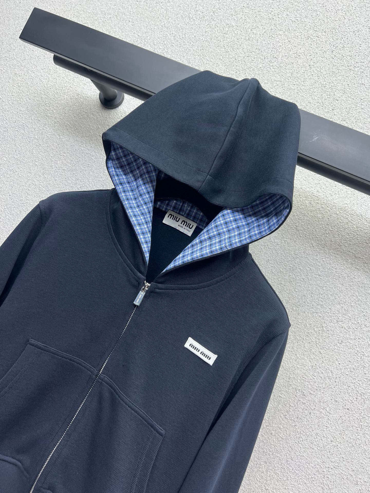 Miumiu缪缪定制字母小标格子拼接定制双头拉链连帽外套抽绳 360287