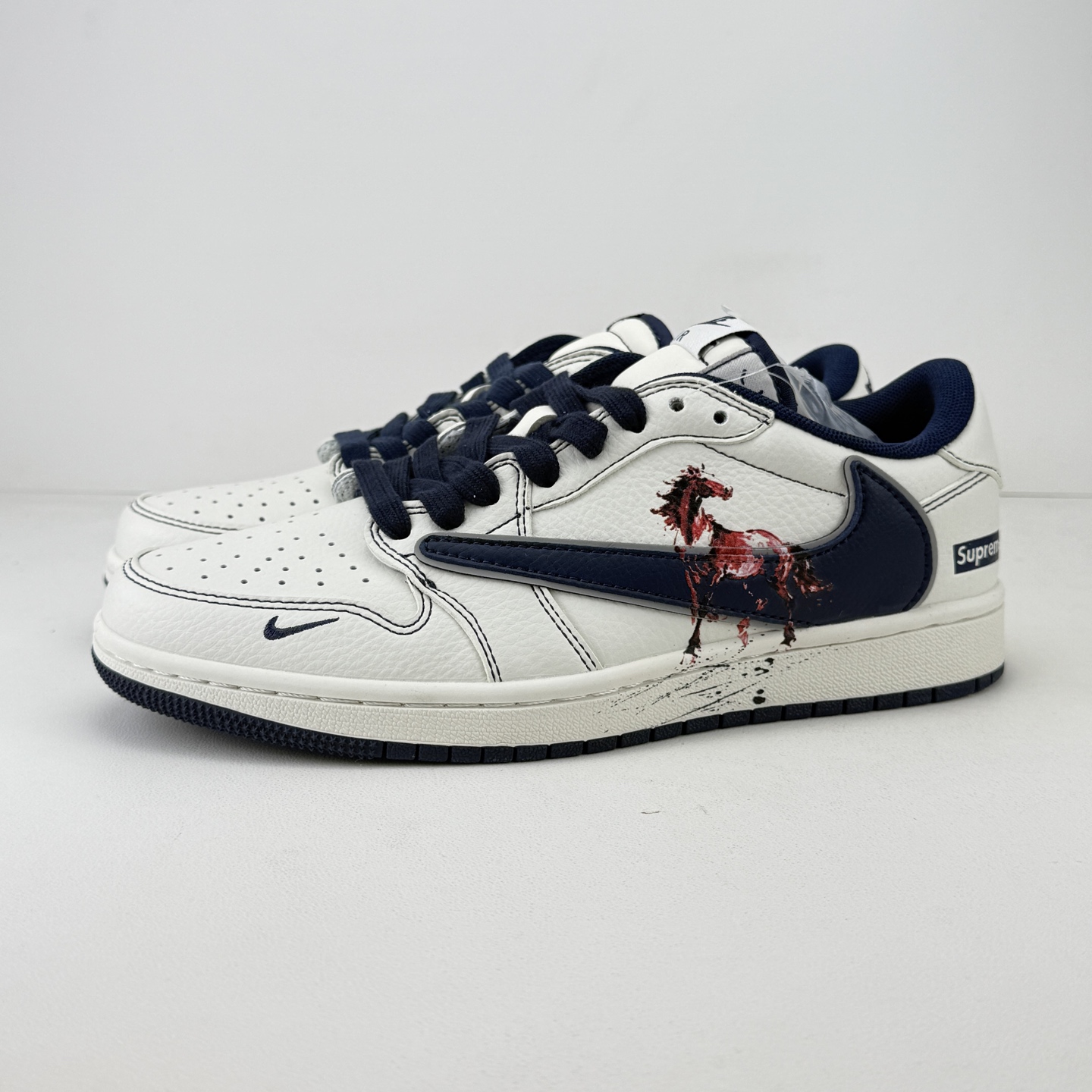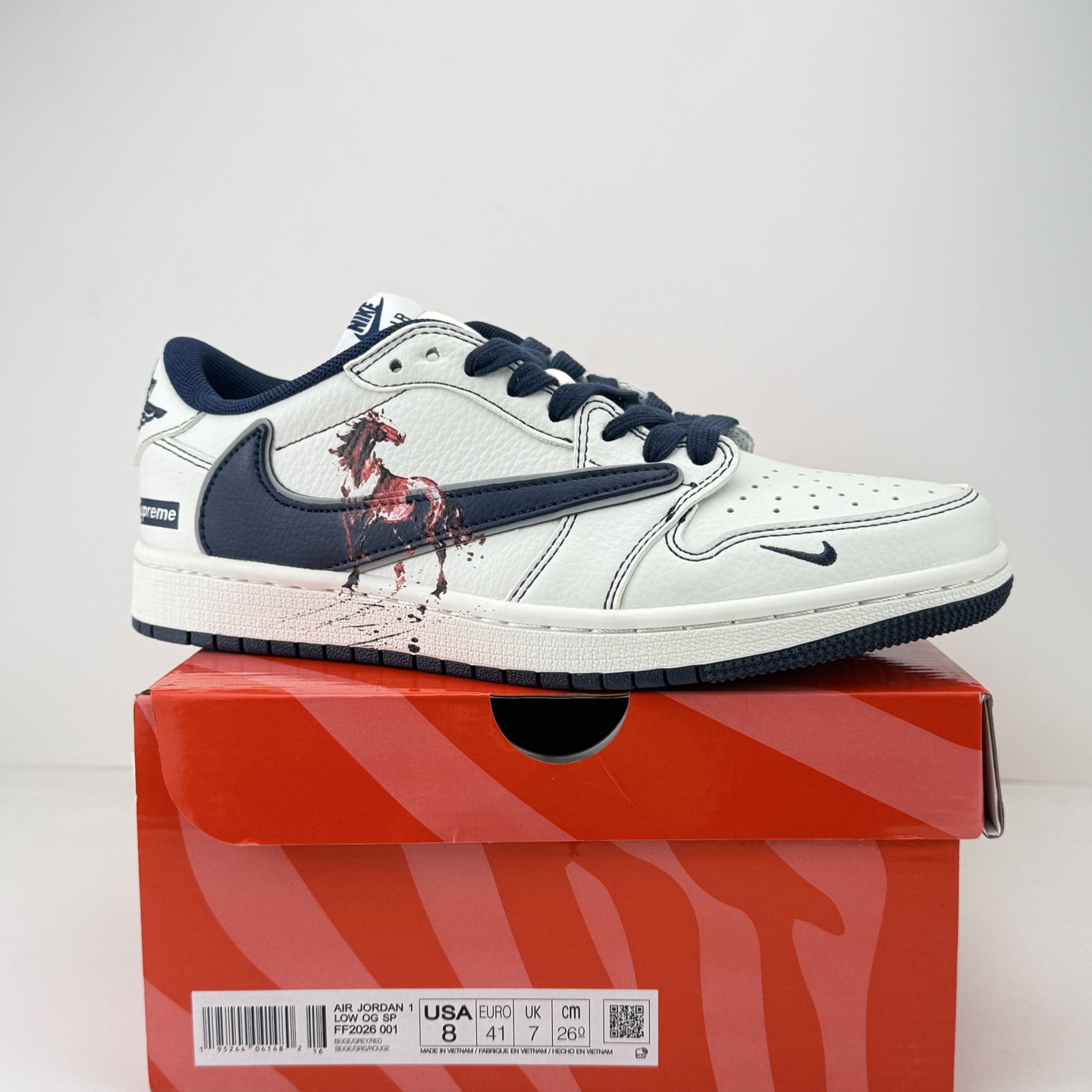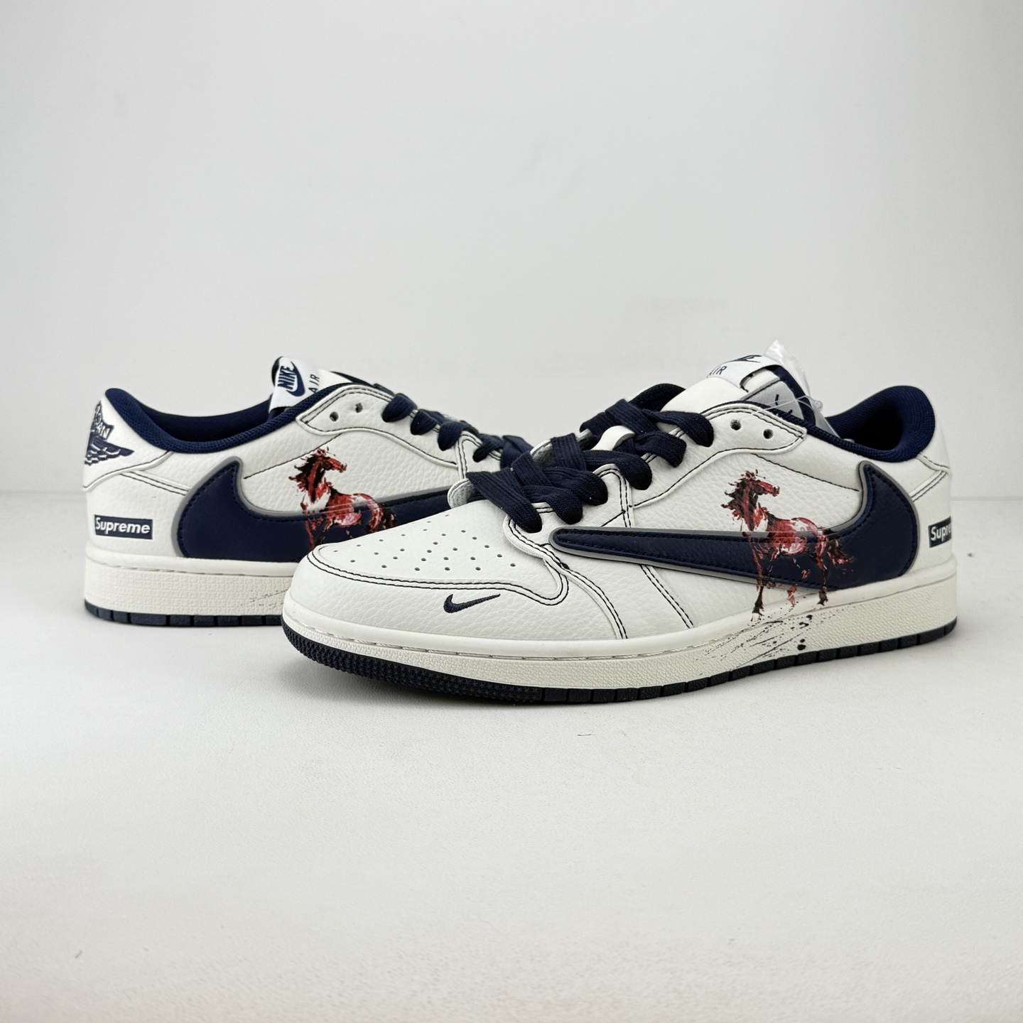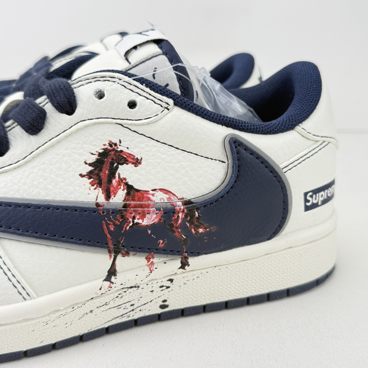 马年炸裂来袭 Air Jordan 1 经典AJ1低帮鞋型碰撞Gucci老花拼接 复古奢潮风瞬间拉满 鞋身红马涂鸦呼应2026马年主题 红蓝撞色搭配亮眼红绸配饰更具视觉张力 敲定稀缺属性 头层牛皮与老花面料拼接兼顾质感与个性 小众定制款彻底告别撞款 不管是收藏摆柜还是街头炸街 都是潮咖彰显品味的不二之选