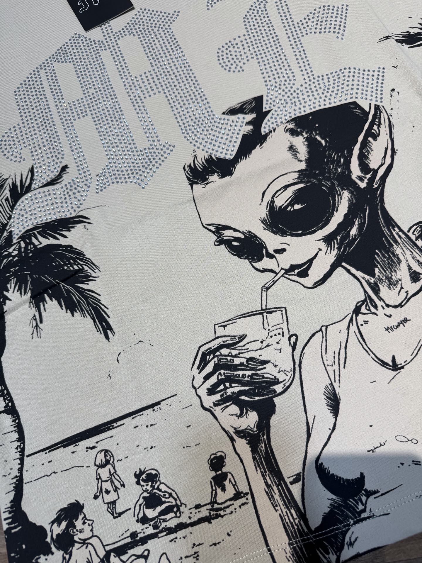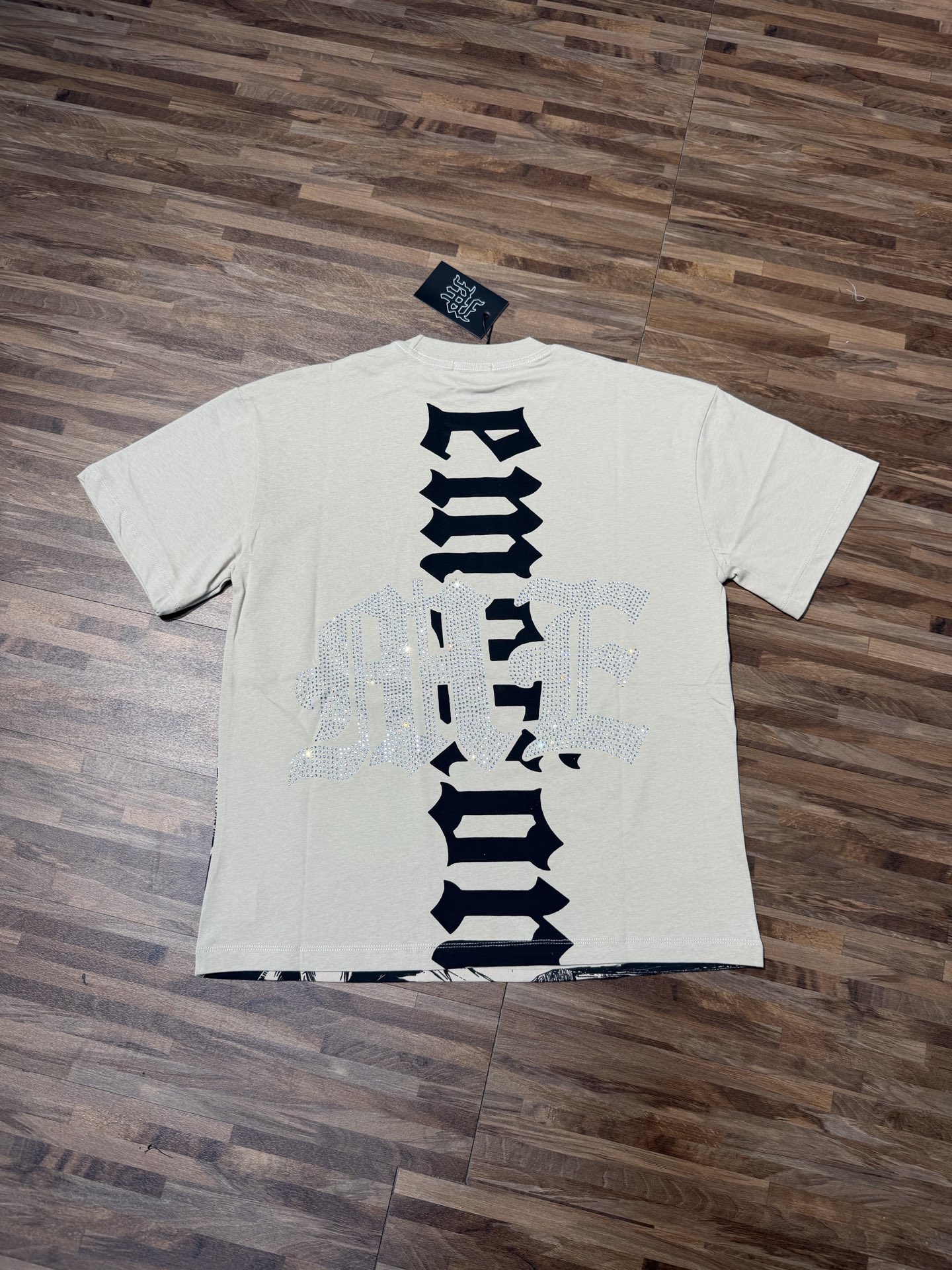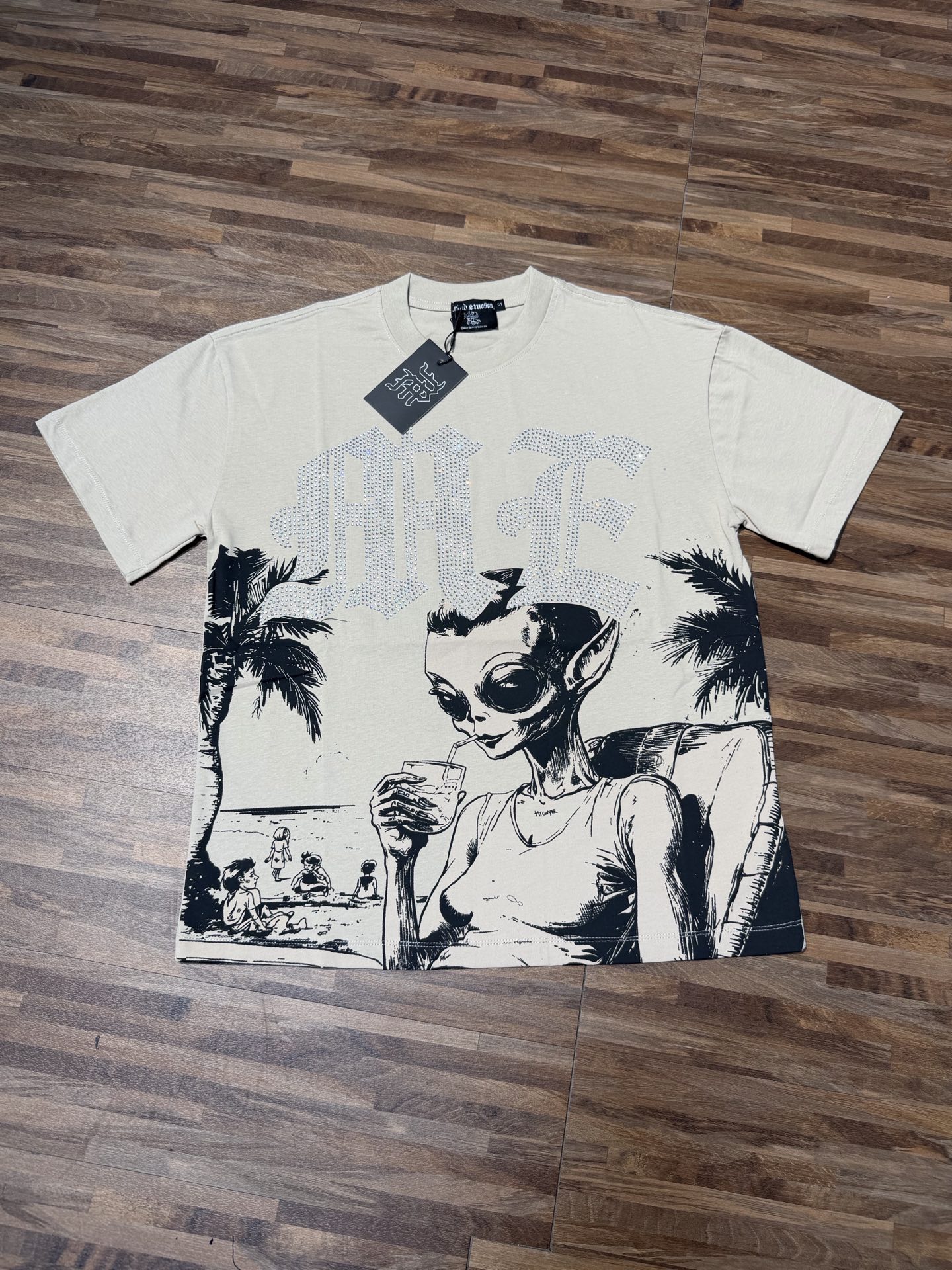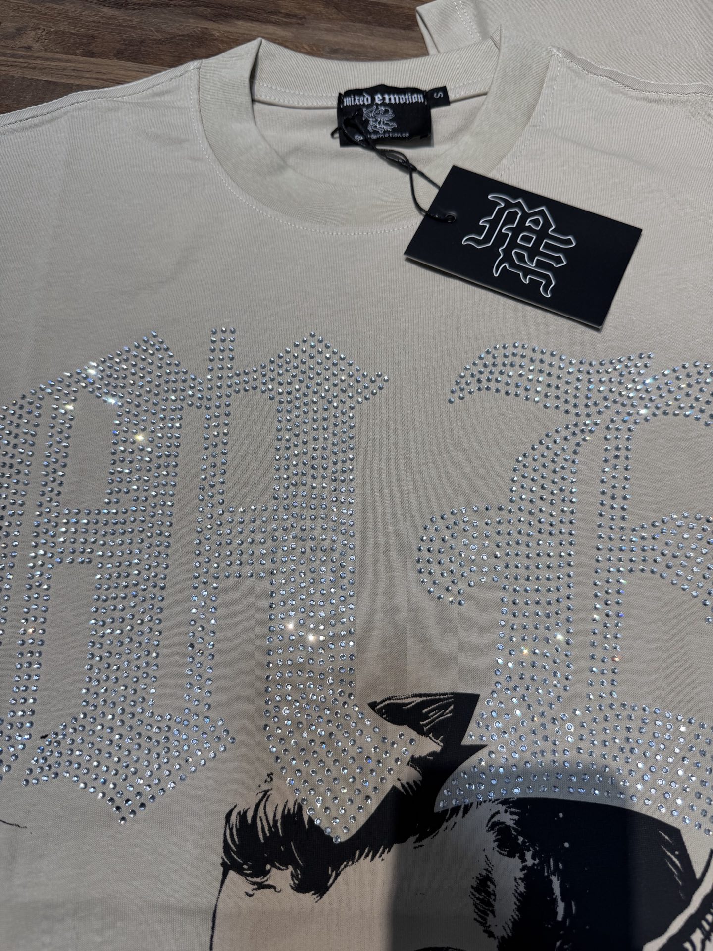 杏色 活性黑 MIXED EMOTION 现货实拍 烫进口澳钻 美式潮牌宽松休闲T恤 面料 fabric 32支270克重精梳双纱纯棉 码数 size S M L X L 工艺 高清印花 颜色 colour 杏色 活性黑