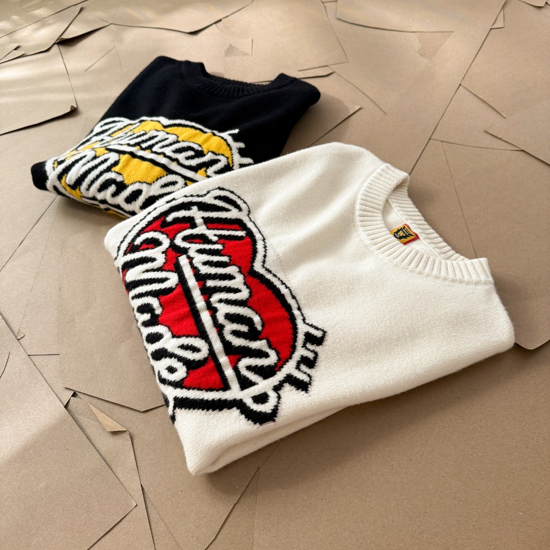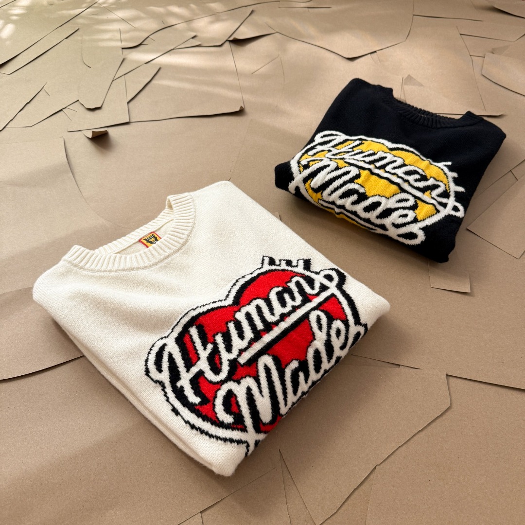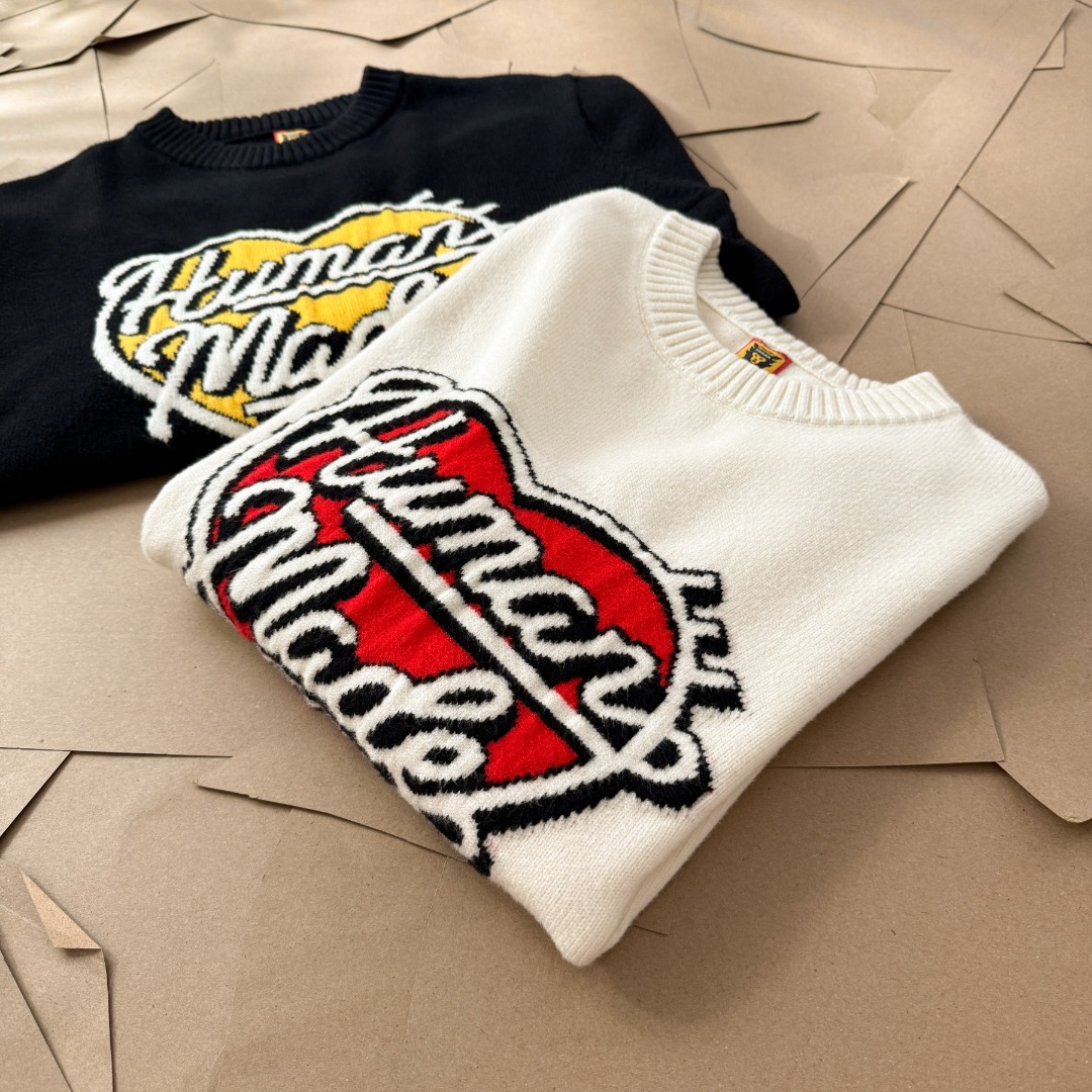 由A BATHING APE首位主理人NIGO打造的另一日本潮流服饰品牌 HUMAN MADE 以Vintage风格的复古感设计而闻名 HUMAN的毛衣款式已经完全拿捏了 攻克最难引塔夏织法 半手工提花的字母及图案以保证不漏线 平整度细节也完美原了 大身与袖子缝合处采用正反双针无缝缝合 纯手工缝制 定织定染的毛线 10 羊毛 30 腈纶 60 棉 三种纱线混纺而成 袖口24股罗纹针收口设计 紧致到位 短款毛衣 搭配图可以看模特图
