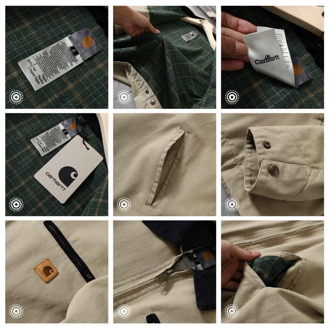 采用水洗做旧效果卡哈特以旧为美夹克版型特点肩部款 衣身短 收腰袖子宽且略长从背面看呈现倒三角形