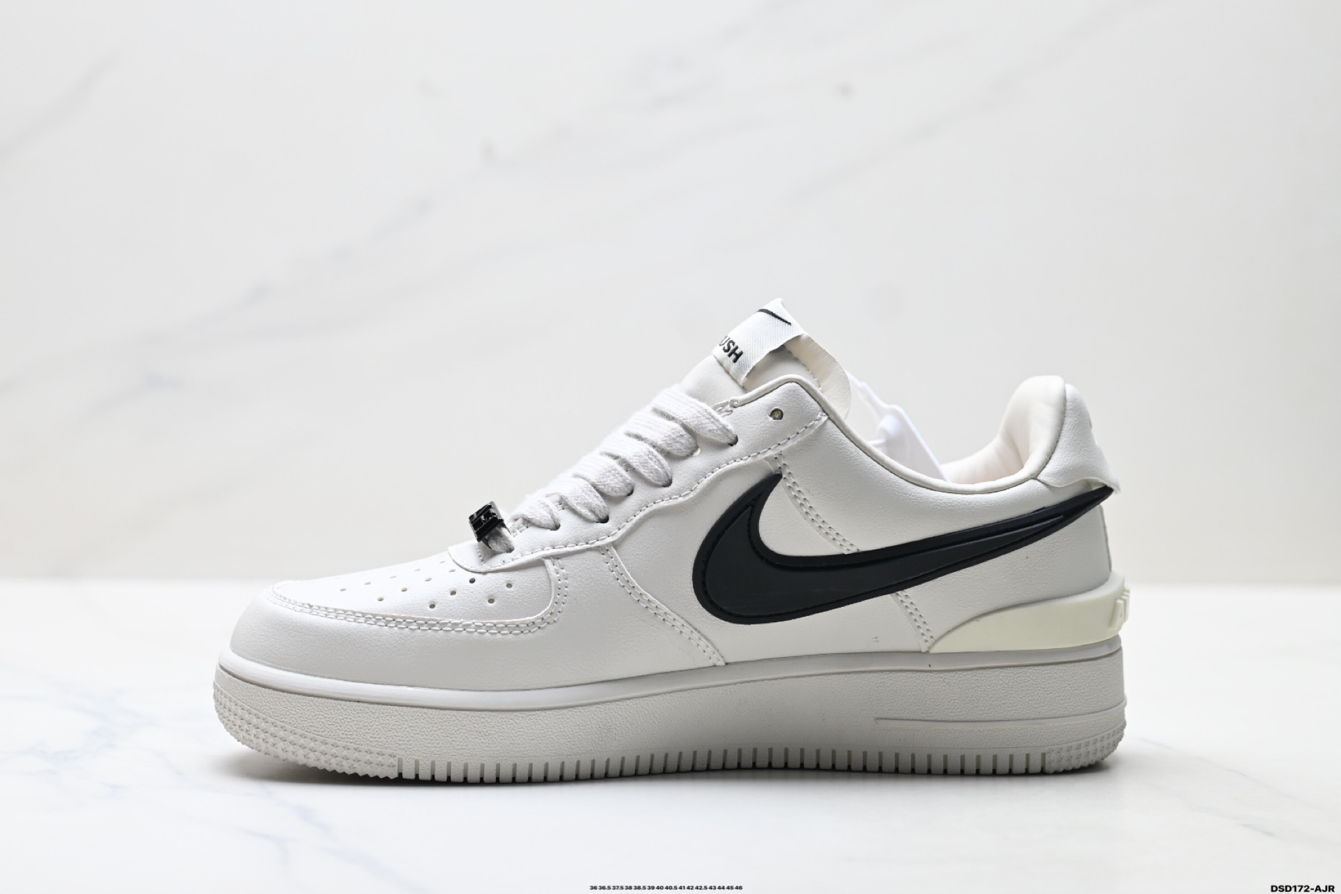 鞋款鞋身以及内衬均采用了纯色皮革打造 标志性的超大Swoosh依旧采用了突出鞋面的造型 鞋舌标签也带有双方Logo 鞋带顶端还带有特殊的鞋带扣设计