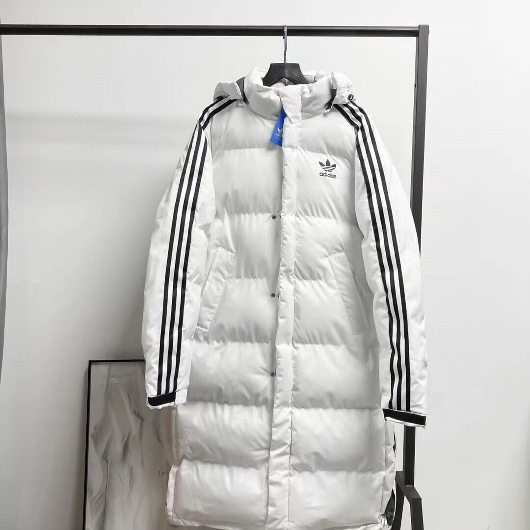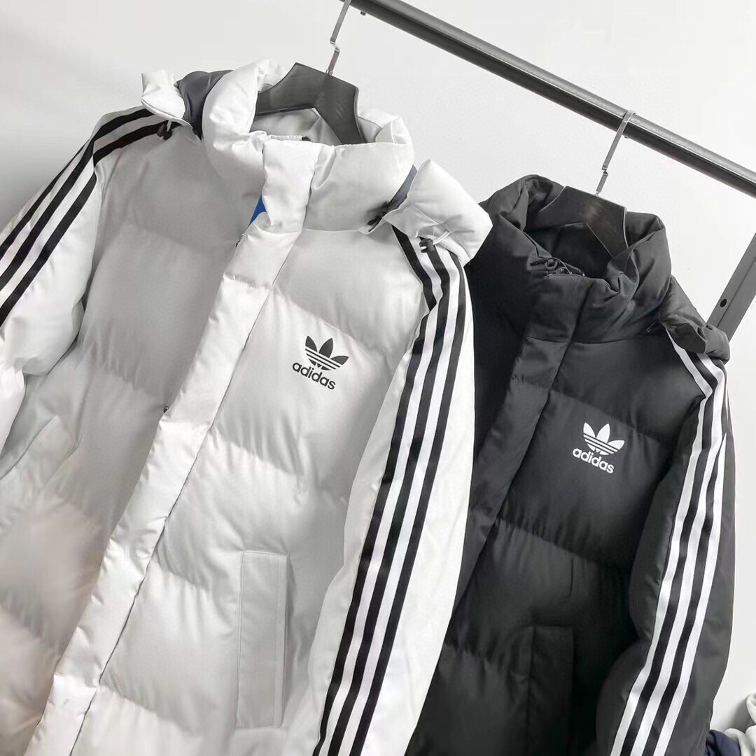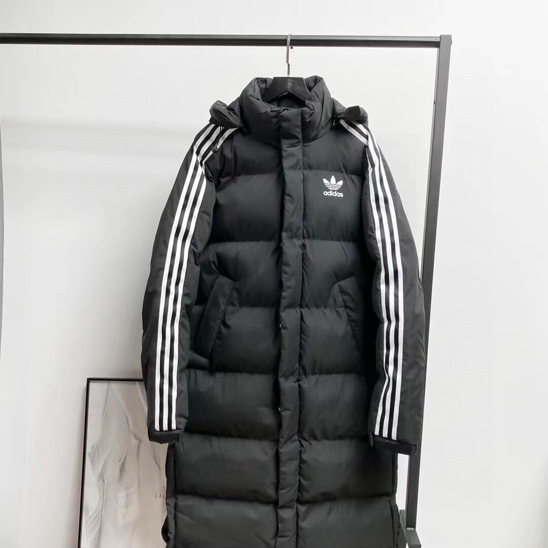 Adidas阿迪达斯三叶草专柜小logo印花三杠连帽加厚羽绒长款棉服暖冬必备推送