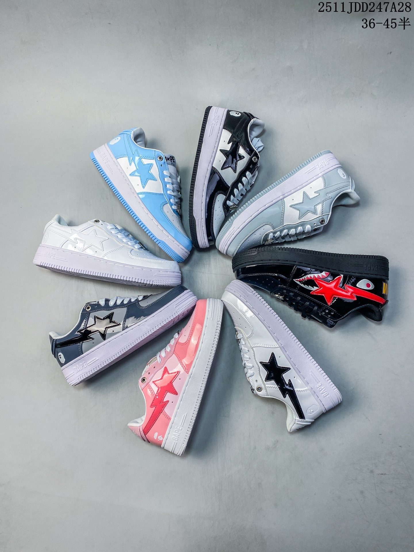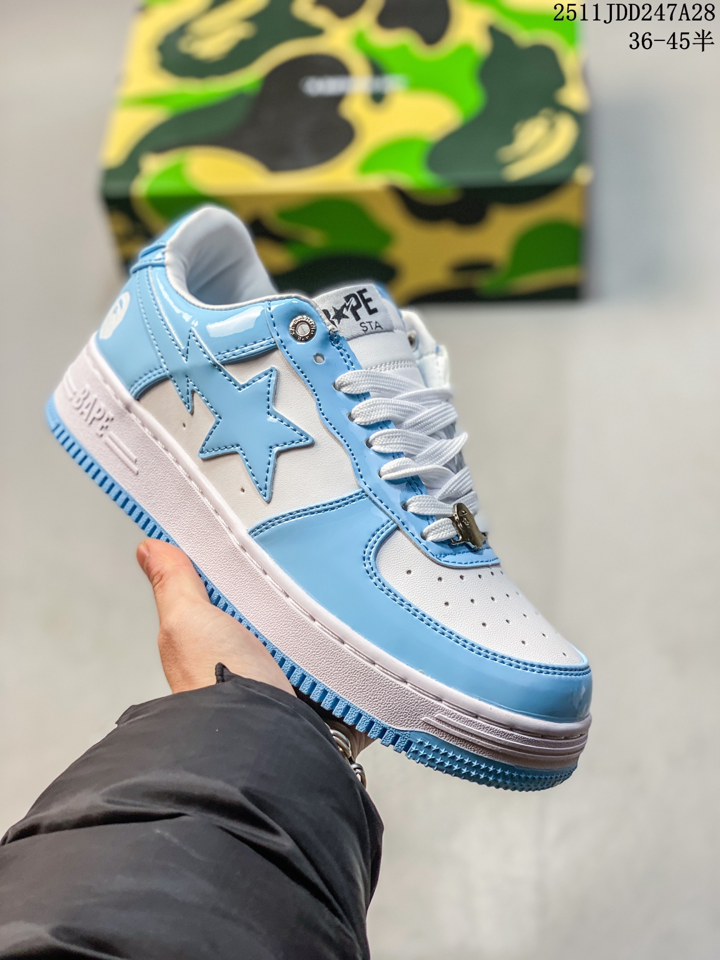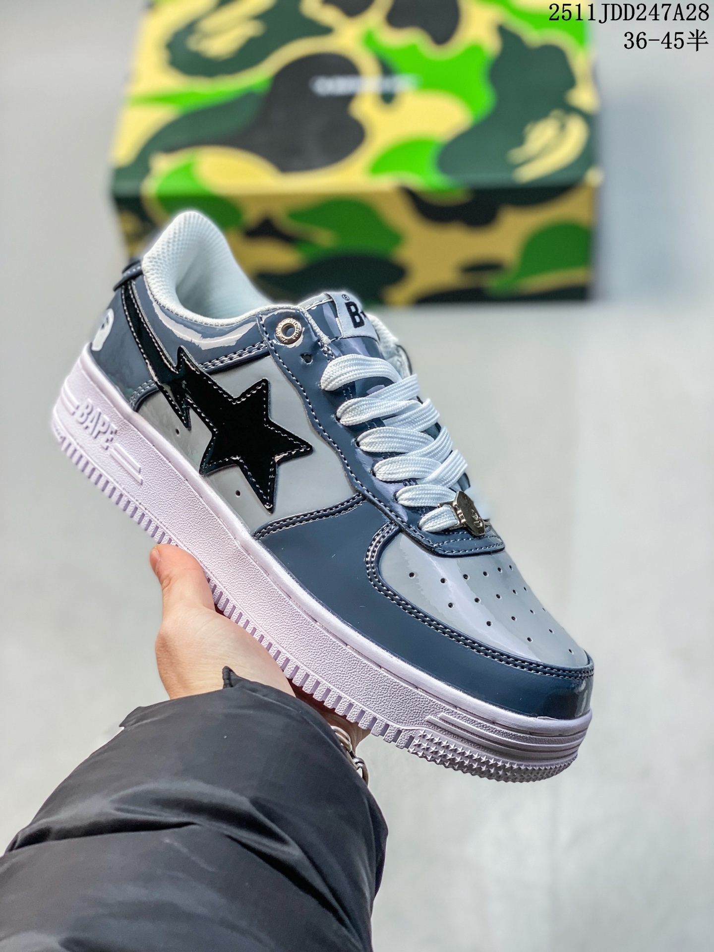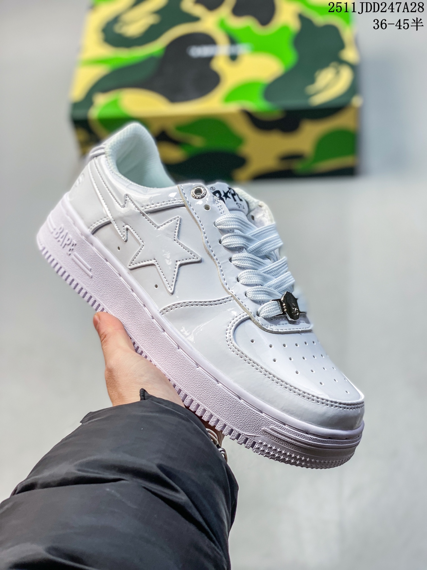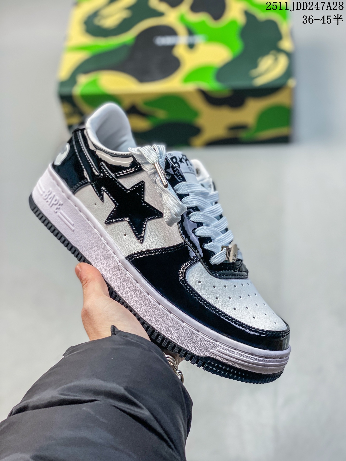 Bape Sta To Low 猿人头经典漆皮低帮运动休闲板鞋 全套原纸板楦头开发 确保原汁原味 市场最完美低趴版型 鞋头弧度高度鞋身弧度 外贸平台指定订单 独家私模磨具冲刀加持 原厂特供皮料光泽色卡零偏差 内里均采用市场最好的超软原厂填充棉 原数据进口机台高频印压LOGO 最高QC检验标准 控制溢胶瑕疵 深浅定位均保持zp一致 中底嵌入Ortholite缓震材质 全套原包装 包含猿人logo