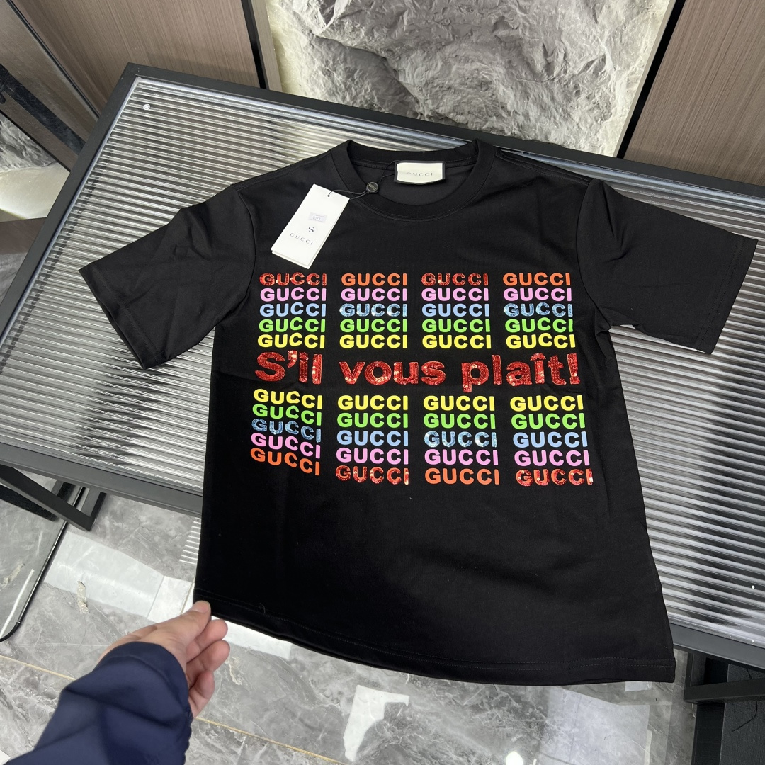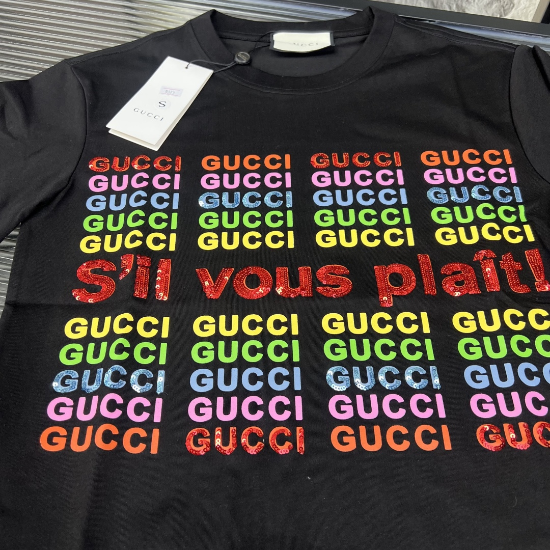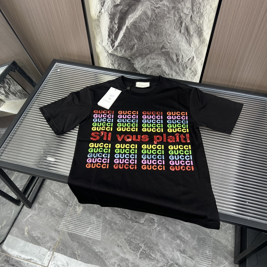 夏季新款 古驰彩色字母亮片短袖三标齐全官网一致