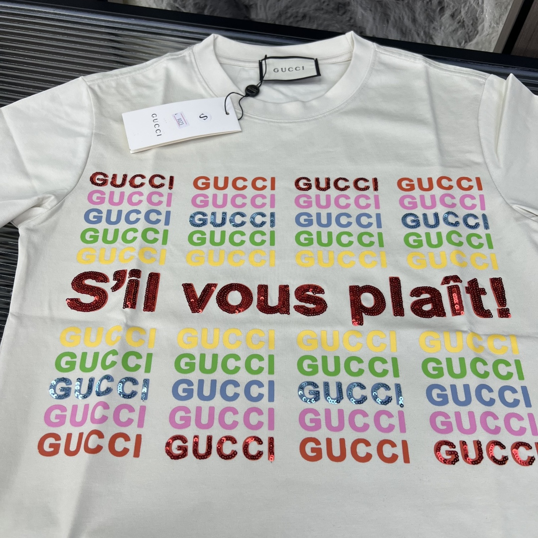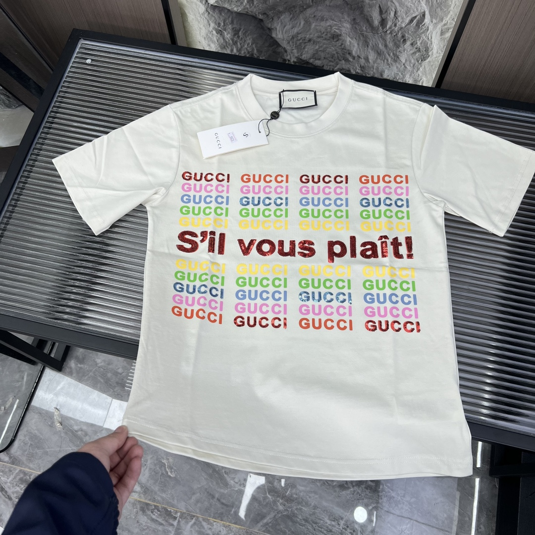 52378326 - 夏季新款 古驰彩色字母亮片短袖三标齐全官网一致 颜色 米白色 576885