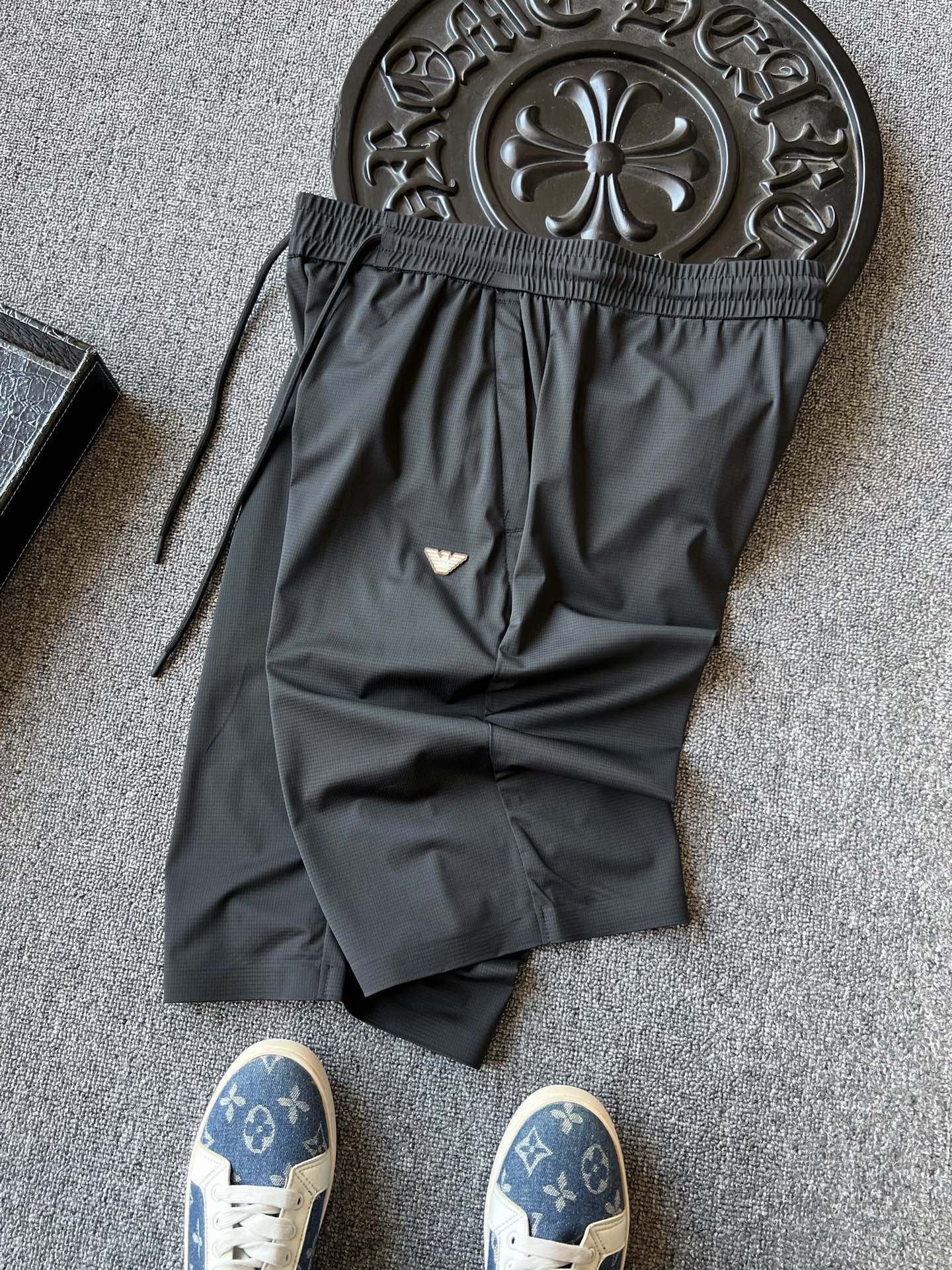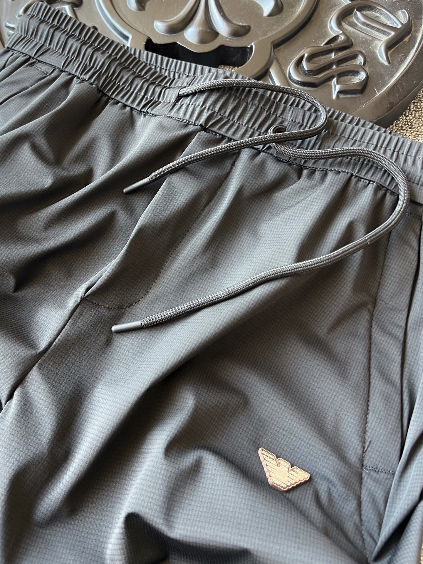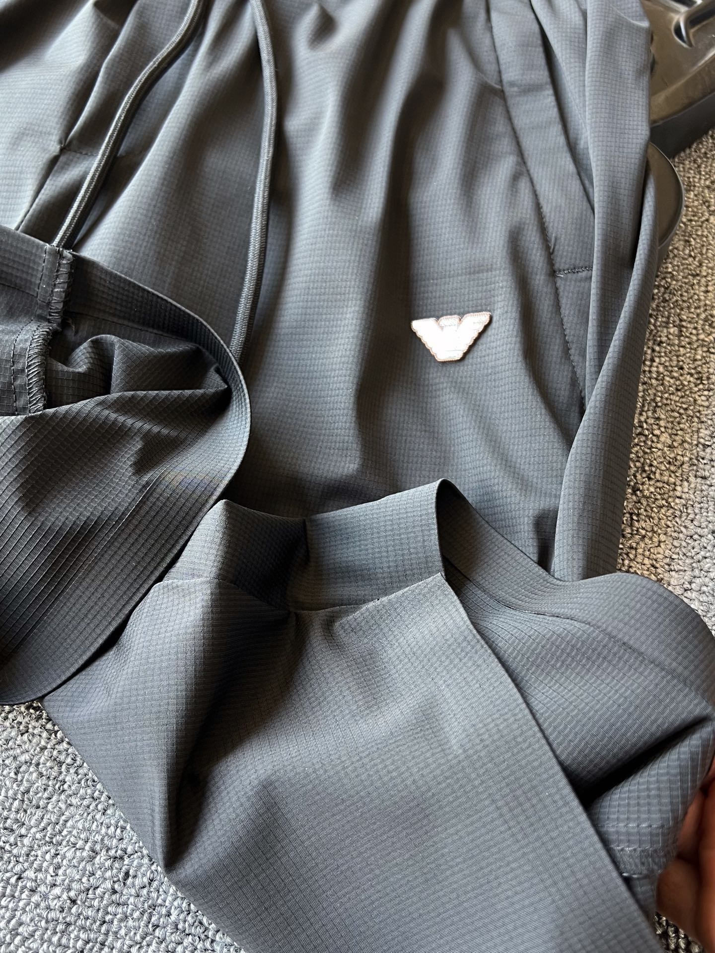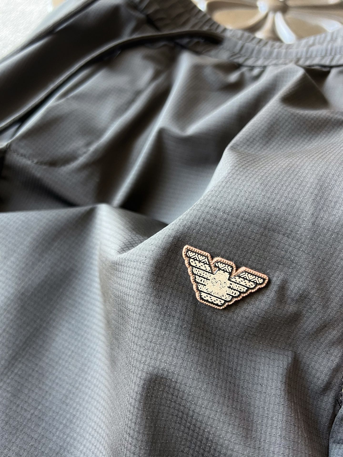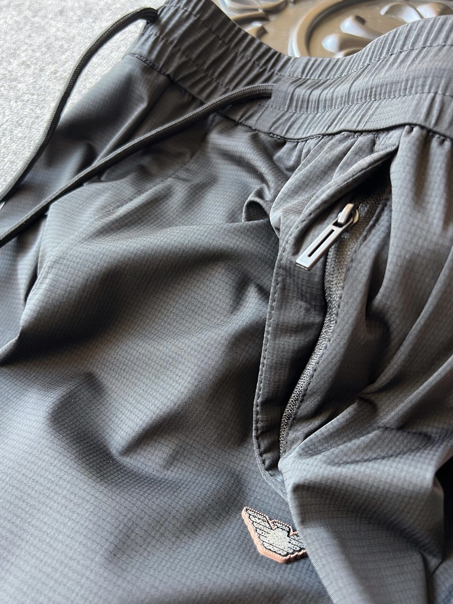 细节细节再细节 裤前浮雕钨钢金属阿玛尼激光logo 轮廓镶嵌棕咖色硅胶环绕 十分精致 双侧以及裤后带暗门襟拉链口袋设计 保证随身携带手机不丢失 裤腿边做了全无痕工艺 极为精湛奢华 内里全包边包条做工 相当精湛