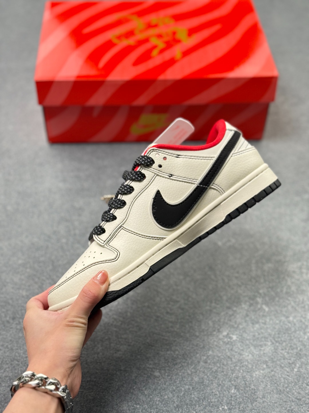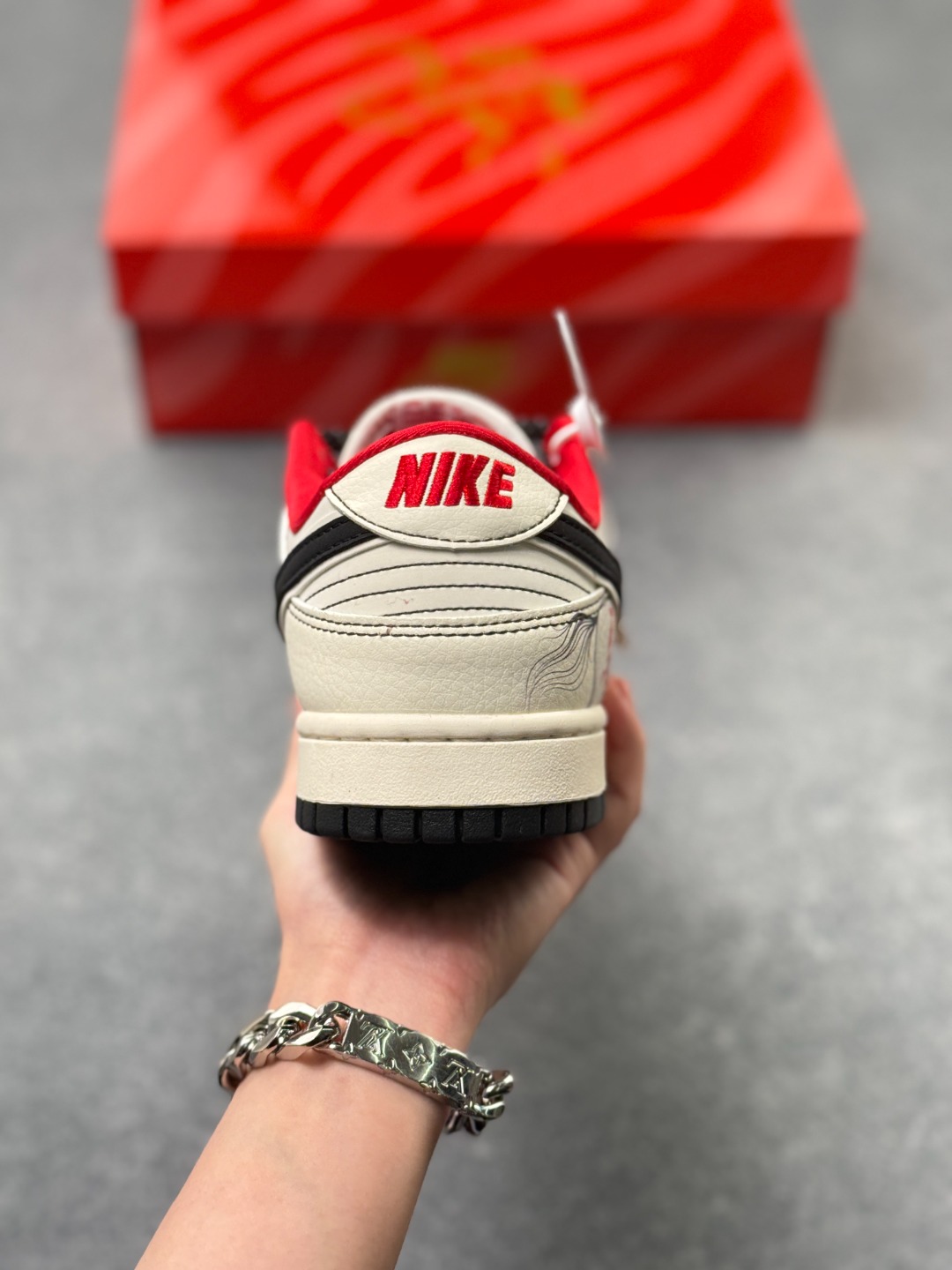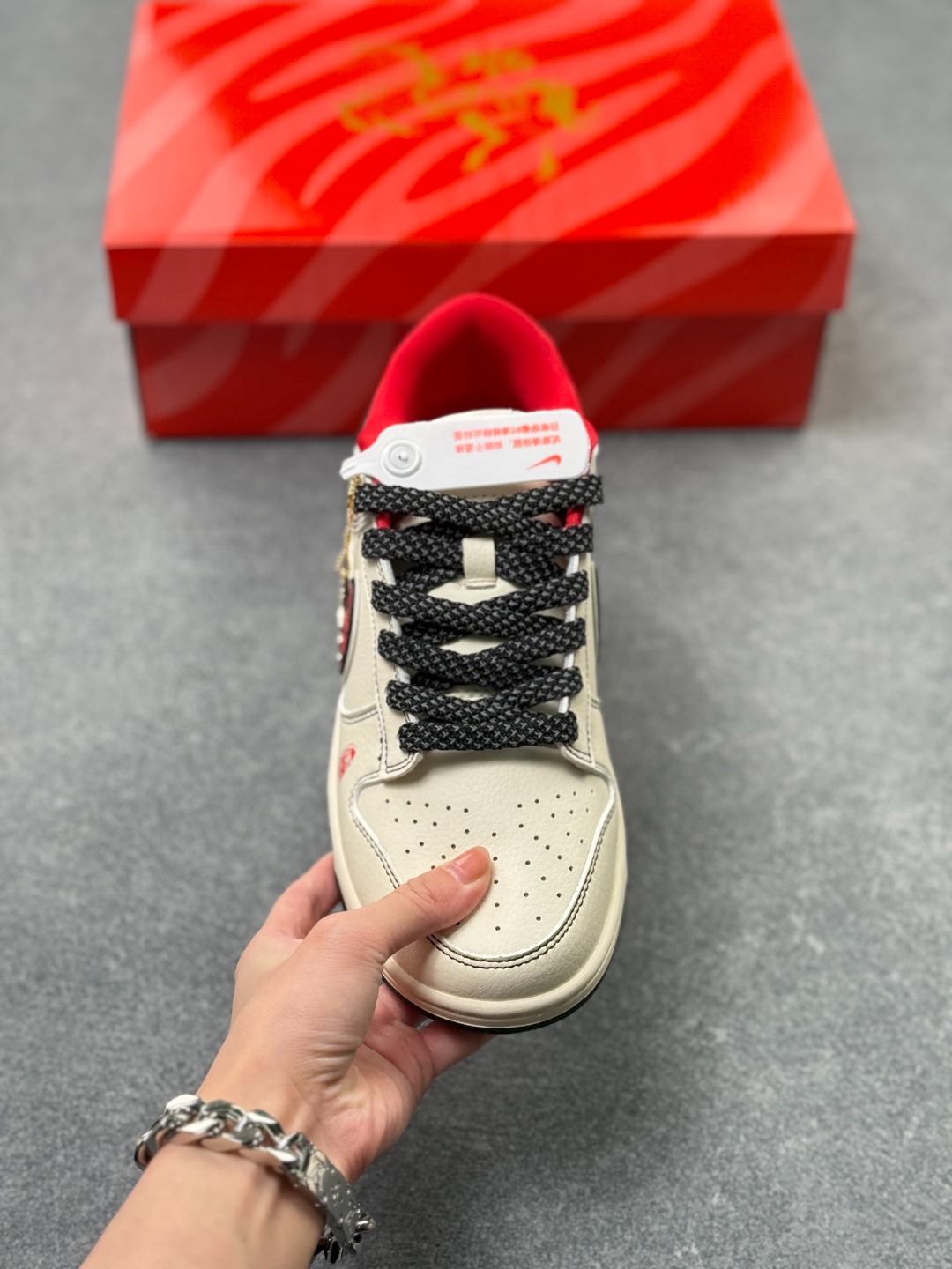 Swoosh 标识融入红黑撞色的中式祥云纹样 鞋身搭配马形线描图案与 丙午 纪年印章 采用白 红 黑为主调的配色 纯白基底搭配红黑祥云 Swoosh 线描马形图案与波浪纹理提升了鞋款的层次感 丙午 印章强化了生肖主题辨识度 整体风格简约且兼具中式文化属性 祥云纹样 马形线描采用精细印花工艺呈现 丙午 纪年印章以红色印花点缀 红黑撞色鞋底与红色鞋口形成视觉呼应 体现了文化风格下的细节精致度