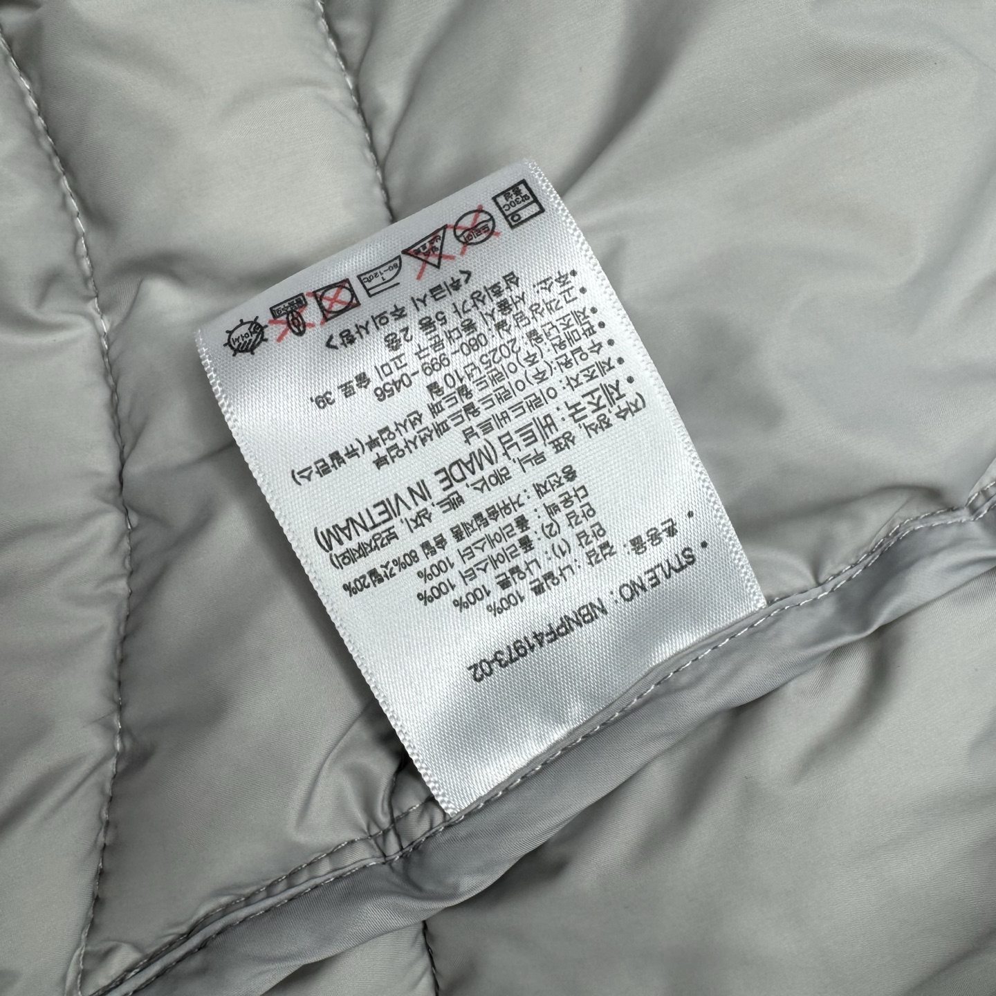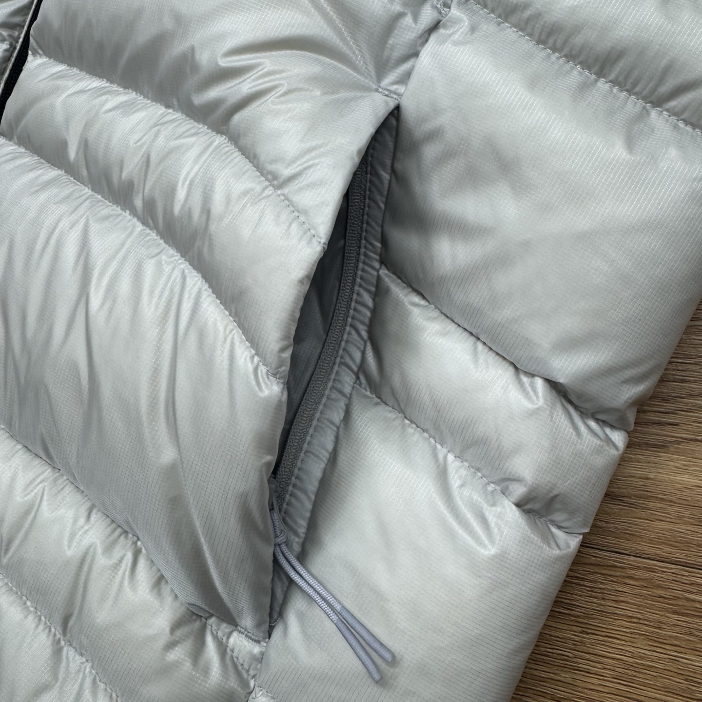 填充纯白鹅绒 面料定制定染7D细格纹 银青灰金属光泽面料 软乎轻薄 独特不规则纹路排骨版珩线 特别有辨识度