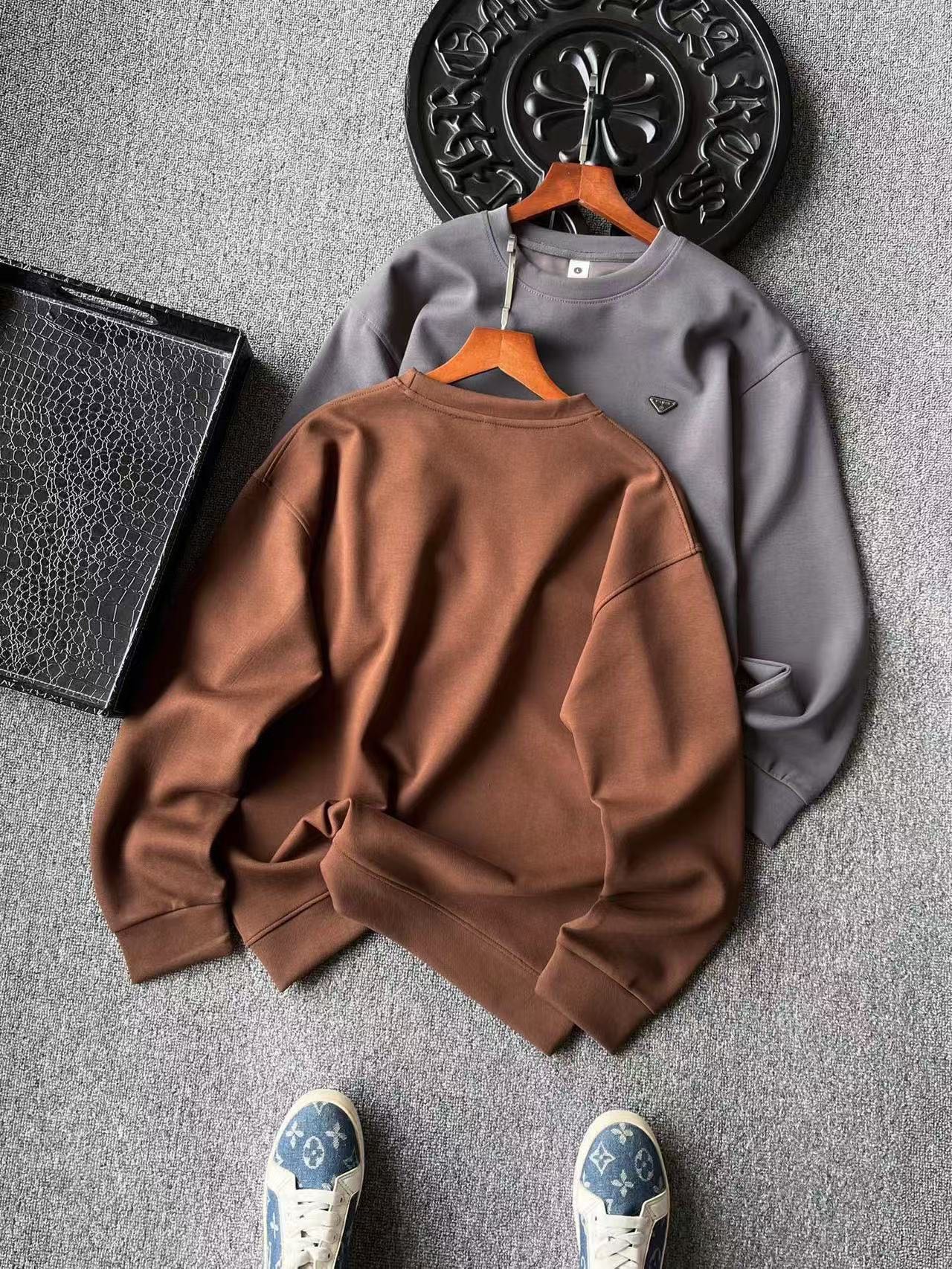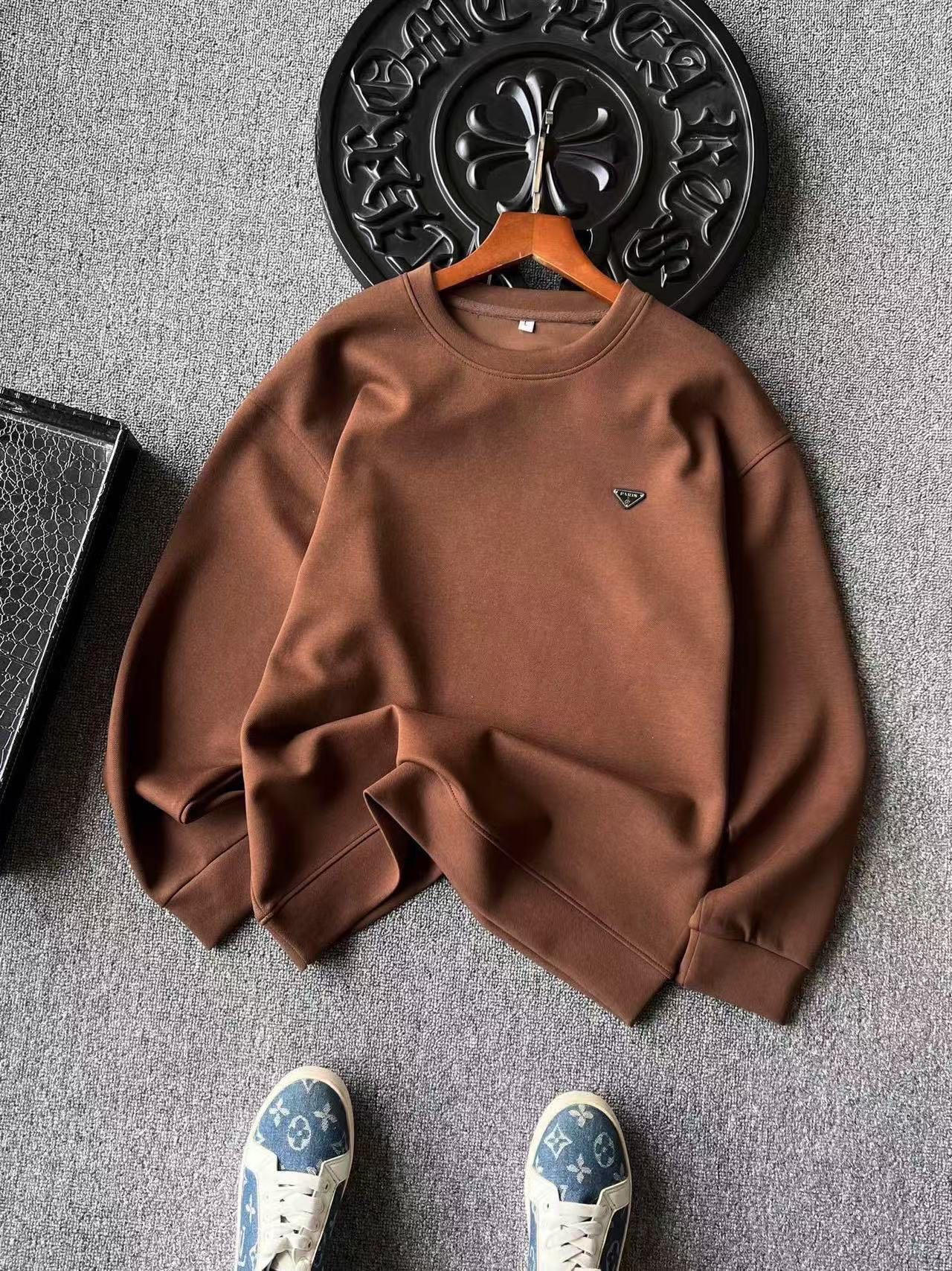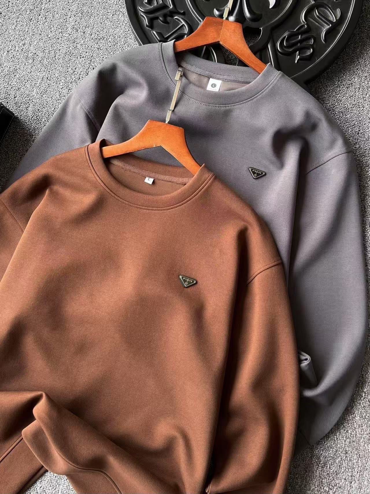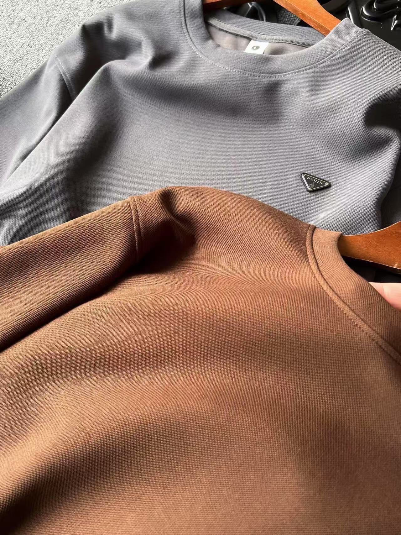 细节细节再细节 Prada家公文包系专柜新品高奢圆领卫衣 全身精致简约 纯正水泥灰以及摩卡色 胸前钨钢金属亚格力Paris巴黎小仆人公文包限定标识 轮廓镶嵌立体硅胶包边 十分精细 所有拼接接缝处全部做了双针压线 精湛做工天花板