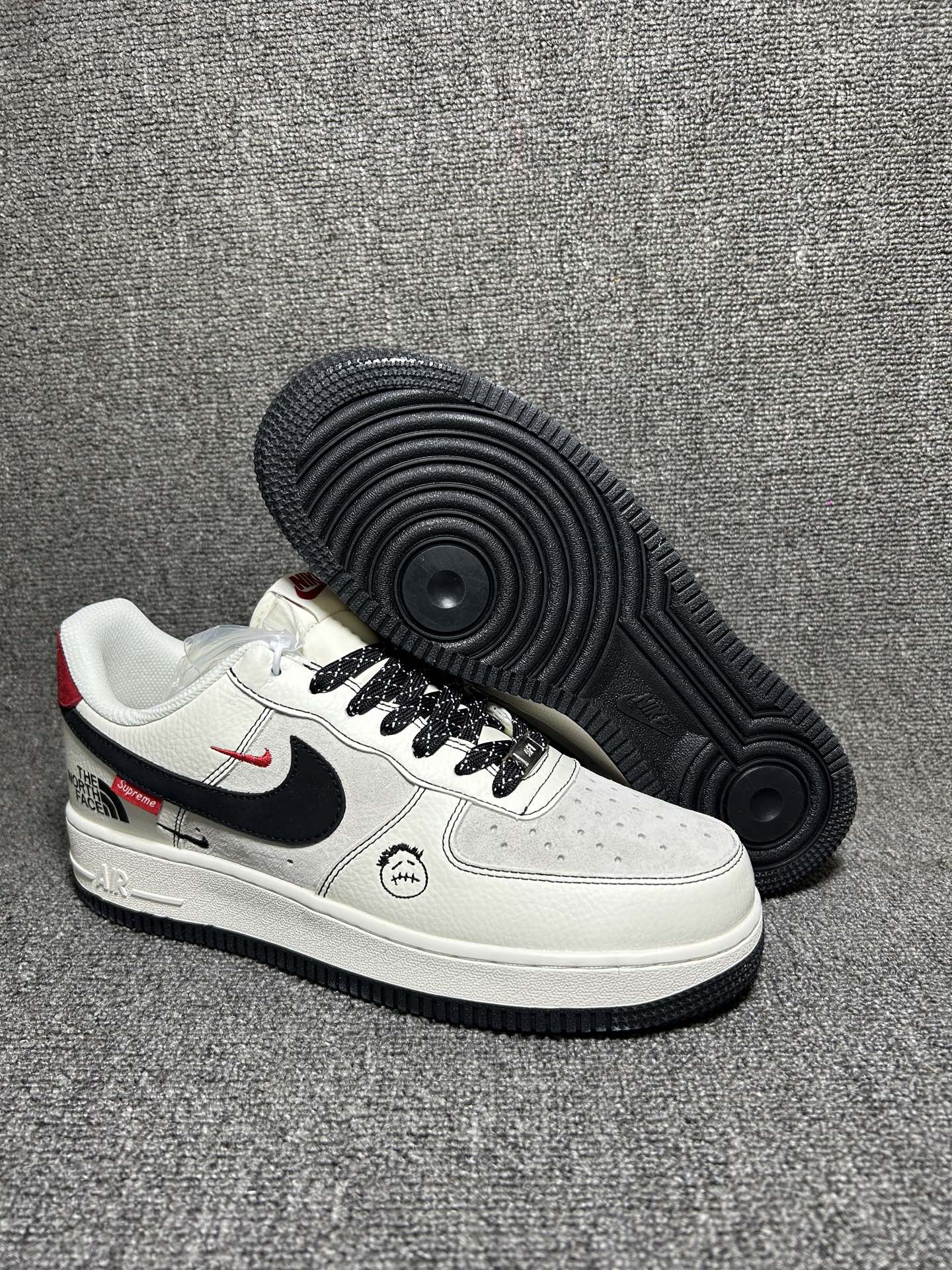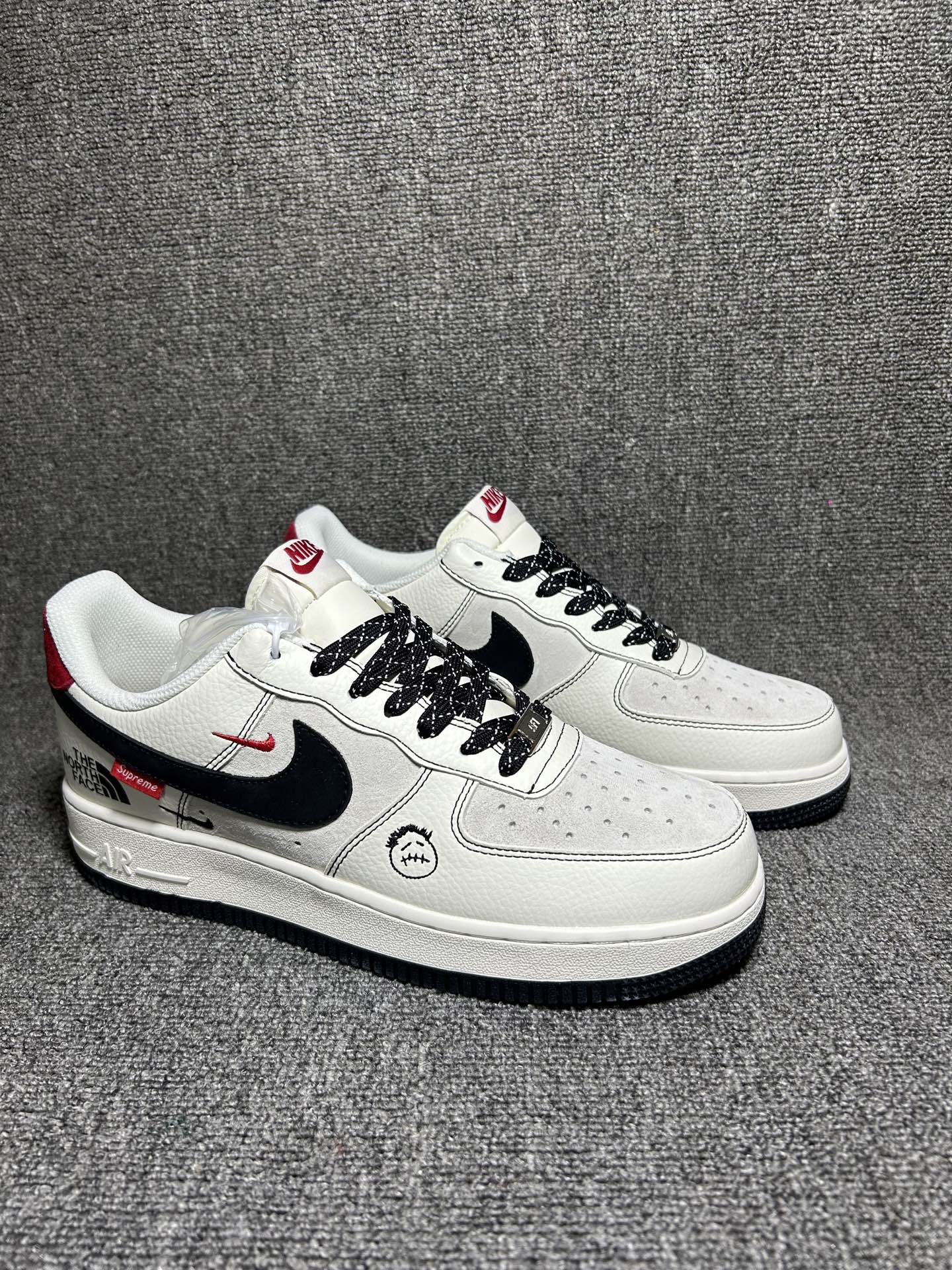 AF1三方联名款潮人必入 Supreme 北面联名设计超吸睛 黑白红撞色搭配双勾细节 鞋身品牌标识彰显个性 经典Air气垫加持 脚感软弹不闷脚 日常搭配卫衣 工装裤都超炸街 妥妥的街头潮流天花板 谁穿谁帅