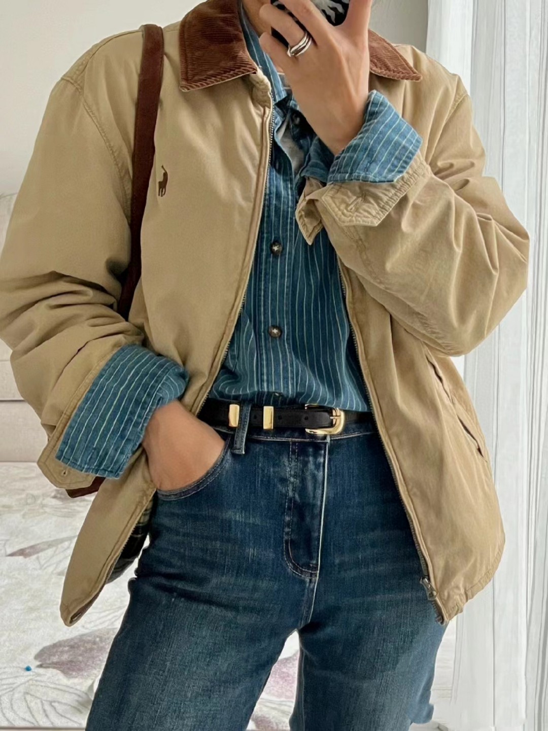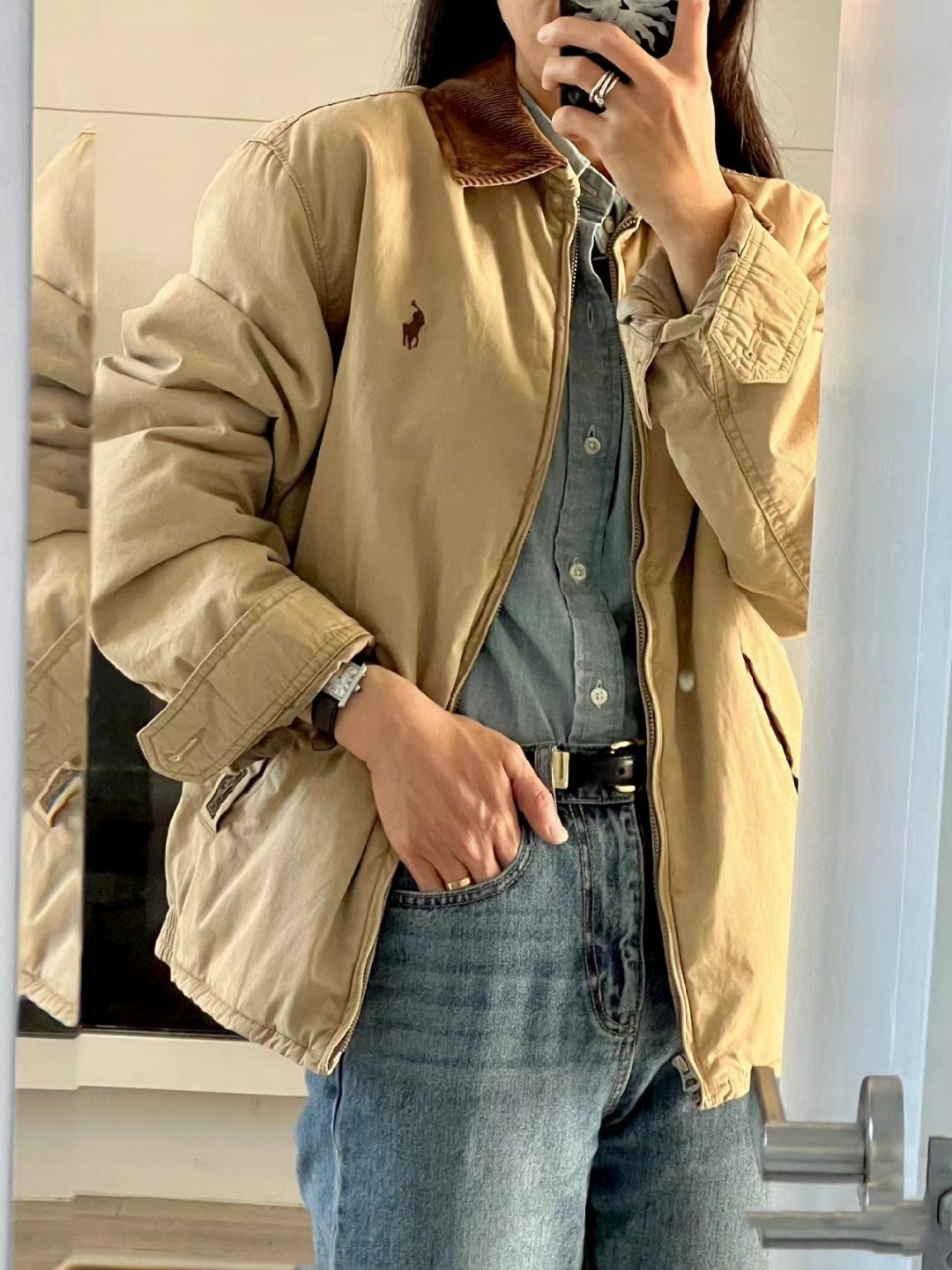 这件Ralph Lauren中古夹克外套秋冬季节使用率简直不要太高 灯芯绒领就很美式复古内搭牛仔衬衫就是去年很出圈的断背山穿搭 内里条纹格子搭配 温度与潮流的完美结合 这也是一个情侣款男生女生都能驾驭永远的经典 这个面料也真的和其他的不一样新款没有老款那个硬邦邦我觉得更好穿啦 100 纯棉这个硬度刚刚好不是那种硬邦邦的 这就是今年的升级反而我觉得更加好穿了 胸前的刺绣都是有原版数据的德国阿曼刺绣纤维刺绣工艺非常讲究 采用日本田岛机器保证刺绣精致立体也就是我说的和市面上的不同 关于做工版型版型属于宽松版男生女生都可以 外套可能穿的时间更久马上就是中秋十月一出行 复古永不过时