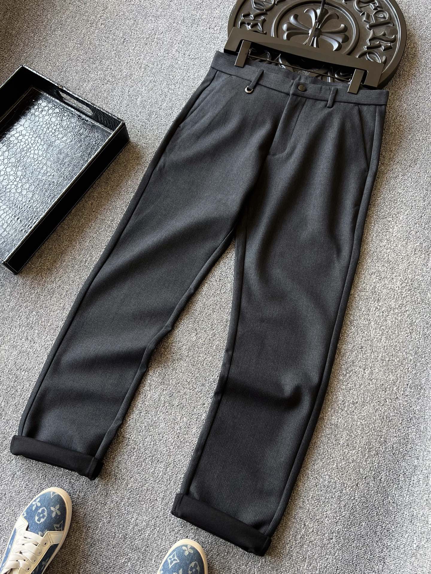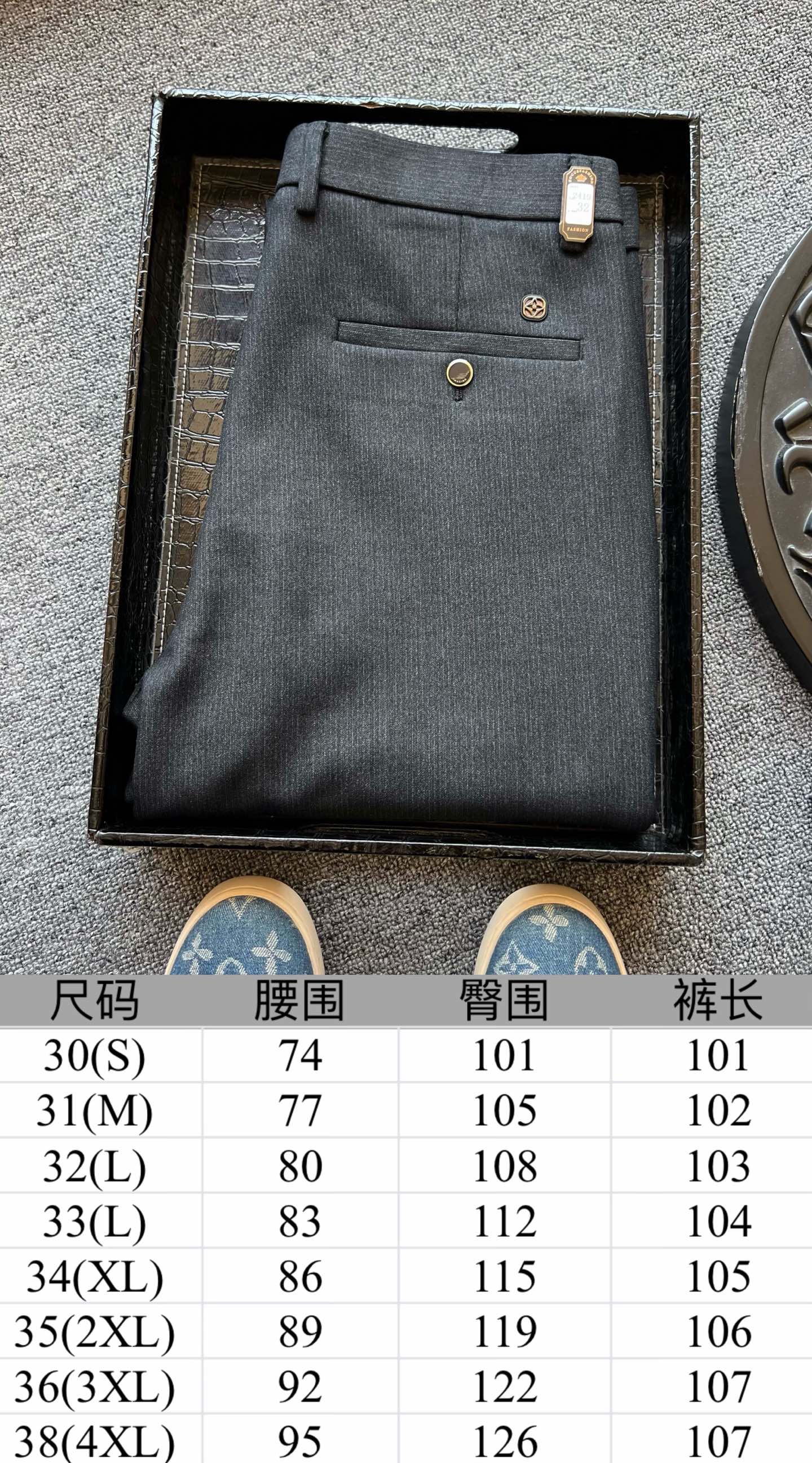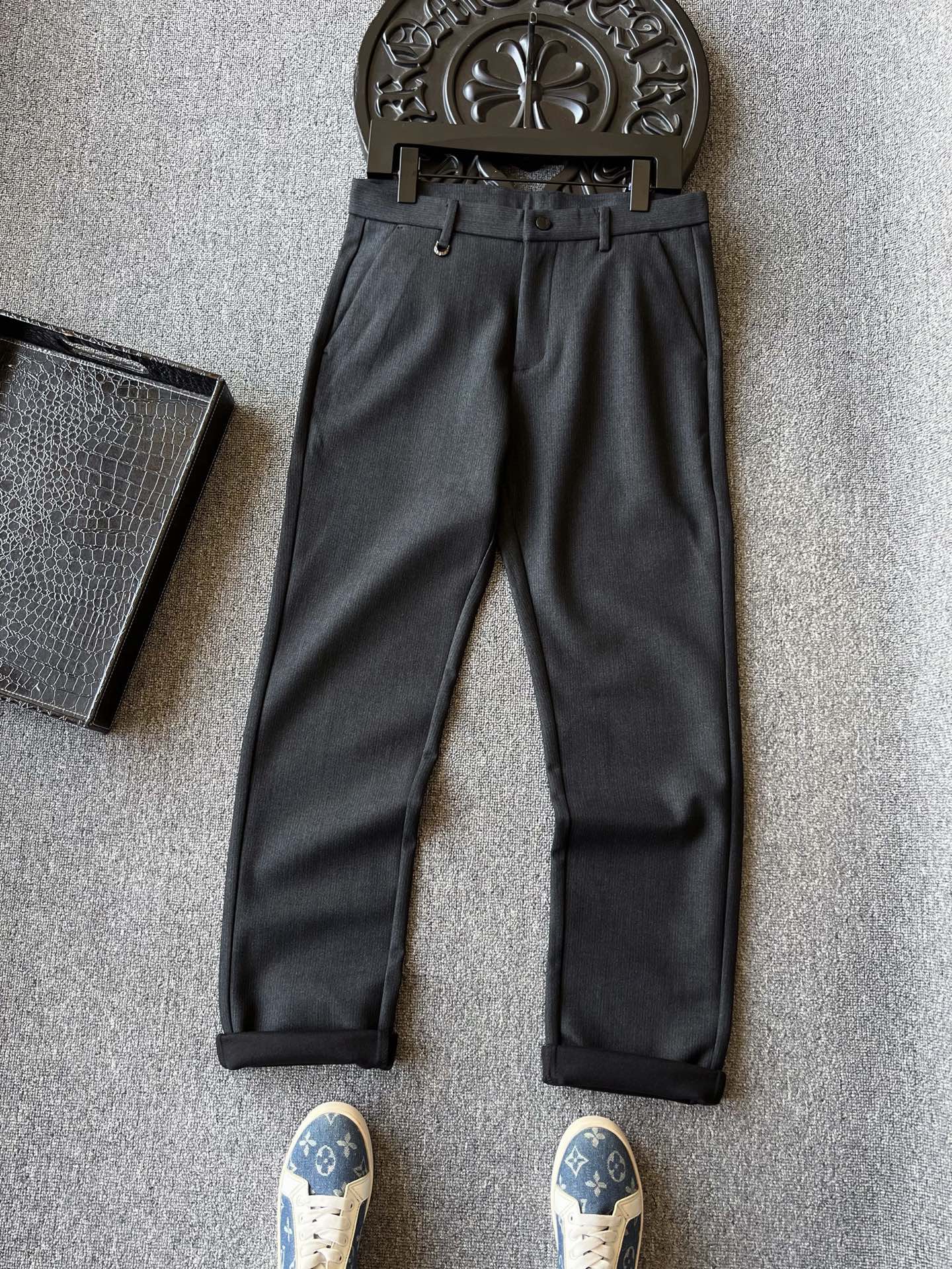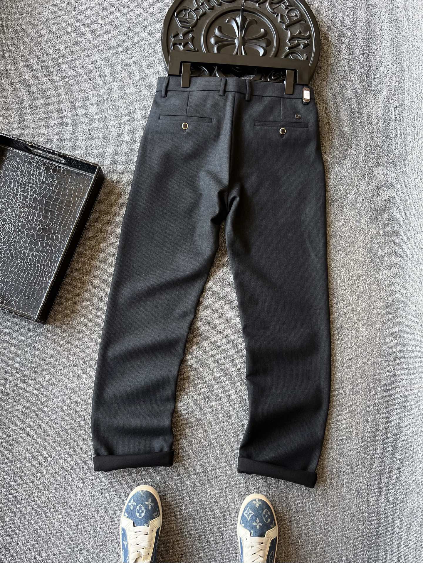 细节细节再细节 LV家今年商场新品休闲长裤 高级黑灰特调配色 百搭又显档次感 裤前带金属钥匙袢 后腰口LV四叶草老花浮雕金属标 轮廓镶嵌一圈硅胶环绕 亚格力金属组合高定双纽扣细节 内里全包边双包条精湛做工 专柜标准
