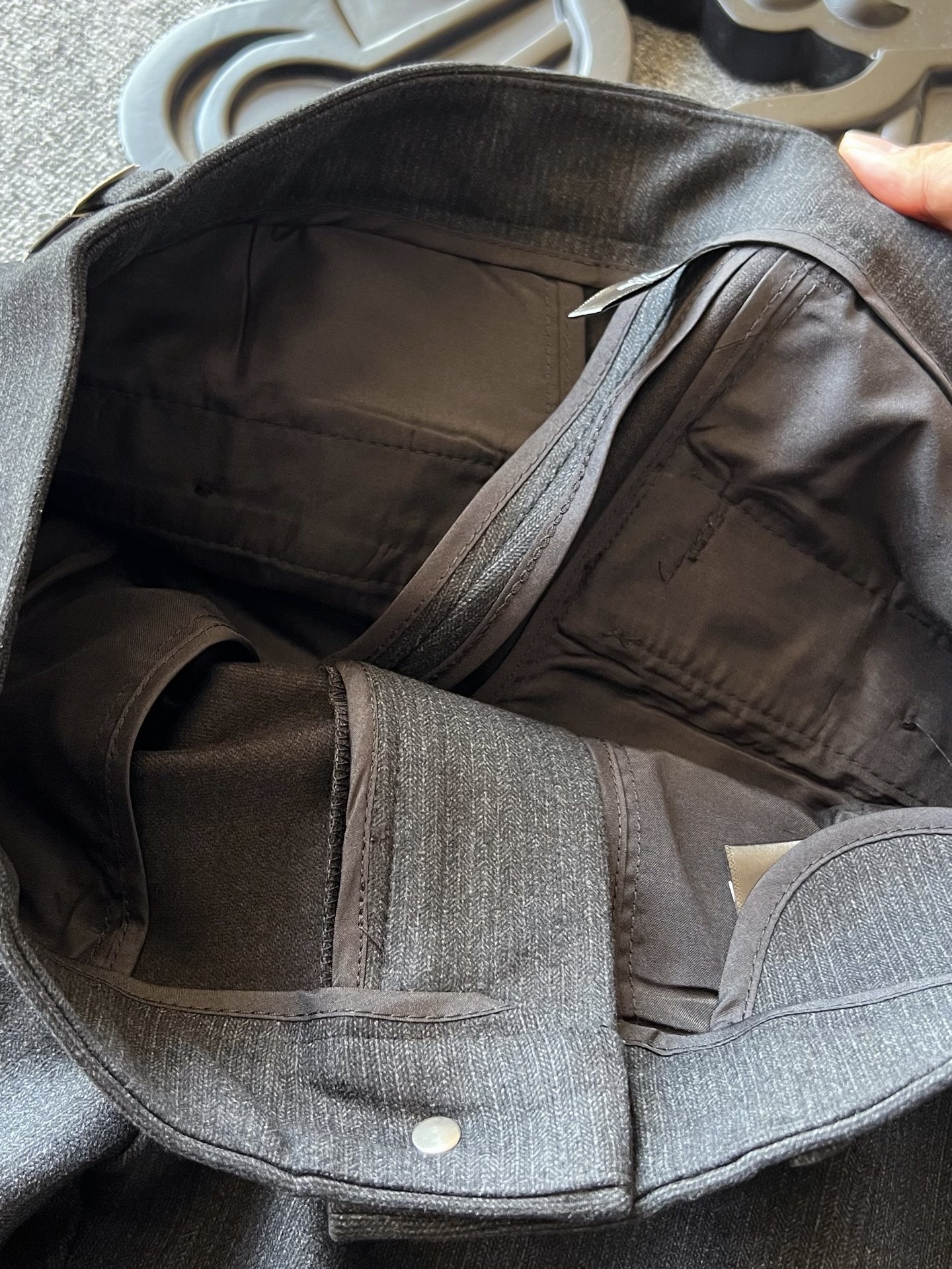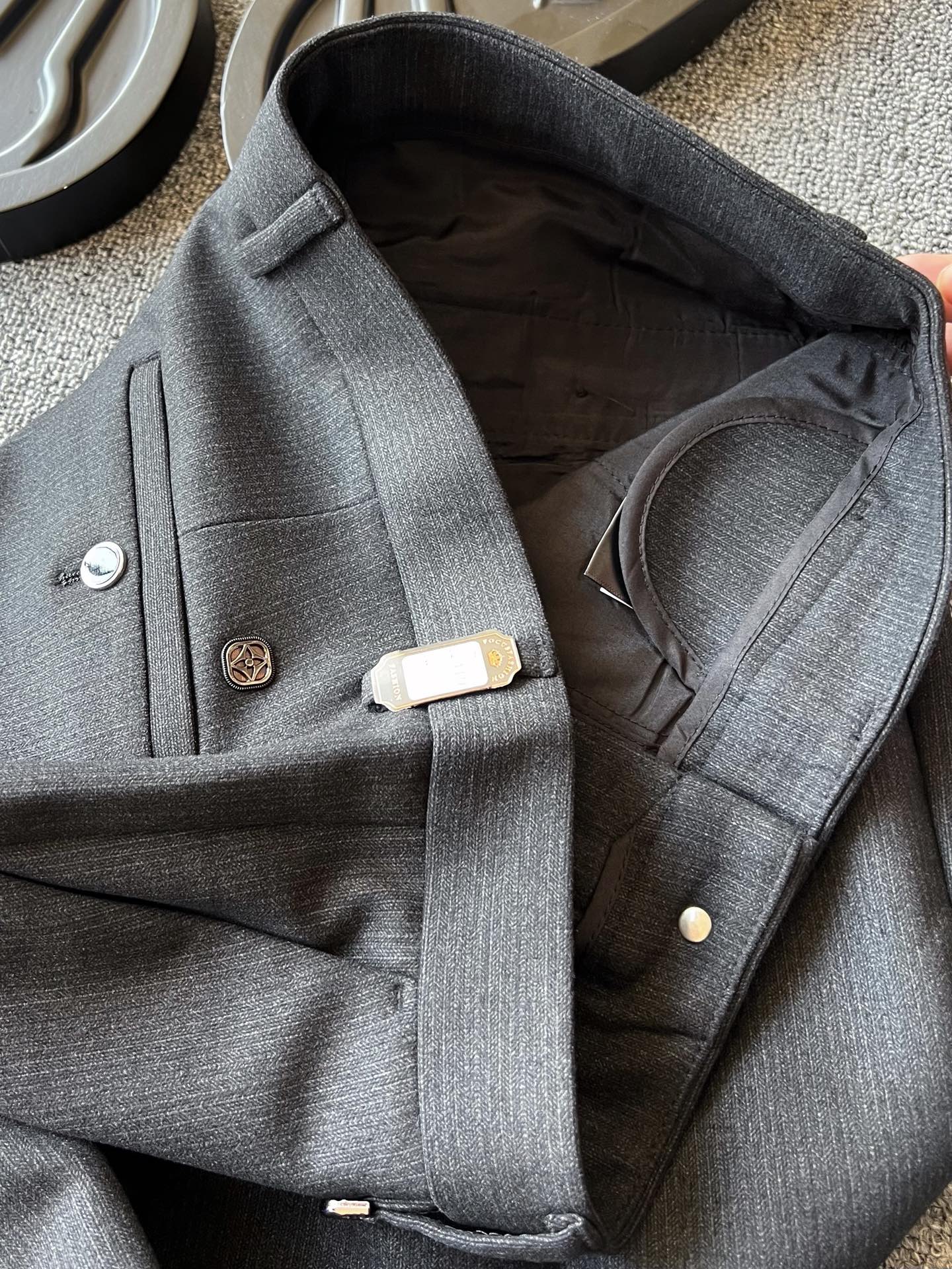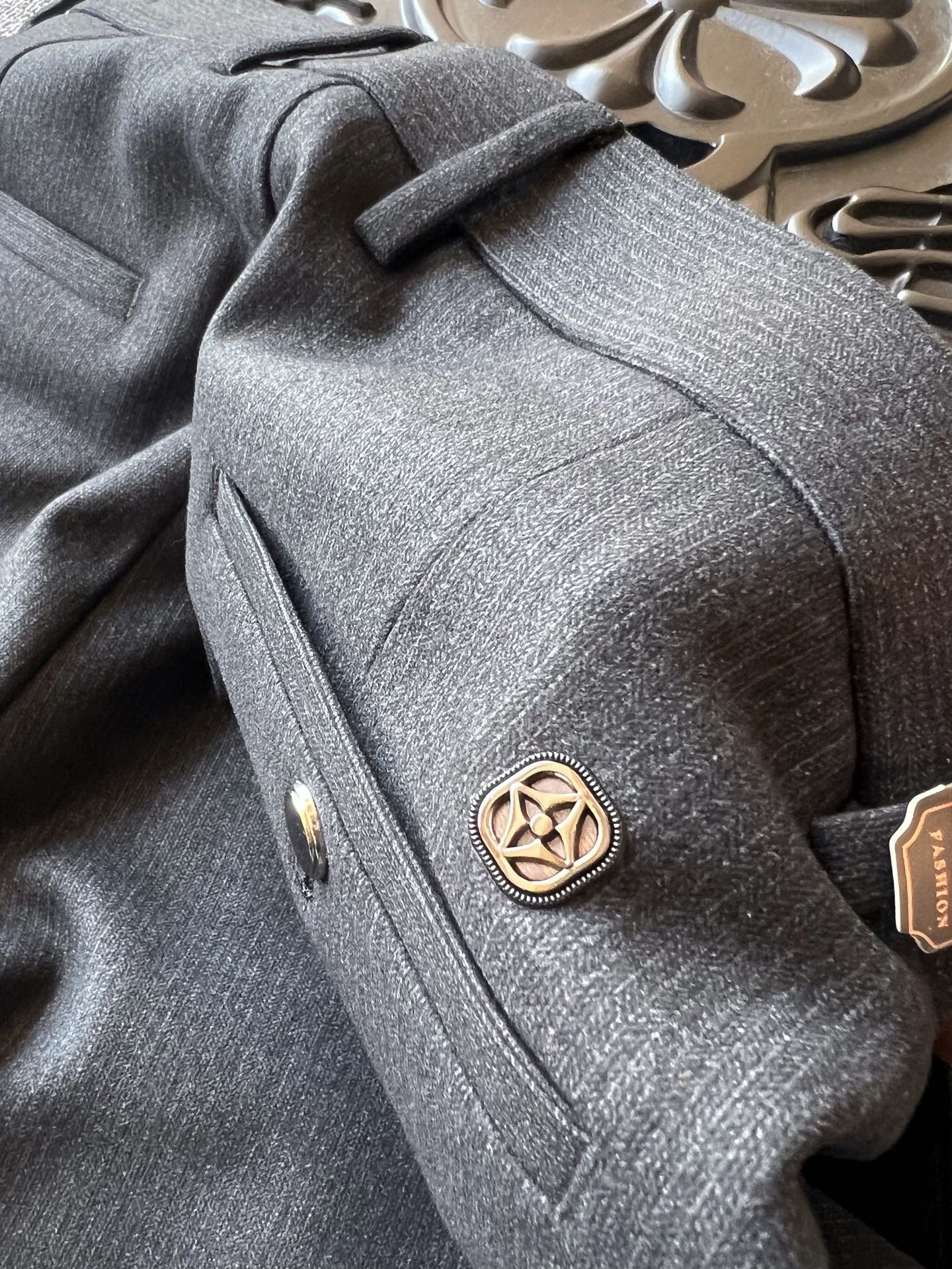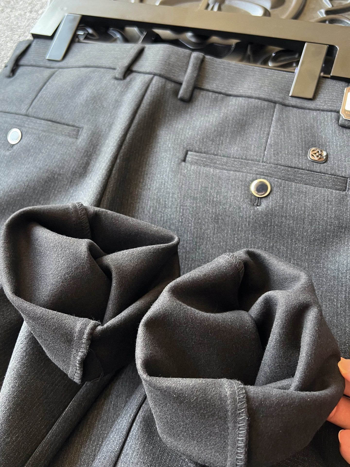 细节细节再细节 LV家今年商场新品休闲长裤 高级黑灰特调配色 百搭又显档次感 裤前带金属钥匙袢 后腰口LV四叶草老花浮雕金属标 轮廓镶嵌一圈硅胶环绕 亚格力金属组合高定双纽扣细节 内里全包边双包条精湛做工 专柜标准
