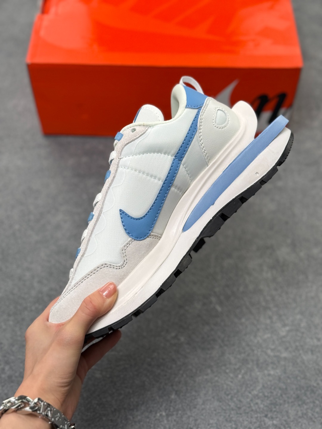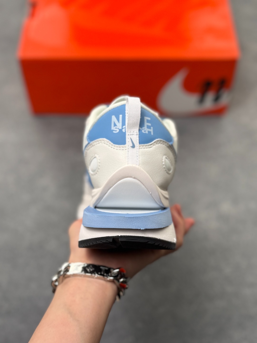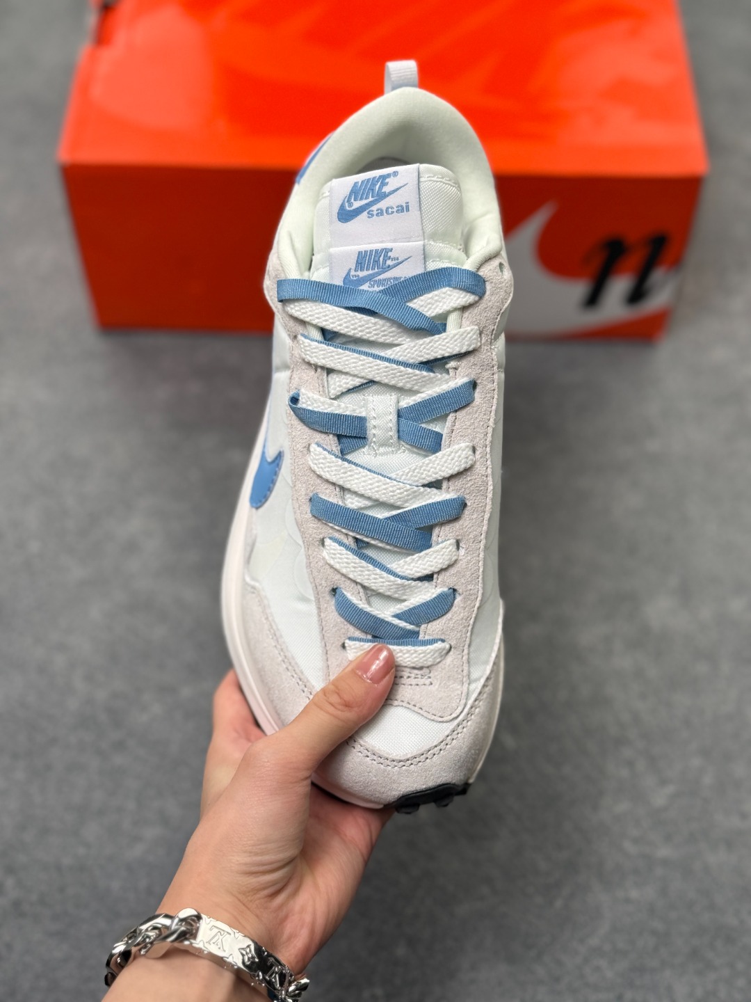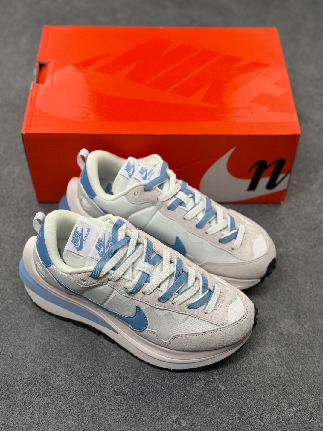 解构手法 重叠Swoosh 双重鞋舌 鞋带以及后跟SACAI字体都悉数保留