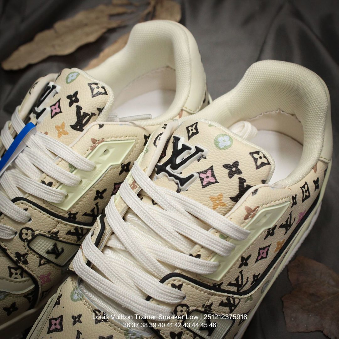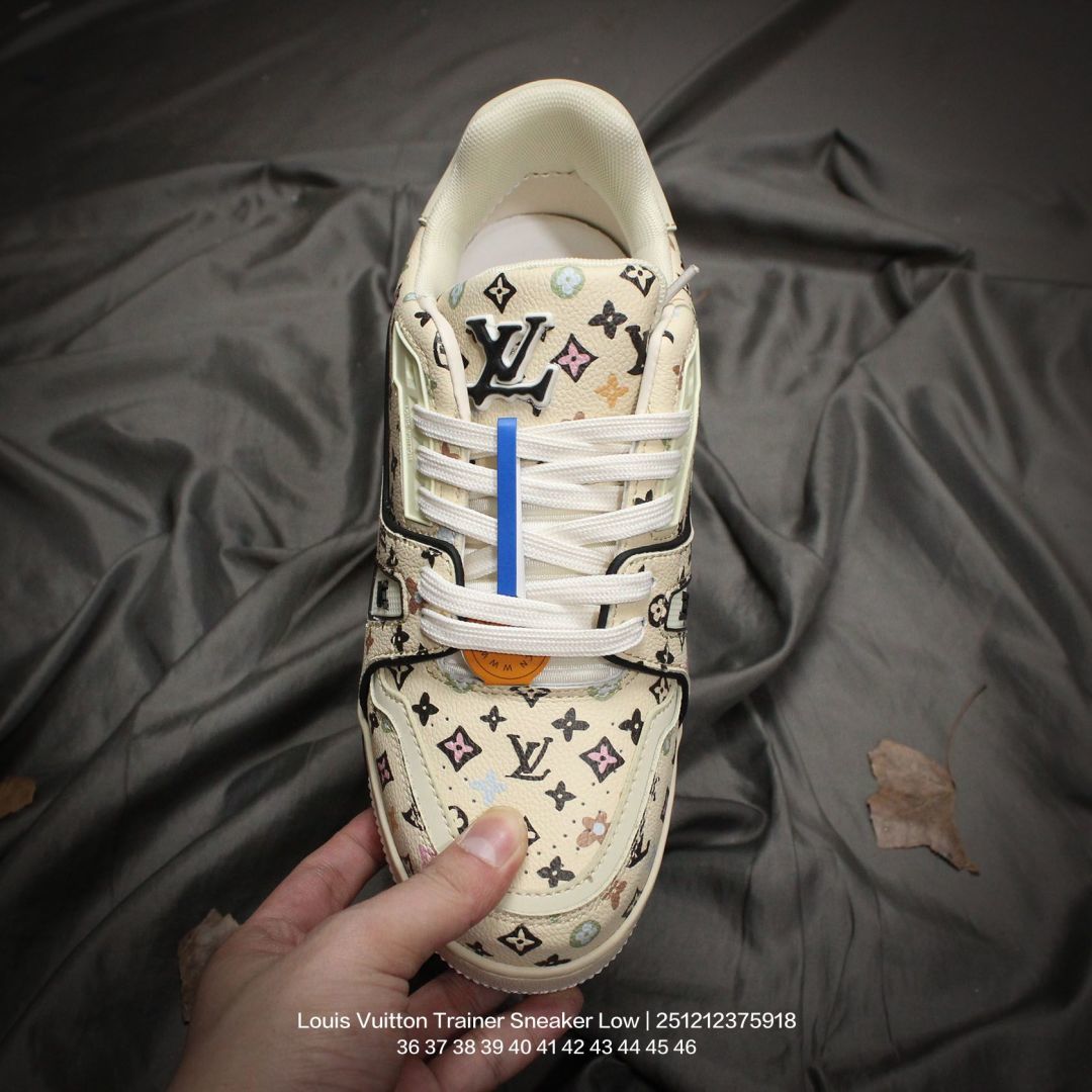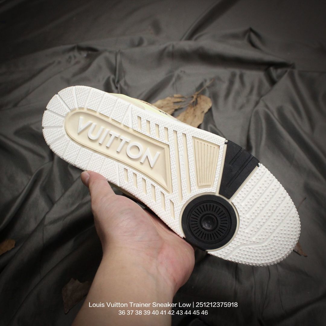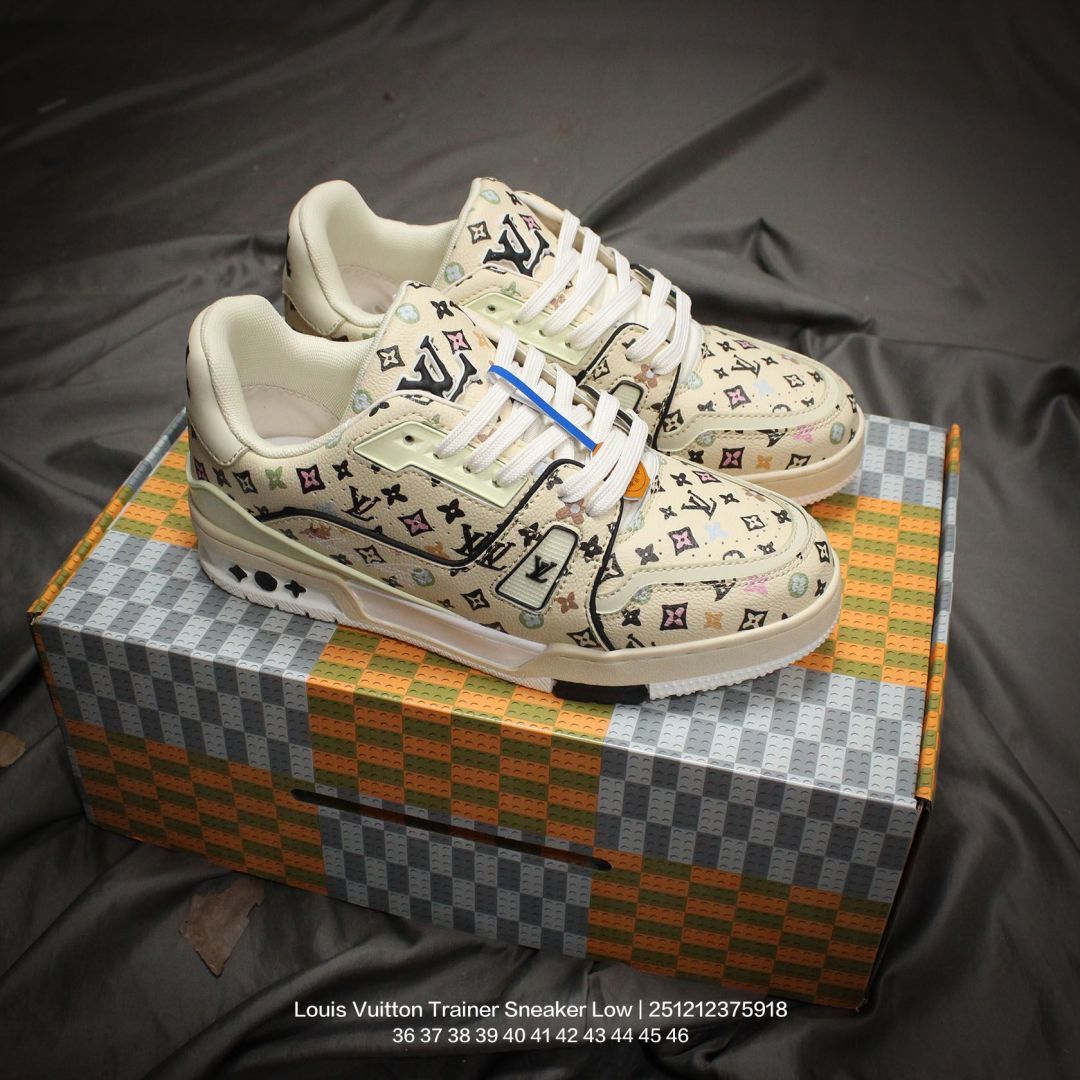 Louis Vuitton 路易威登 男女鞋配置厚实抽屉礼品鞋盒 采用荔枝纹二层牛剖革组合粒面牛剖革鞋面材质 鞋垫嵌入软脚感EVA物料 外置TPR光泽隔色鞋底法国巴黎百年奢侈品牌LV路易威登Louis Vuitton Trainer Sneaker Low 运动系列低帮复古百搭休闲运动文化篮球板鞋
