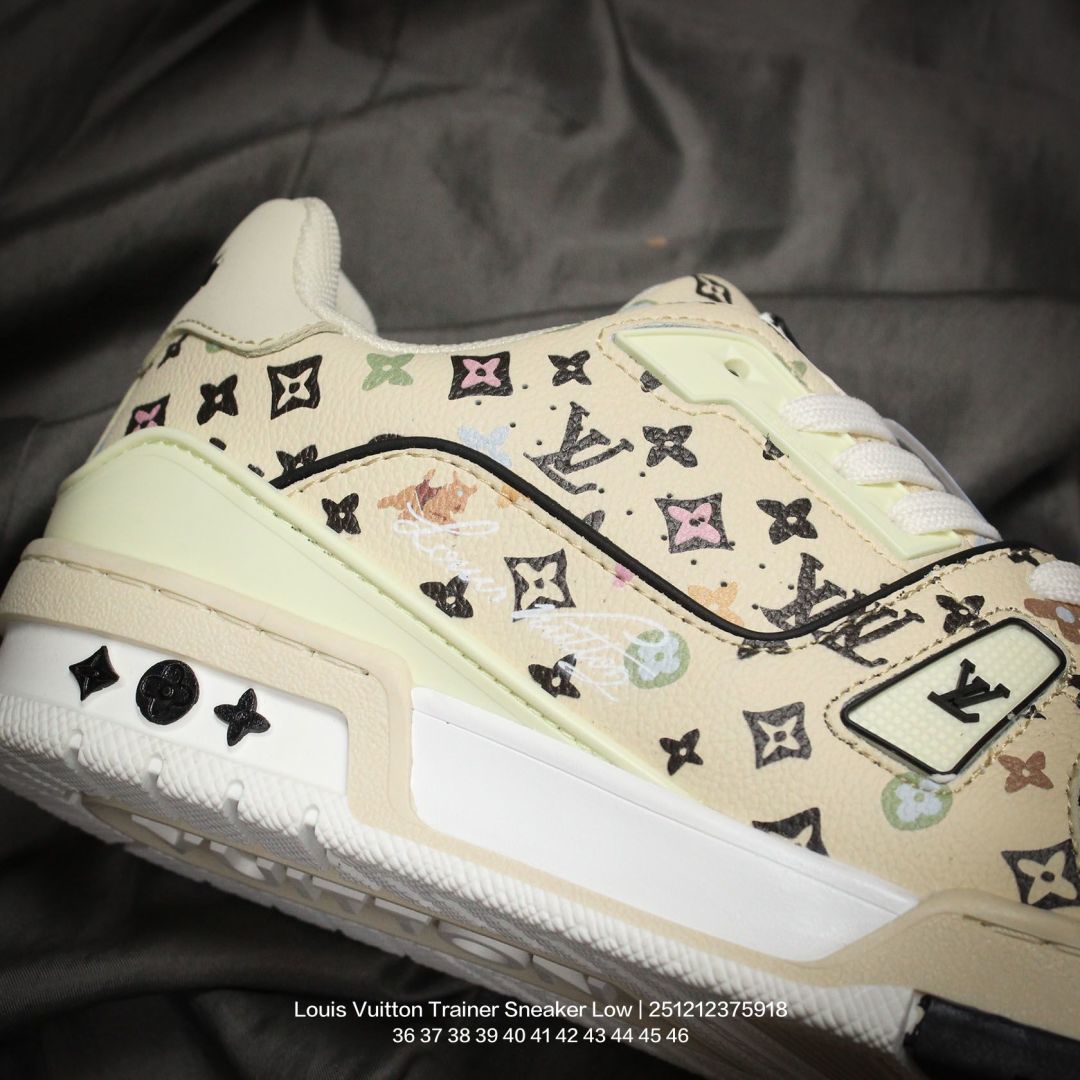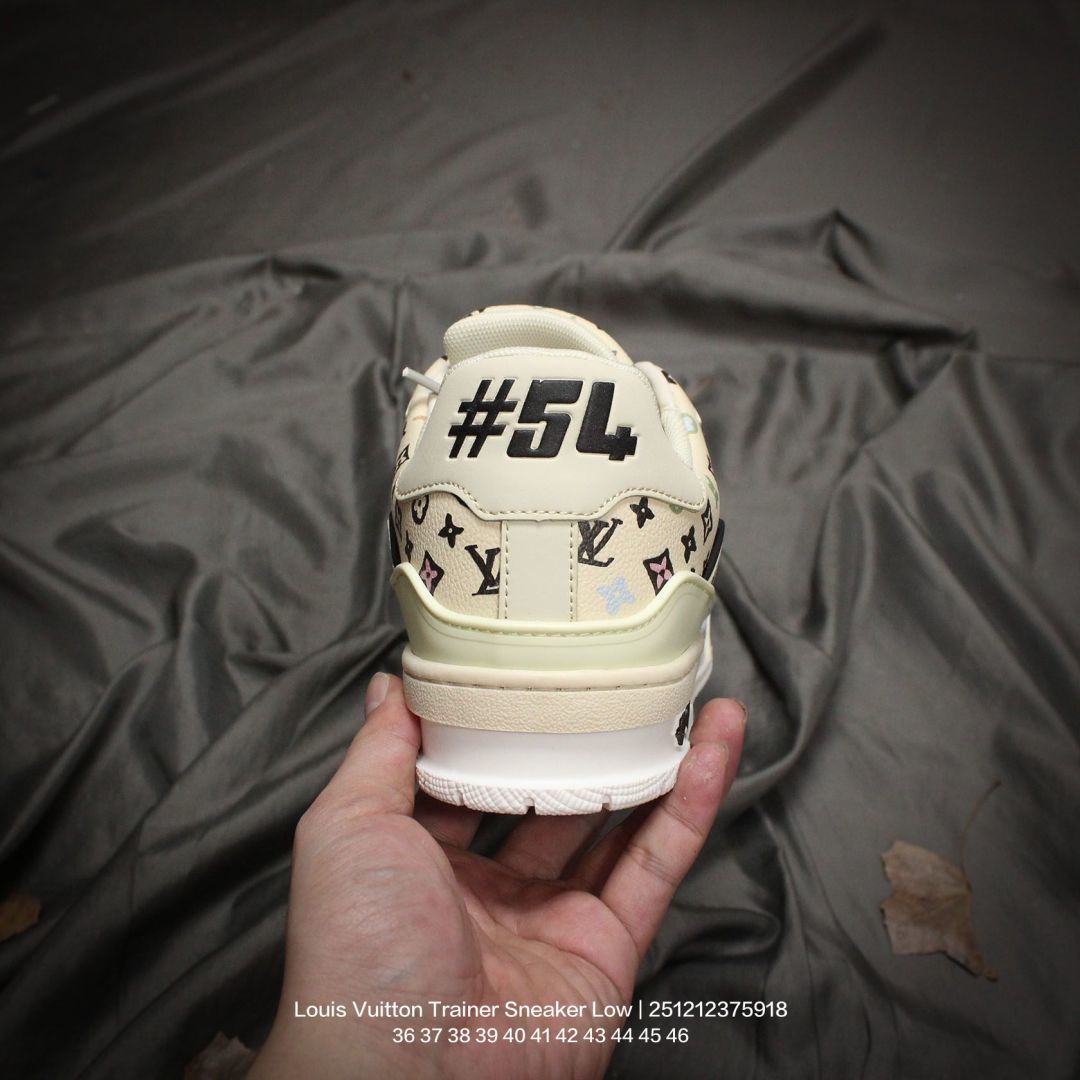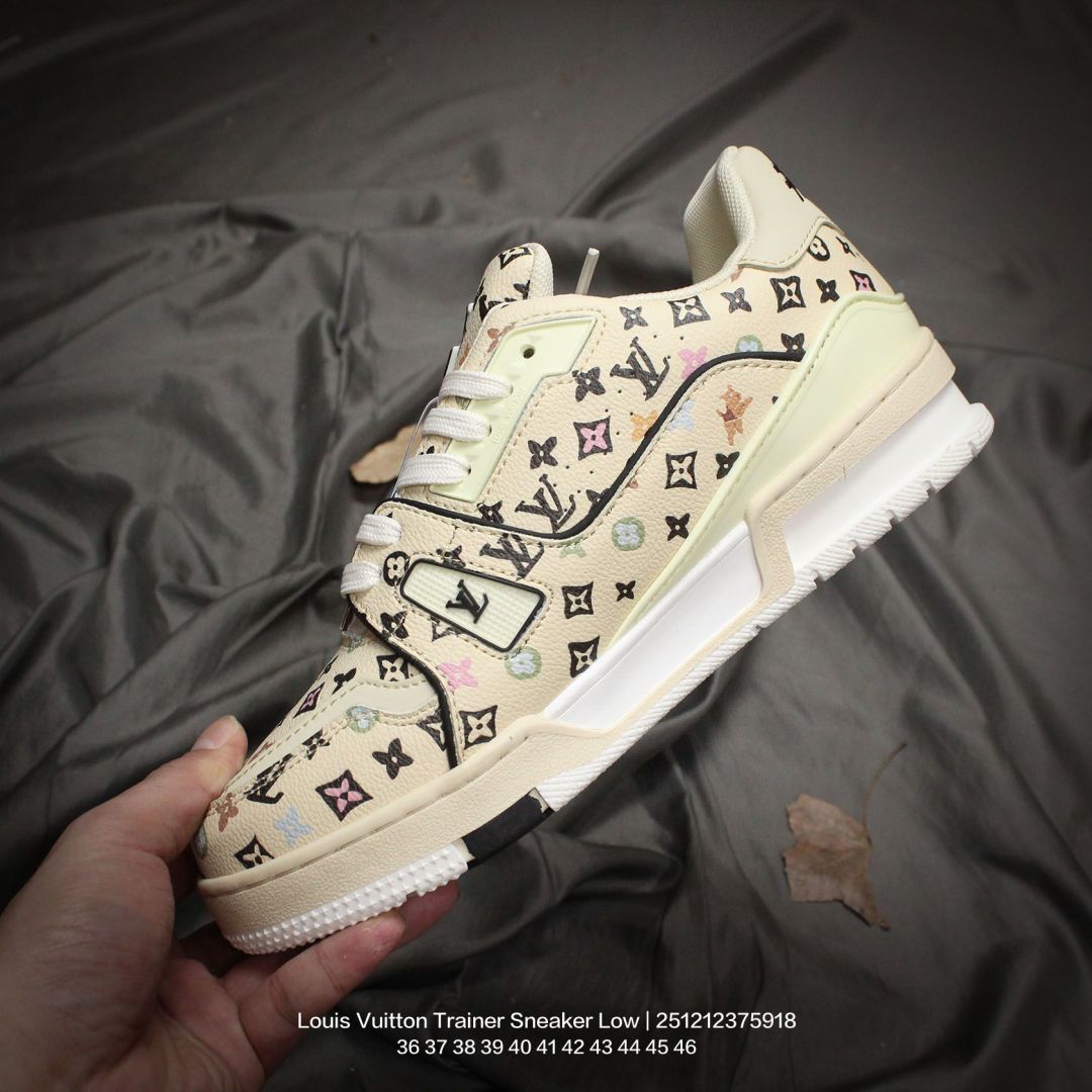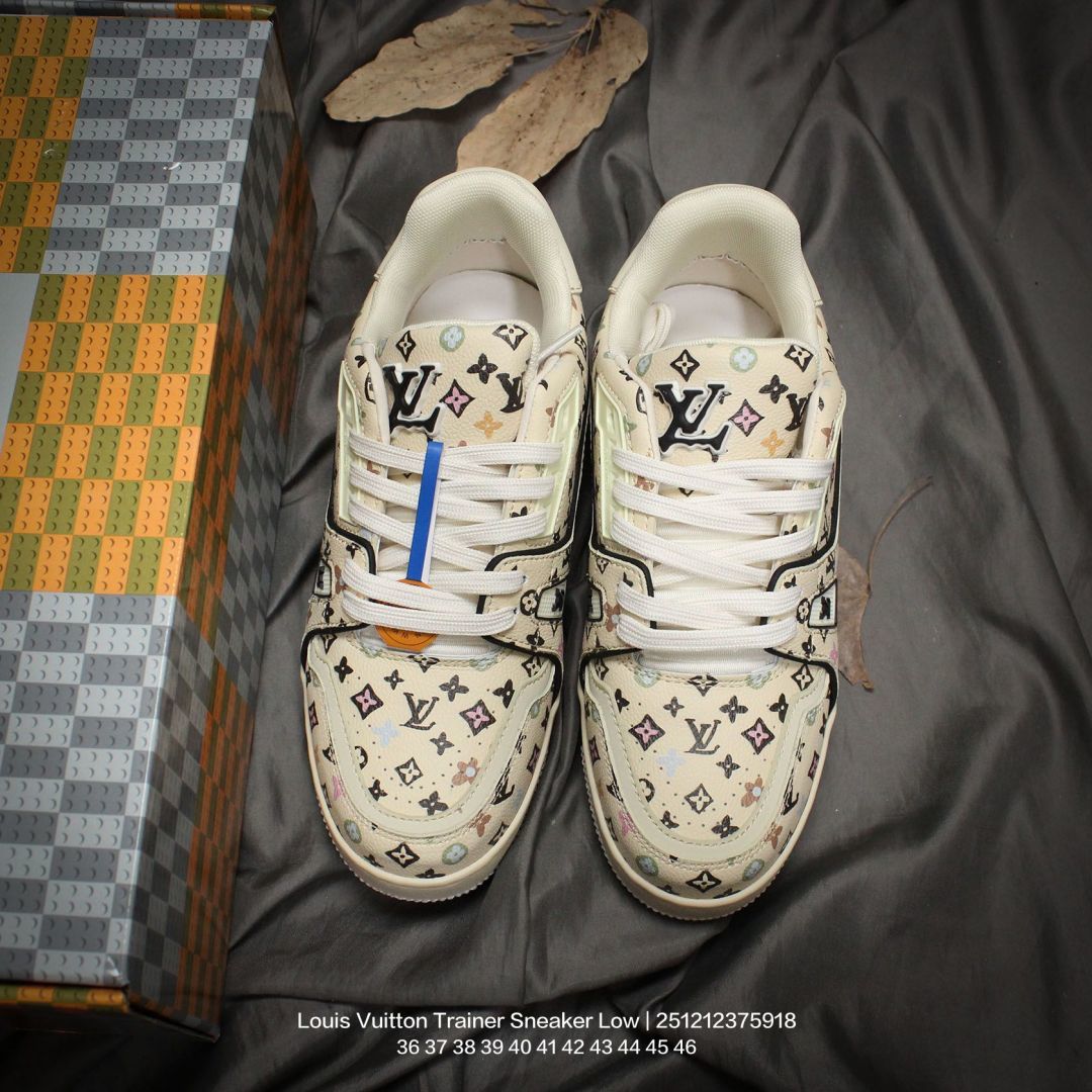 Louis Vuitton 路易威登 男女鞋配置厚实抽屉礼品鞋盒 采用荔枝纹二层牛剖革组合粒面牛剖革鞋面材质 鞋垫嵌入软脚感EVA物料 外置TPR光泽隔色鞋底法国巴黎百年奢侈品牌LV路易威登Louis Vuitton Trainer Sneaker Low 运动系列低帮复古百搭休闲运动文化篮球板鞋