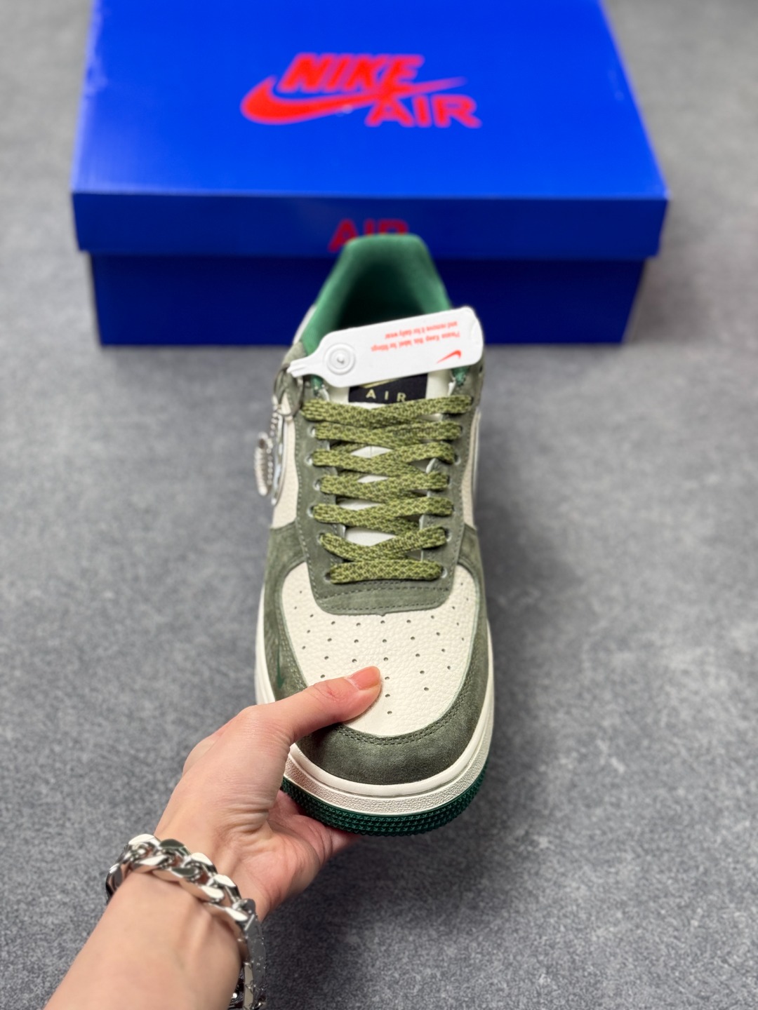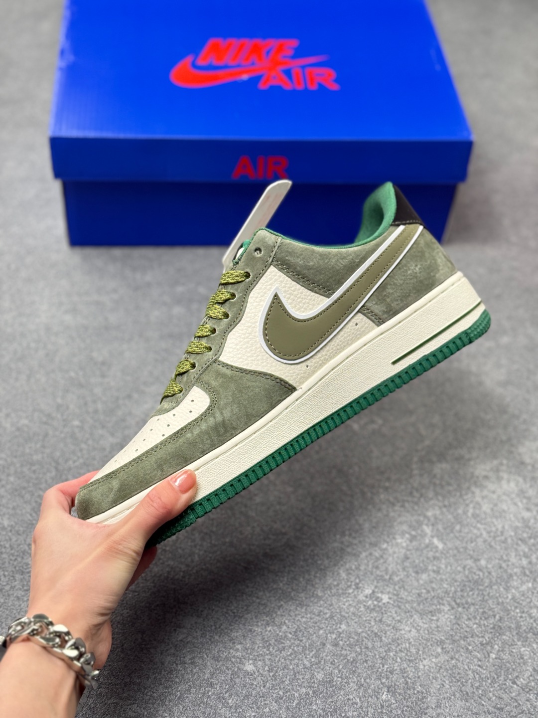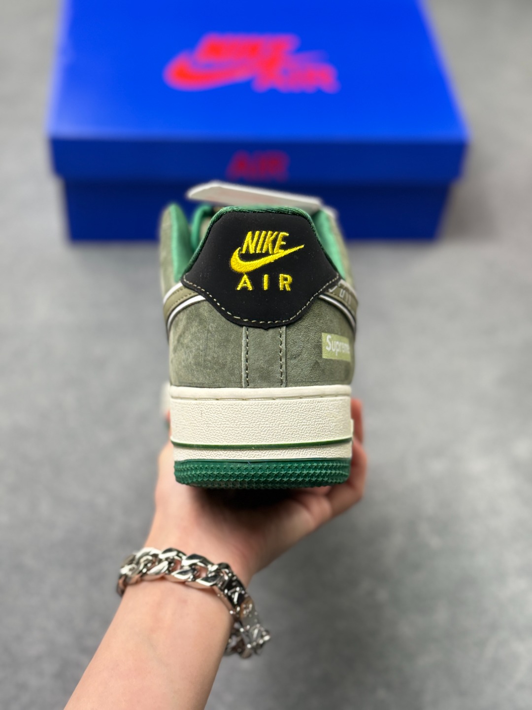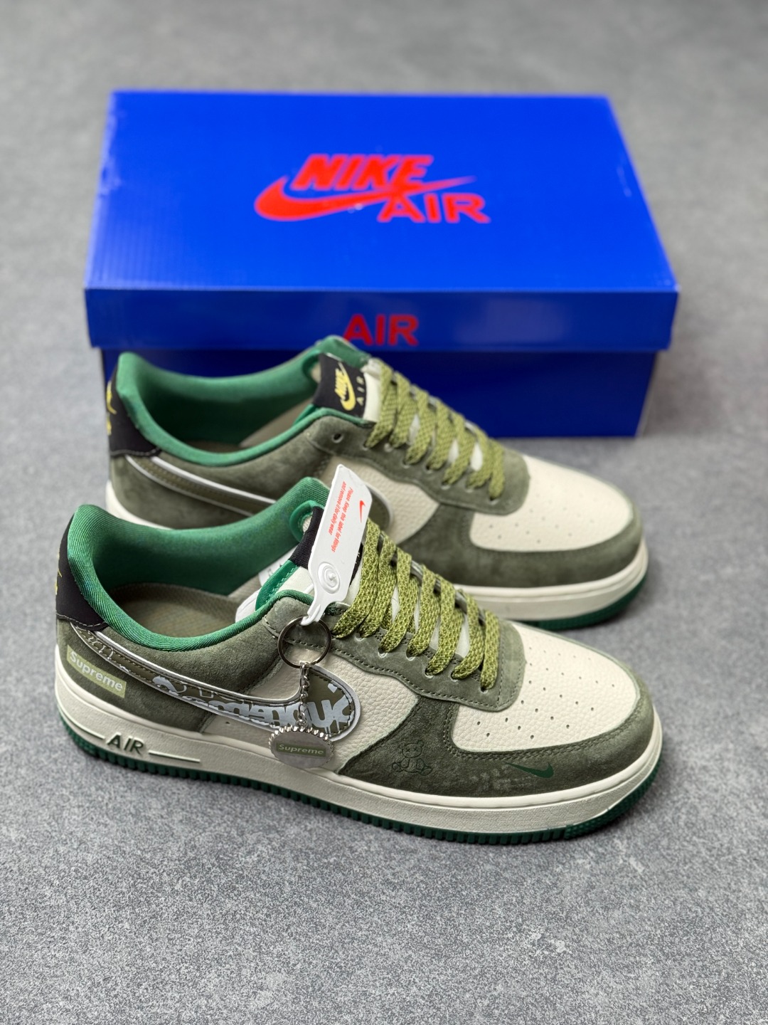 街头图腾 潮范新生 Air Force 1 Low x Supreme 联名款重磅来袭 当街头潮牌的顶流Supreme邂逅Nike经典的Air Force 1 Low 这双联名款以硬核的街头美学 为经典鞋型注入全新的潮流灵魂 作为街头文化与运动传奇的跨界碰撞 它将Supreme的叛逆基因与AF1的经典底蕴完美融合 成为潮人鞋柜中不可错过的收藏级单品 鞋身以灰绿为主调 磨砂皮质的质感细腻高级 与米白色皮革拼接出极具层次感的视觉效果 鞋侧的Swoosh标志被Supreme标志性的涂鸦字体覆盖 张扬的设计瞬间打破沉闷 成为整双鞋的视觉核心 鞋身侧边的Supreme小标 鞋舌处的品牌细节点缀 以及墨绿与草绿撞色的鞋带 鞋底 在细节处将街头潮流的个性展现得淋漓尽致 延续Air Force 1 Low的经典低帮版型 轻量化的Air气垫鞋底兼顾了日常穿搭的舒适度与实用性 无论是搭配工装裤打造硬核街头风 还是配休闲裤诠释随性潮范 这双鞋都能轻松成为造型的点睛之笔 它不只是一双鞋 更是街头文化的具象表达 将Supreme的先锋态度与AF1的传奇历史凝于一体 穿上它 便是踩在街头潮流的浪尖 每一步都自带不羁的潮酷气场