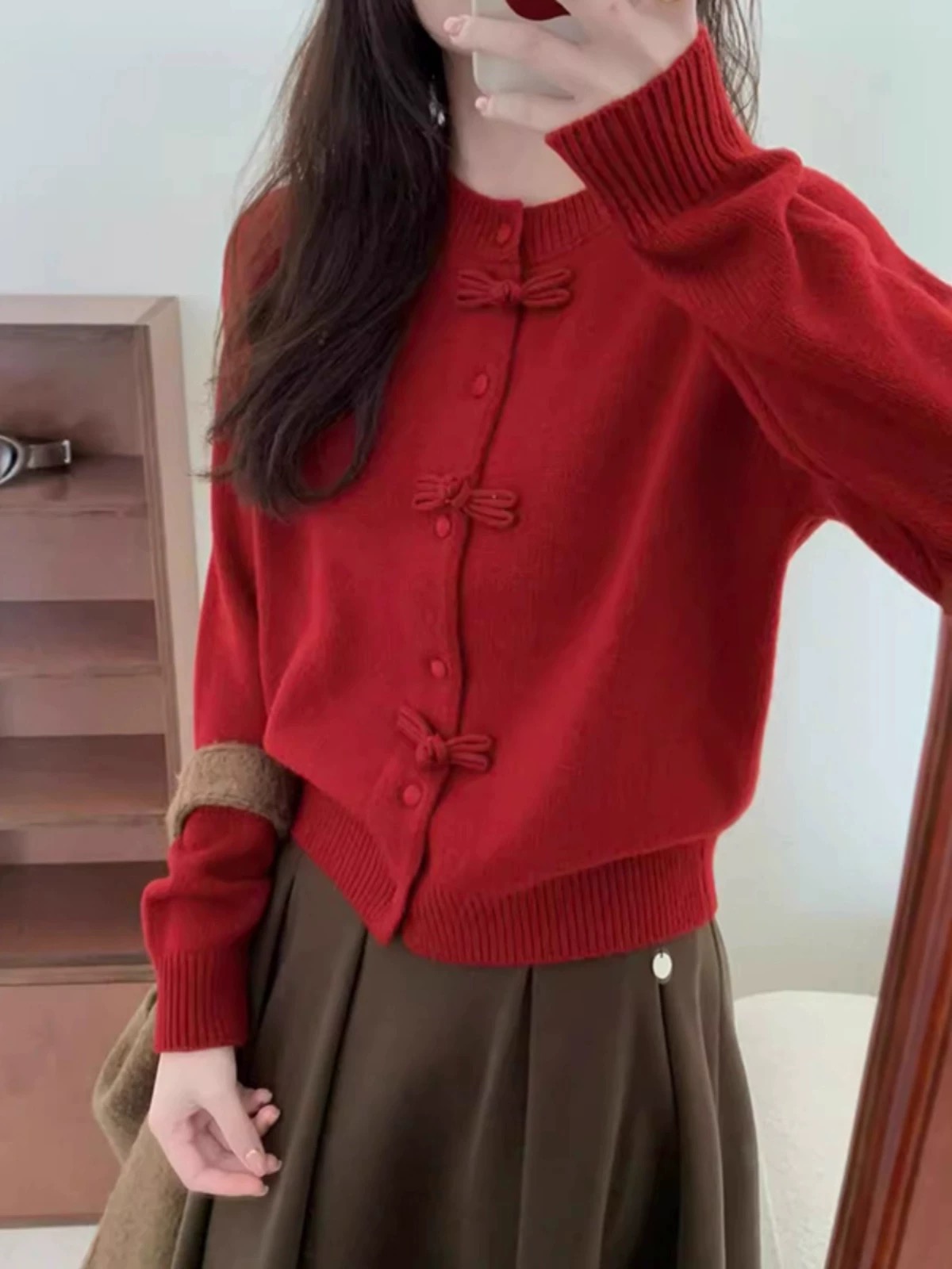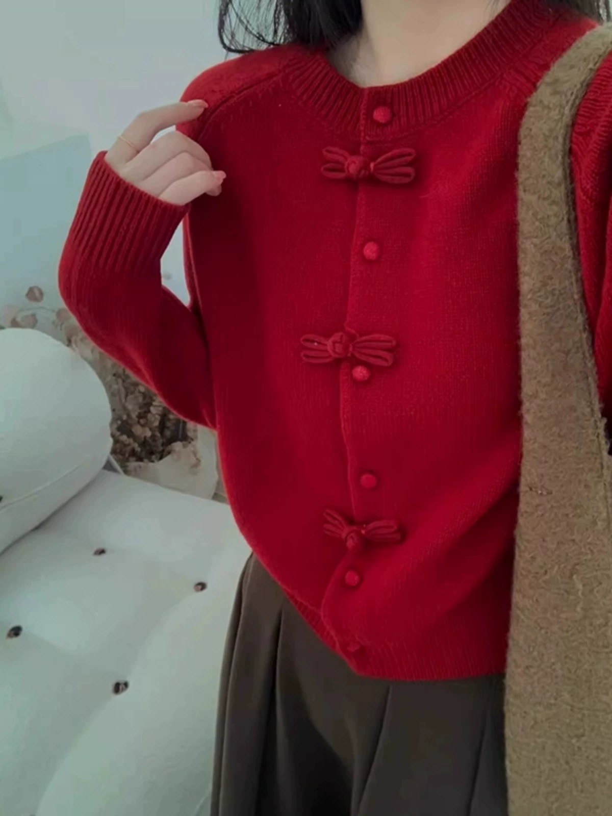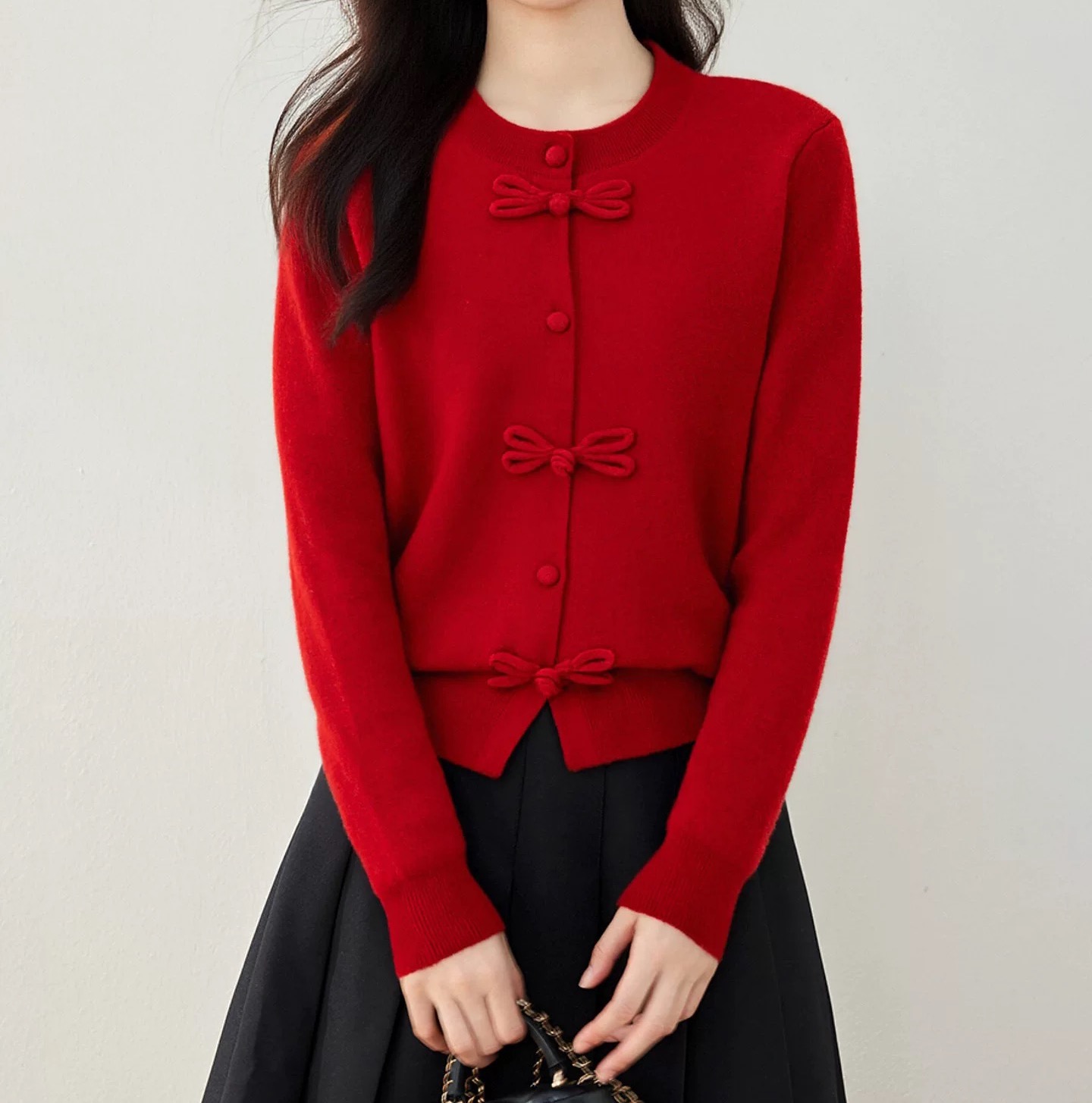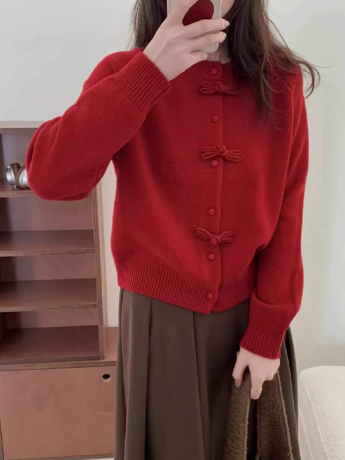 85169352 - 批红色盘口针织开衫新中式红色盘扣针织开衫女装高级感蝴蝶结毛衣 387765