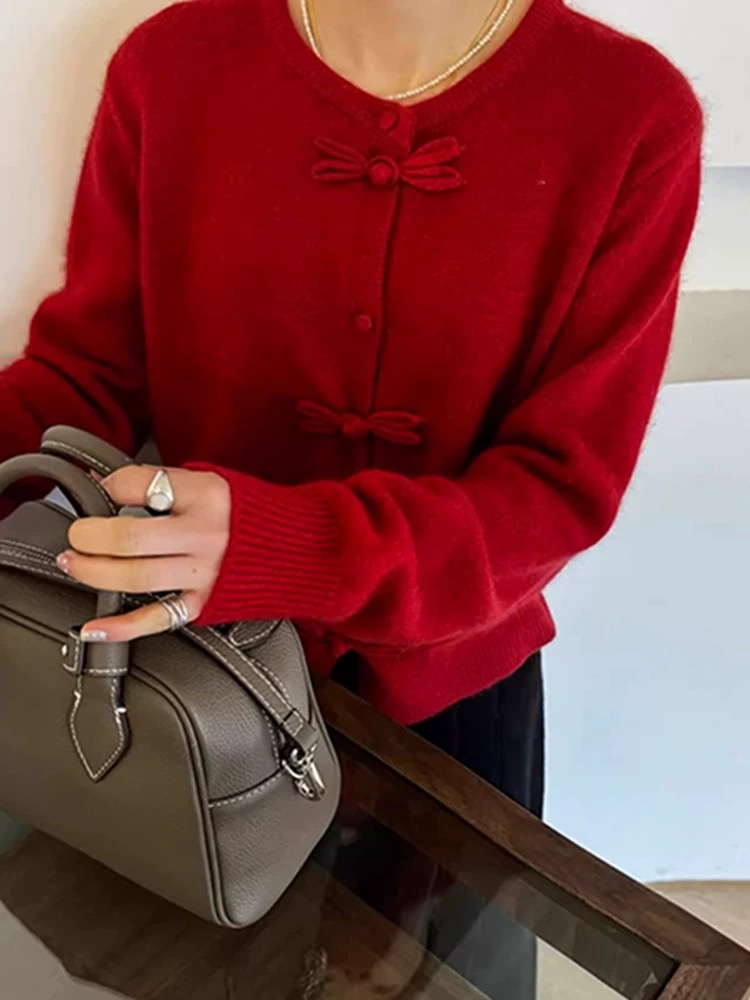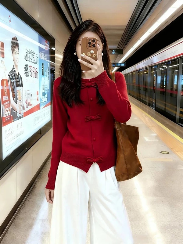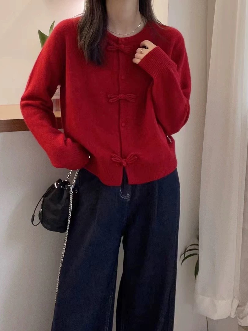 批红色盘口针织开衫新中式红色盘扣针织开衫女装高级感蝴蝶结毛衣外套本命年秋冬穿搭 新年氛围拉满 这抹 中式甜 红开衫太戳了