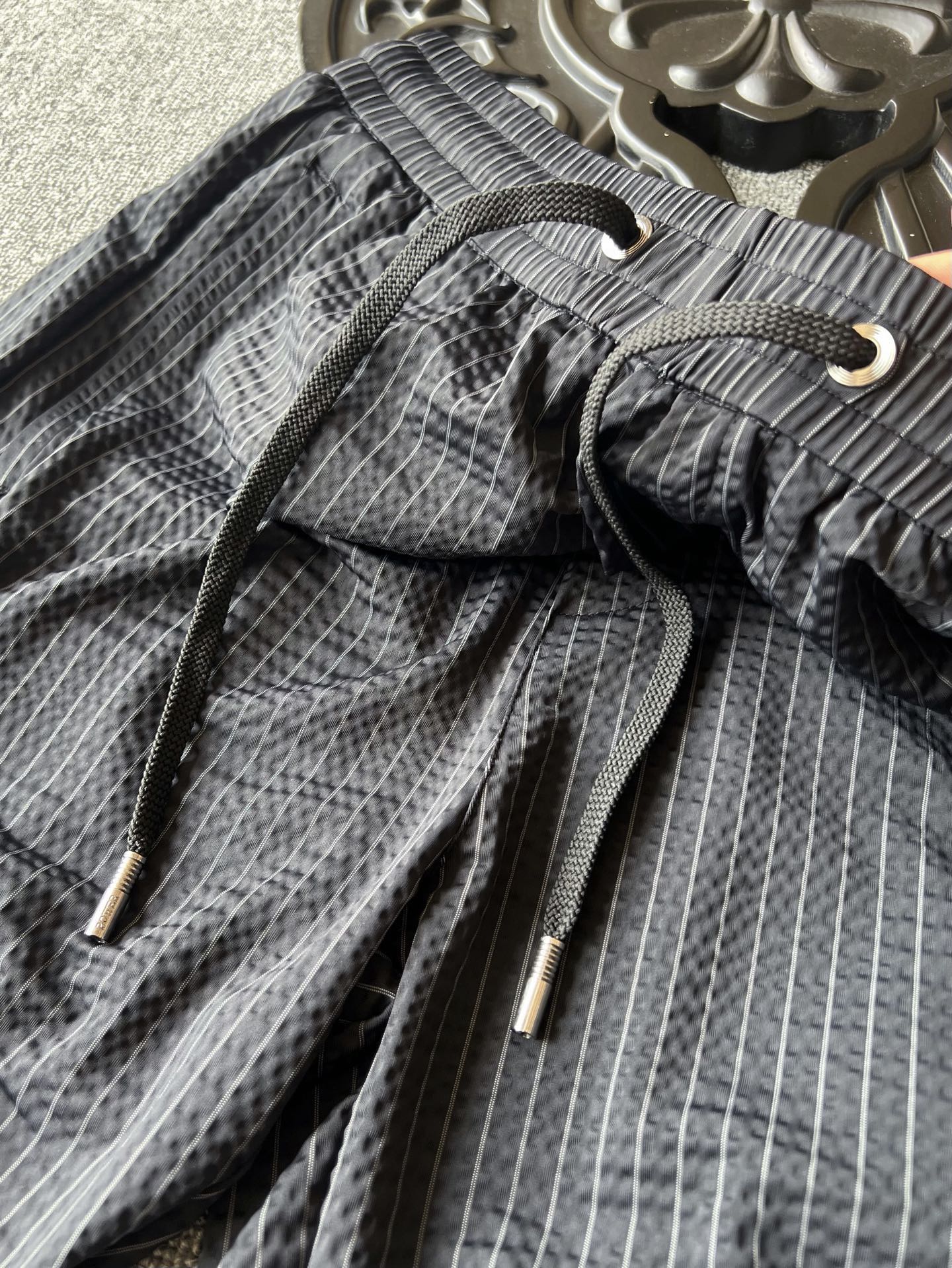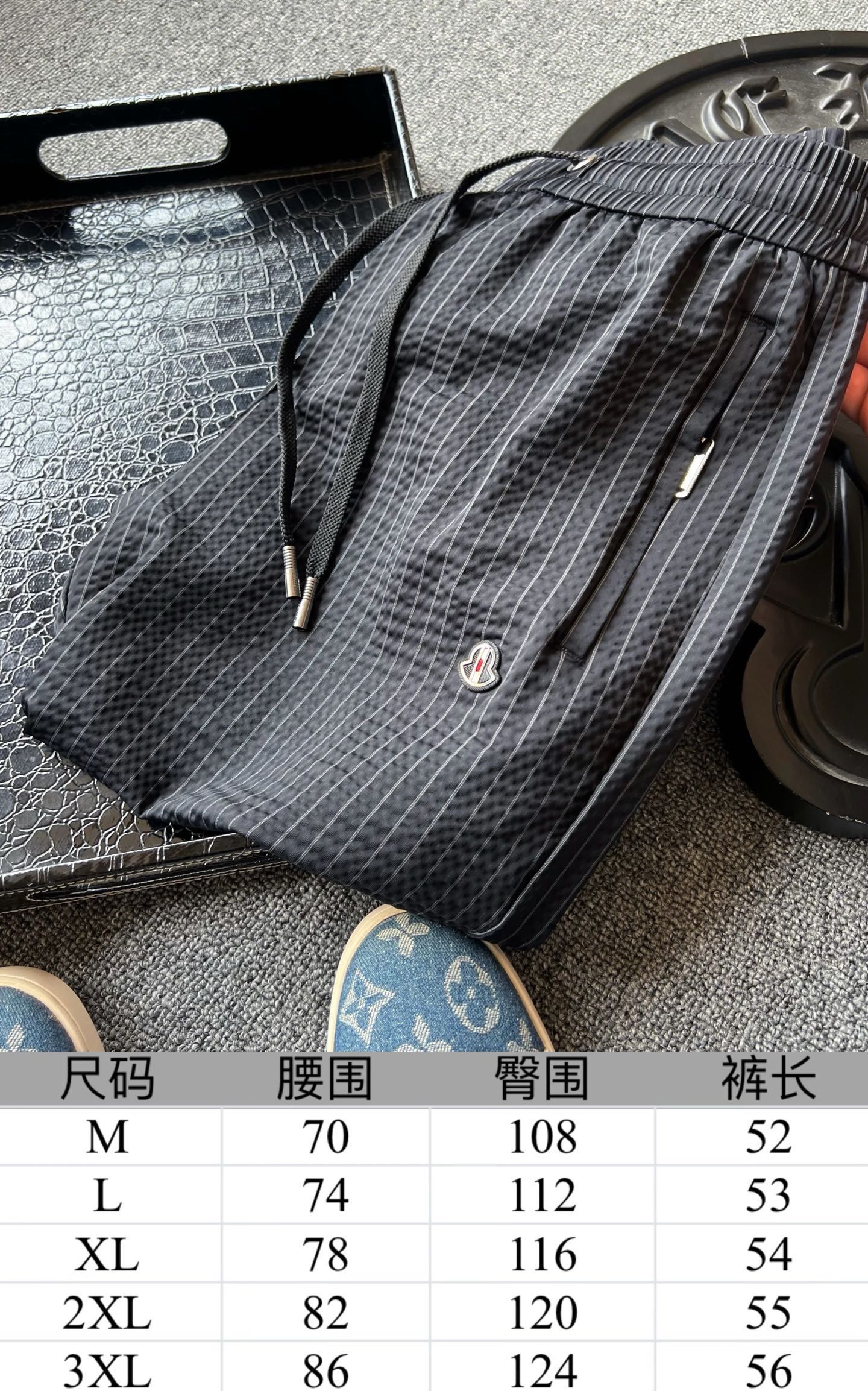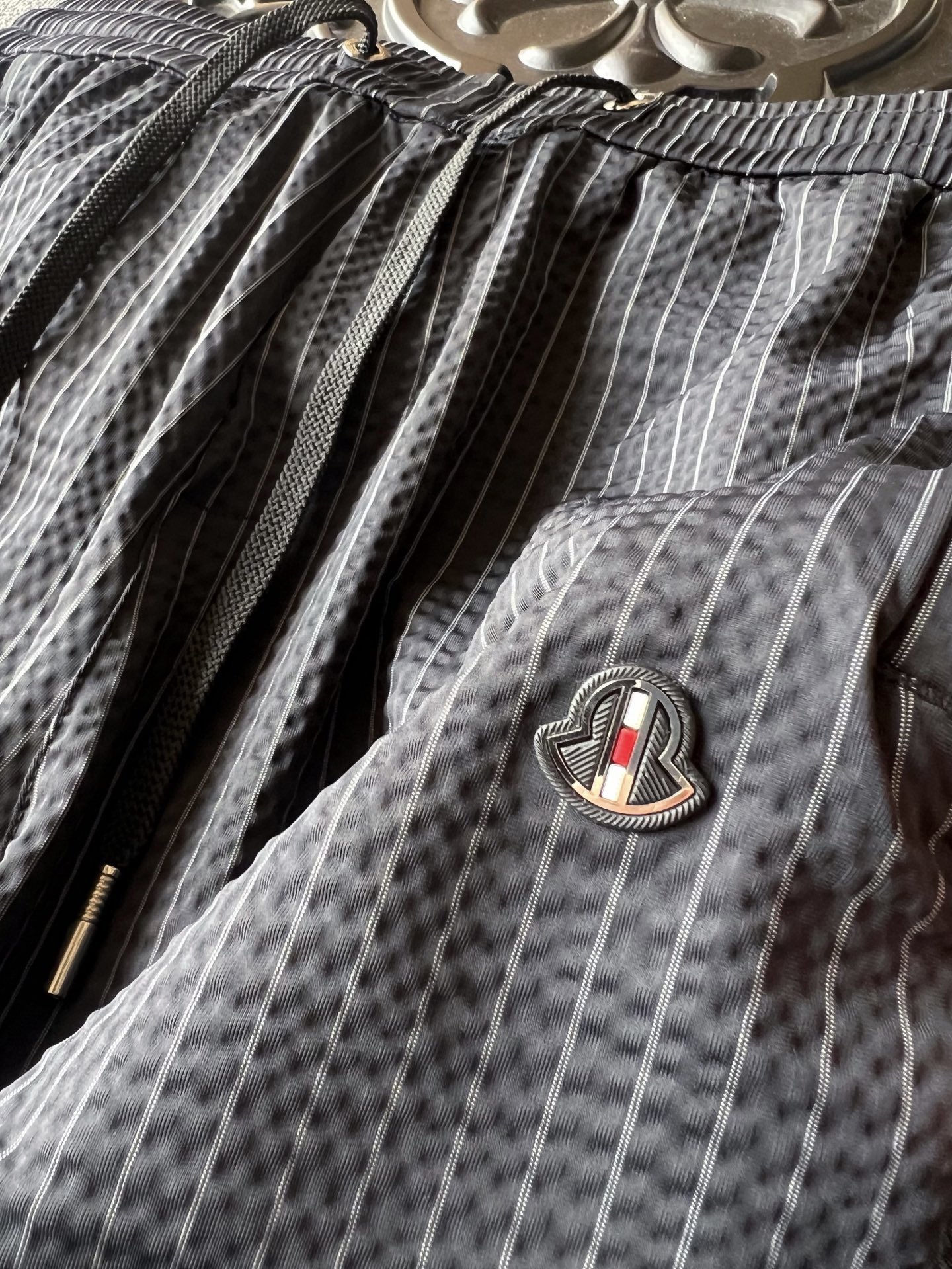 细节细节再细节 Moncler家商场新品条纹五分裤 设计师主打高端旗舰系列而量产 高级灰竖条纹配合鱼骨纹3D肌理高级感拉满 裤前钨钢蒙口金属标 轮廓镶嵌立体浮雕硅胶工艺 中间做了红白分段式细节 十分精致 金属抽绳孔以及双侧带暗拉链设计 裤后内嵌式口袋增强立体感的同时大大增强实用性以及随身携带手机安全性 内里天花板级包边包条精湛做工