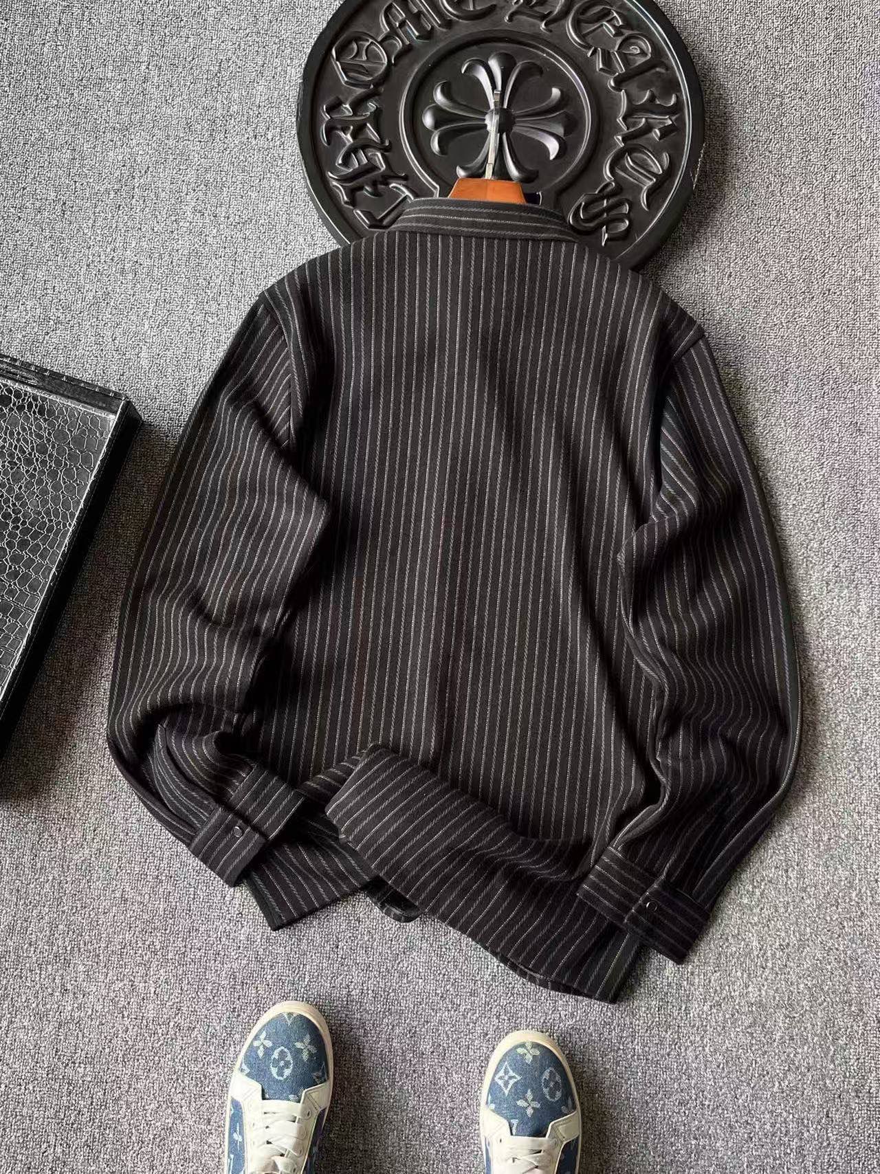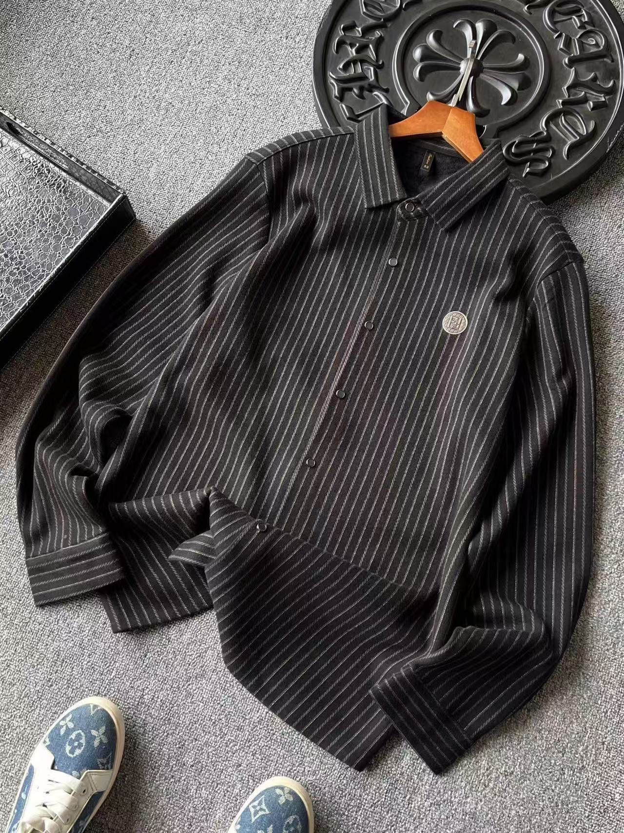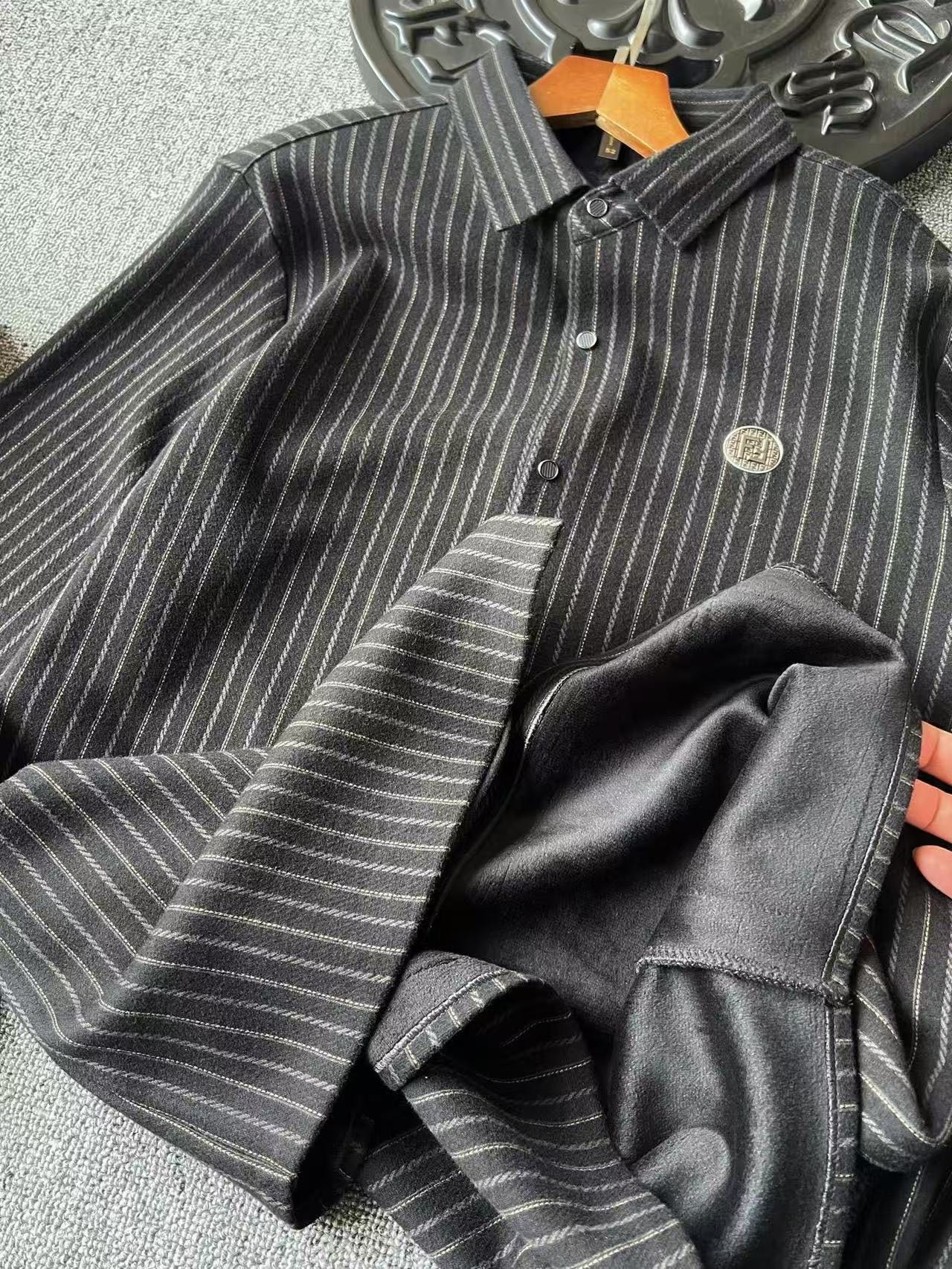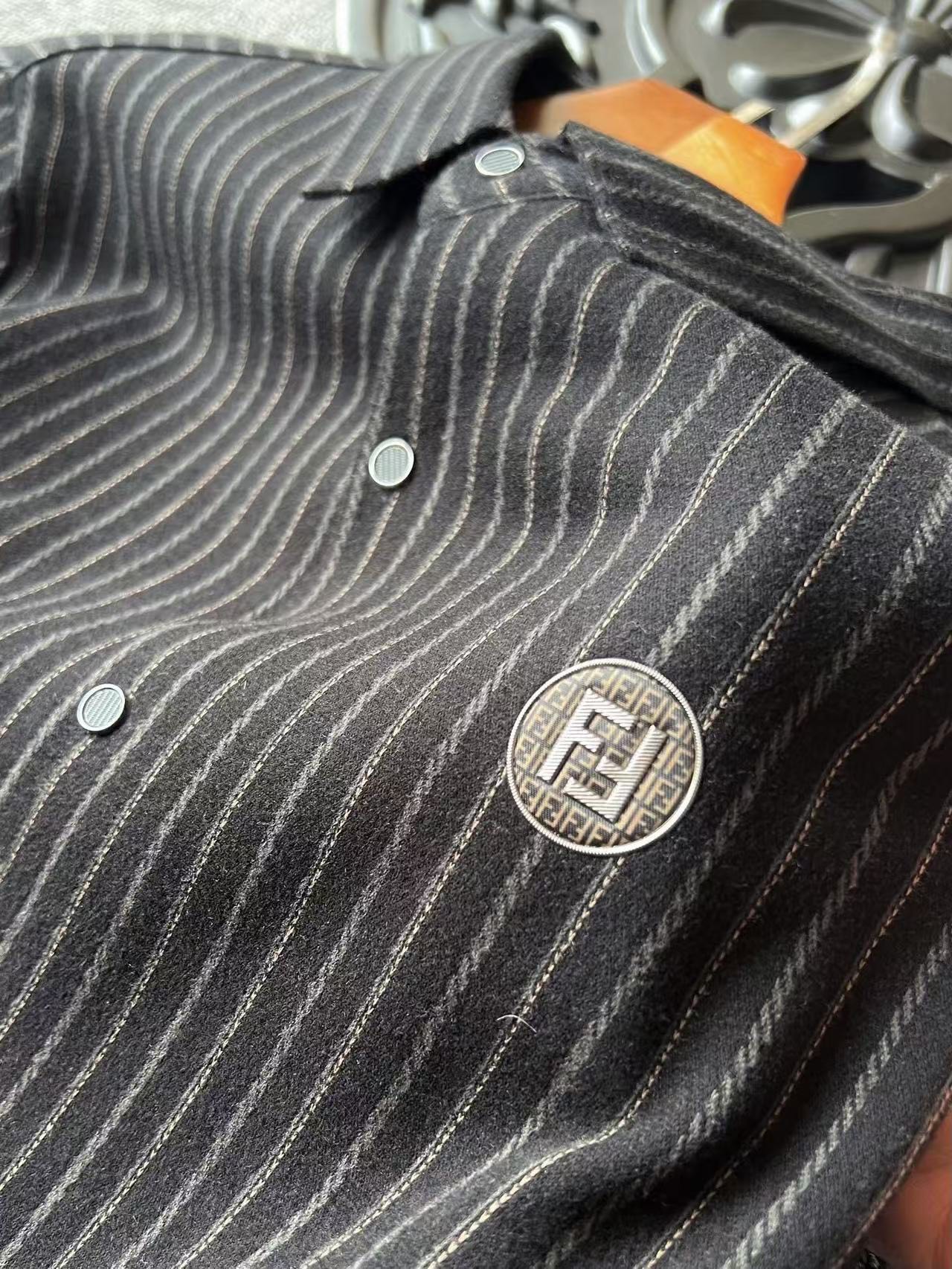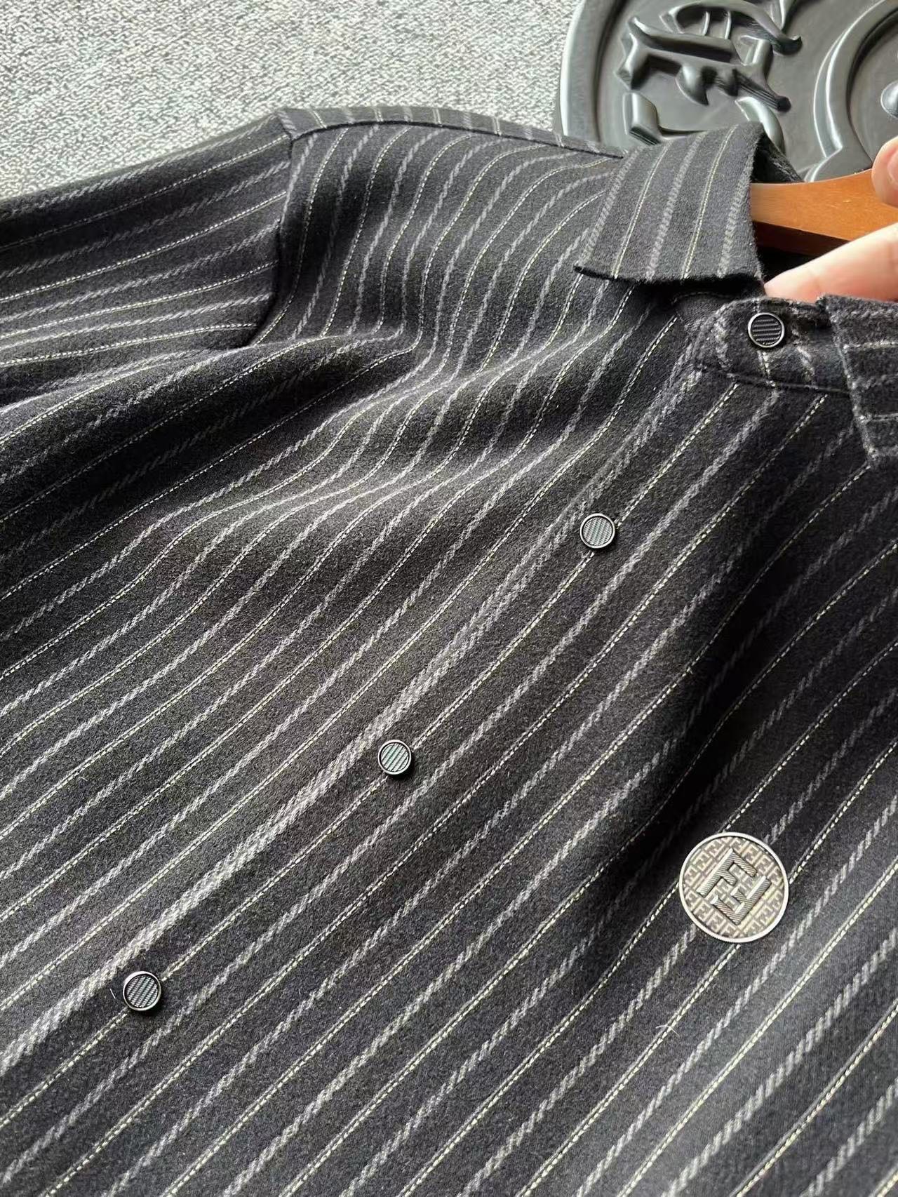 细节细节再细节 Fendi家商场新品一体色织竖条纹超柔羊毛蚕丝衬衫外套 胸前圆形咖啡色双F满印带为基底 居中又做了浮雕3D立体双F芬迪金属丝工艺轮廓配套立体细节 十分精致 高端定制浮雕五金纽扣细节 外穿内搭高级感拉满
