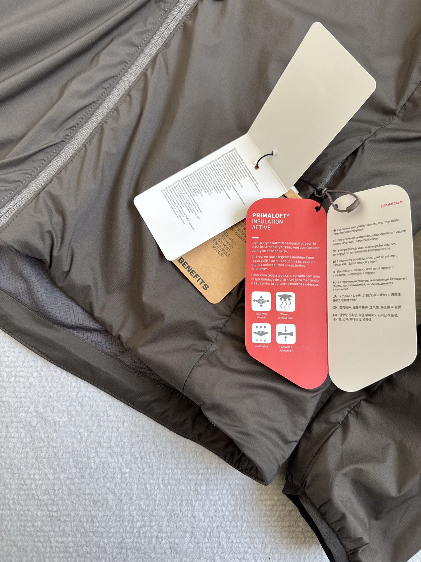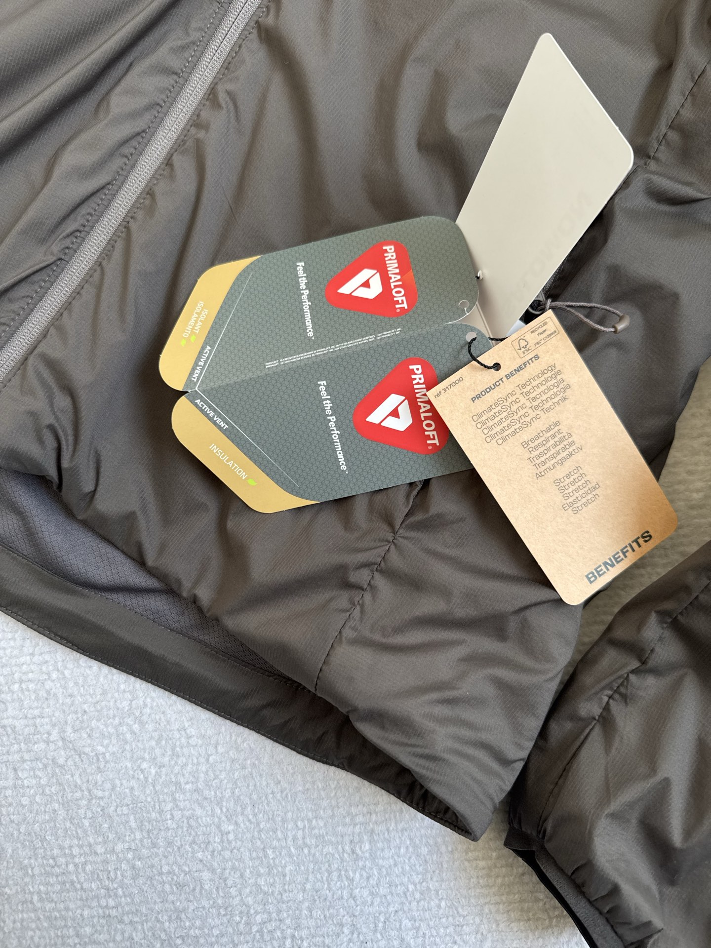 ClimateSync 动态温控 保温层做了激光切割的 山形标 开孔 动作幅度大时会张开排湿散热 静止时闭合锁温 真正做到动不闷 静不冷 Climatesync动态暖芯科技加PRIMALOFTB隔热层实现温控管理新突破 提供优秀保暖性能