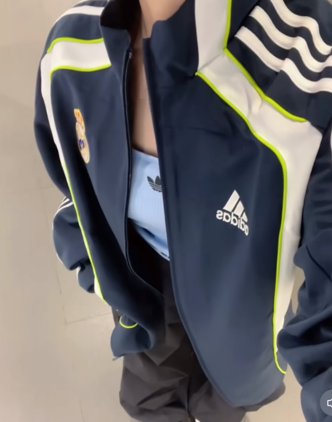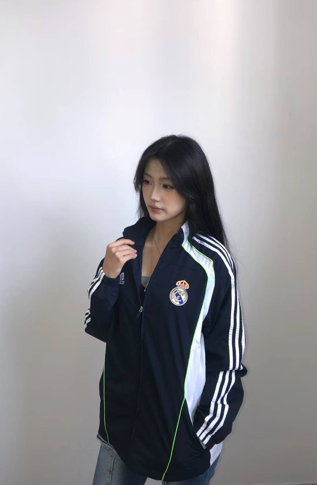 上身效果图𝟭𝟬𝟳𝟳𝟴 可扫码进入官网 𝗔𝗱𝗶𝗱𝗮𝘀阿迪达斯春秋新款皇马刺绣足球训练梭织休闲男女同款立领外套
