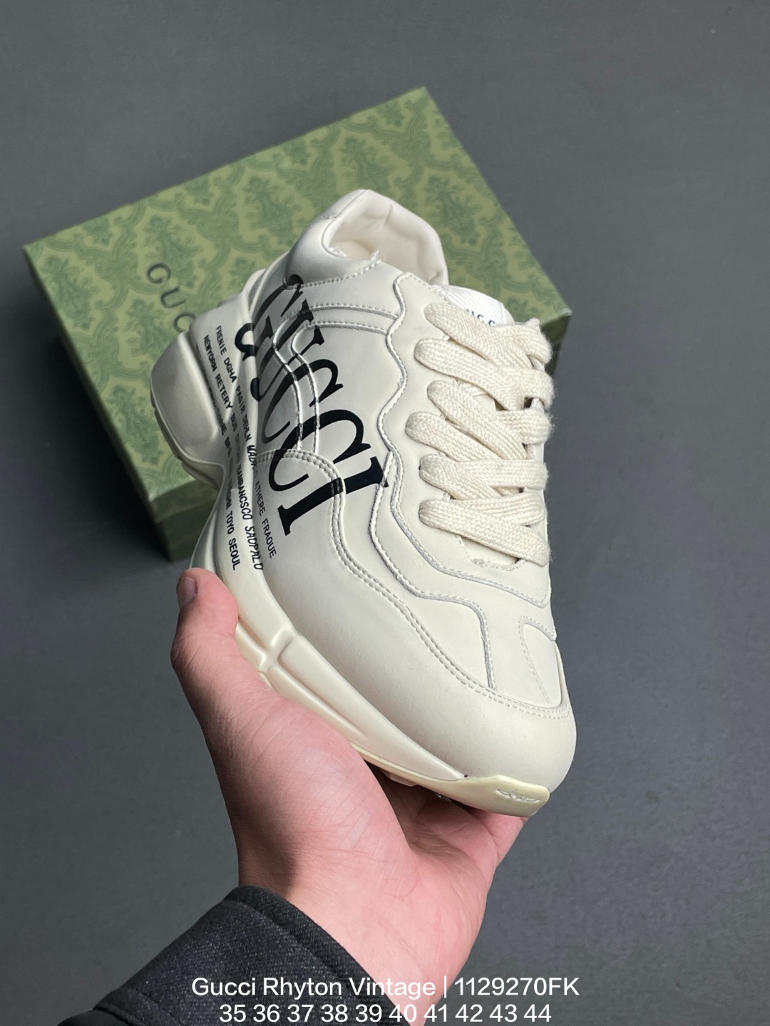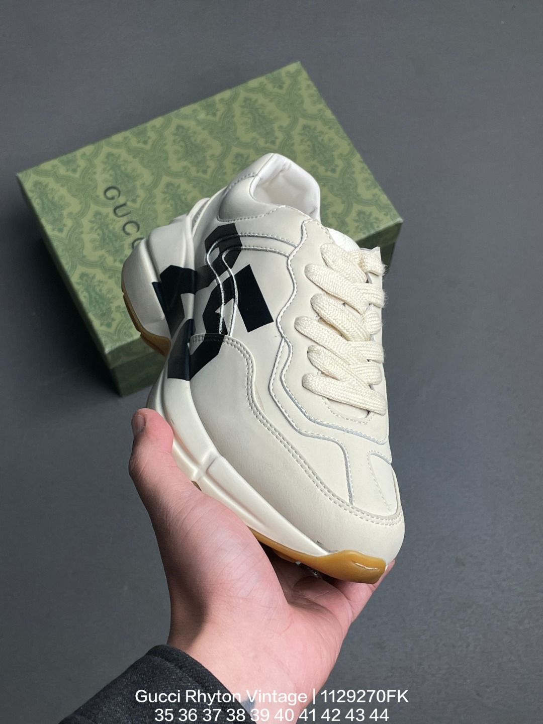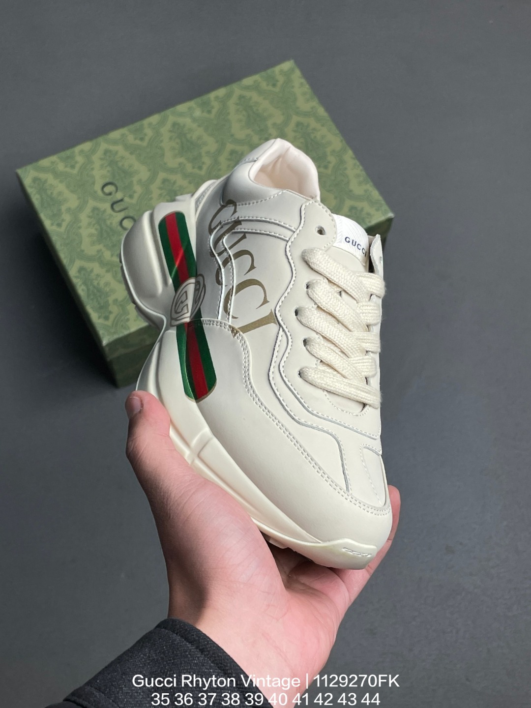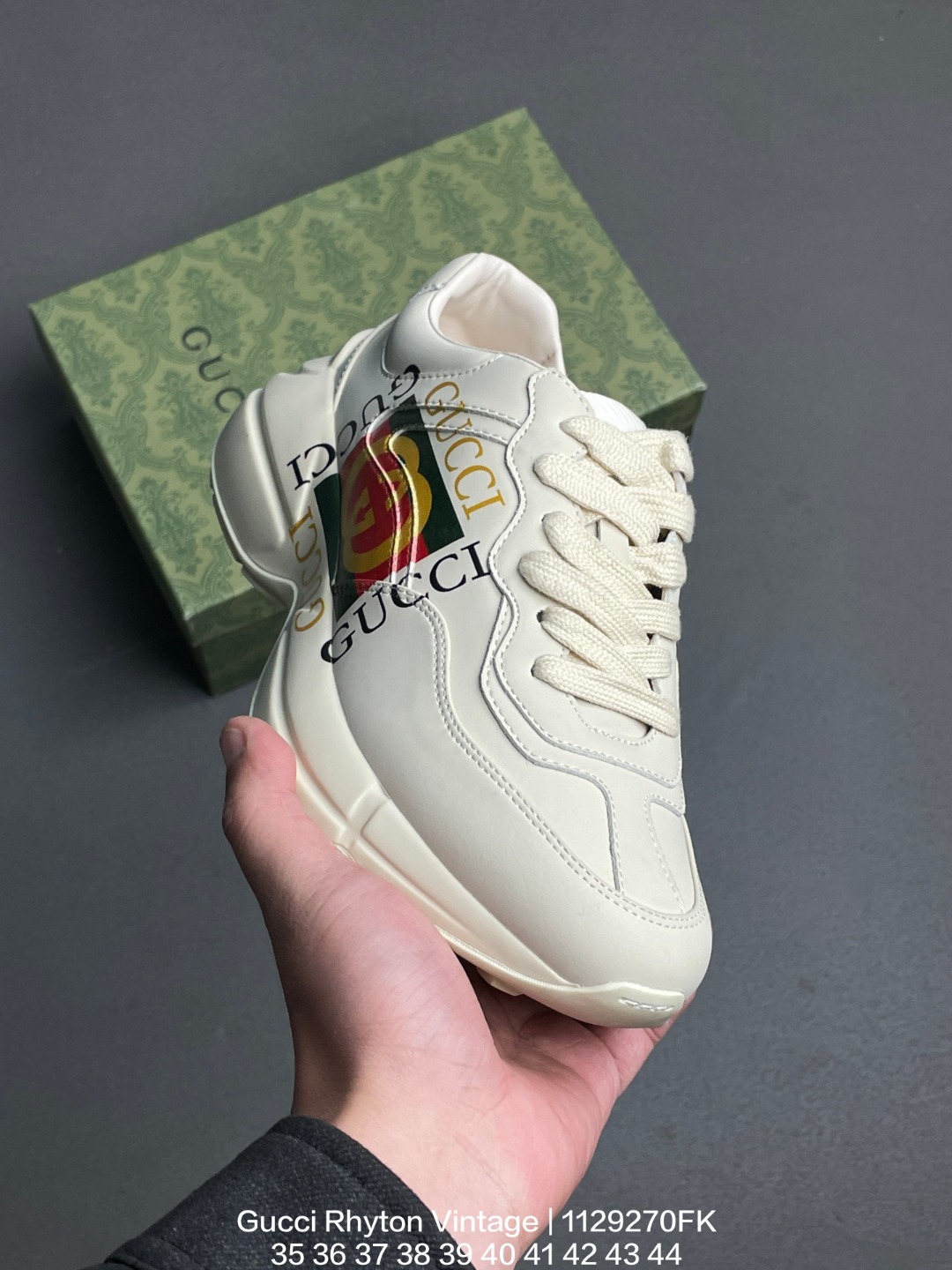 GUCCI 古驰 原装雪梨形超软沙绒纸团 原比值数据开发高弹PU材质中底 双层TPR无缝隙串色技术组合大底区别市面公底版本意大利时装奢饰品牌 古驰Gucci Rhyton Vintage 角状系列低帮复古厚底老爹风休闲运动鞋