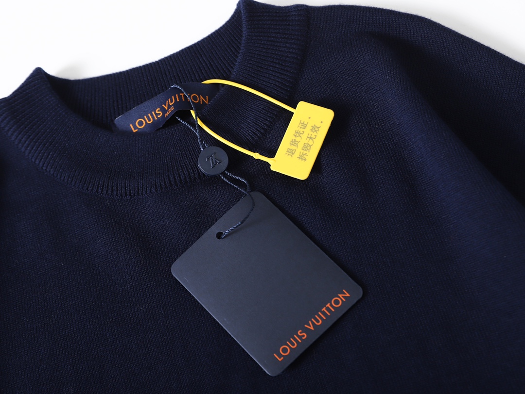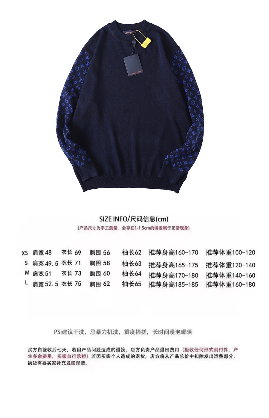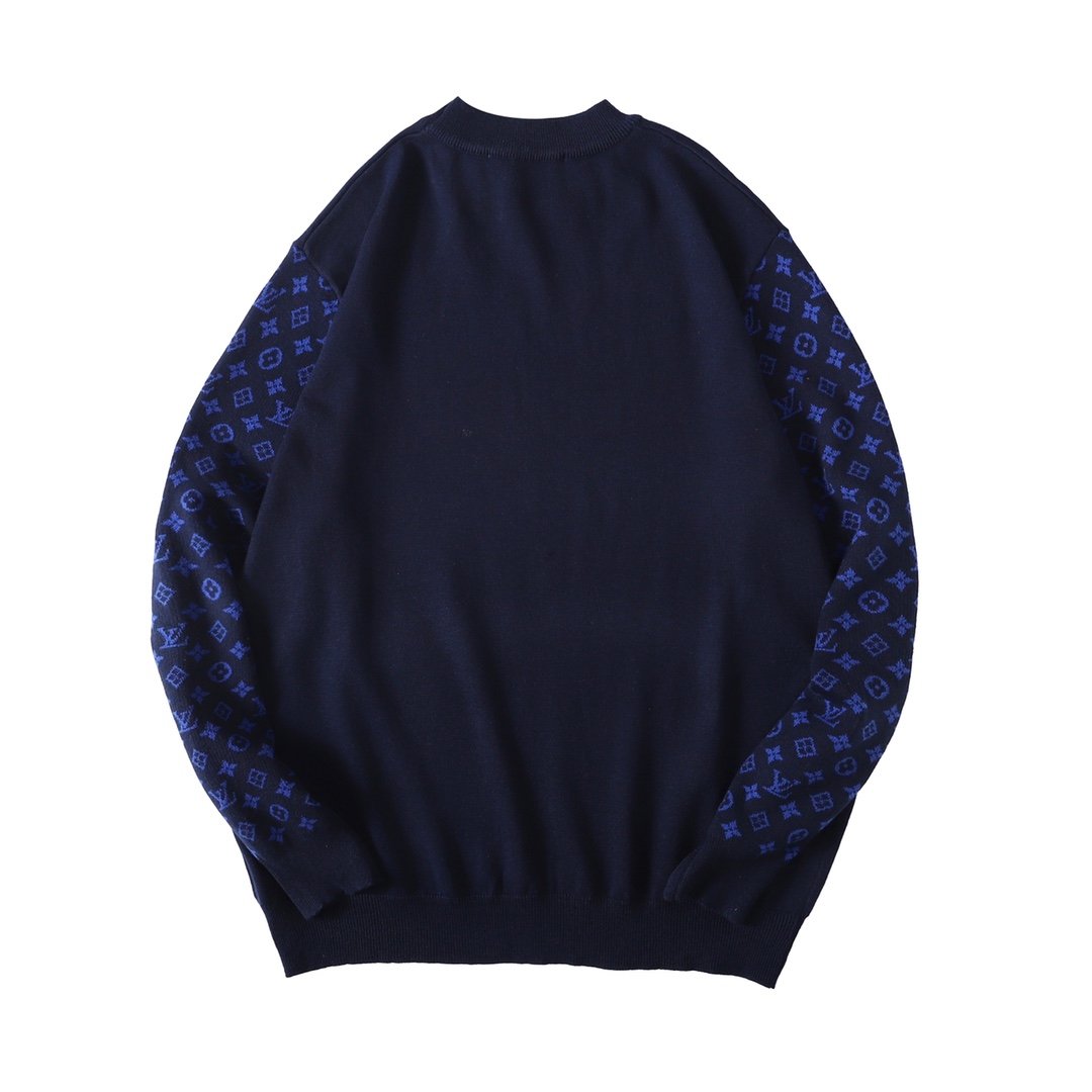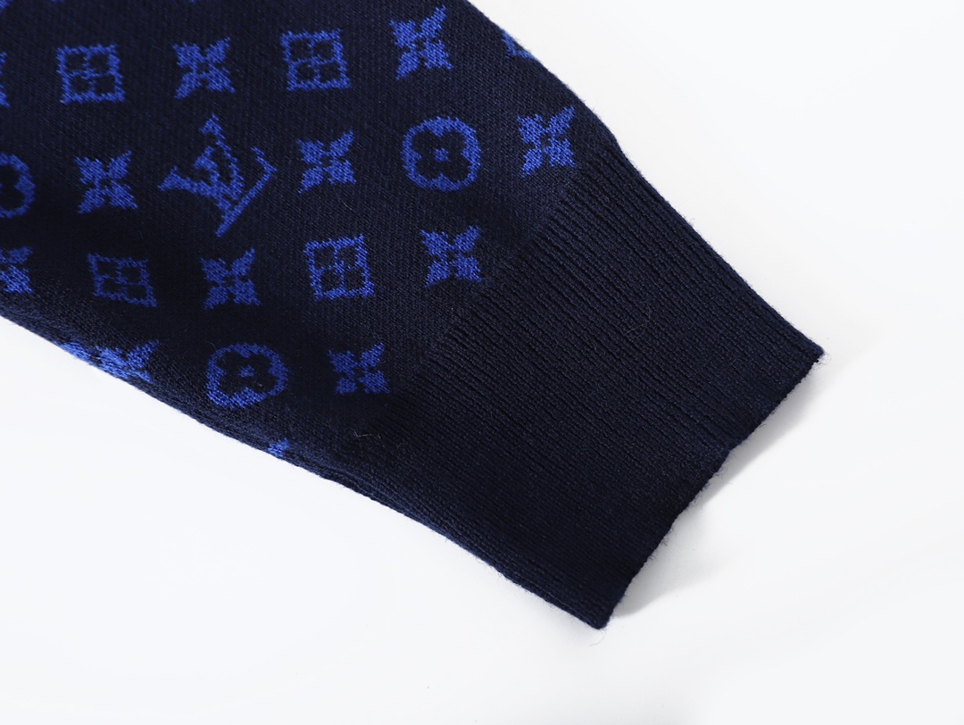 原版7600购入 定染蓝毛料 70绵羊毛 10山羊绒 20棉双面提花袖工艺 对花封盘 袖子对位满幅monogram提花工艺 采用14s细针织片 倆侧袖位采用圆桶提花工艺 由进口双面提花机器制作 经典老花图案设计撞色 提花 对纱线本身的着色度和皂洗色牢度有着很高的要求 主纱与辅纱均经过巴素兰处理 不串色 耐穿洗
