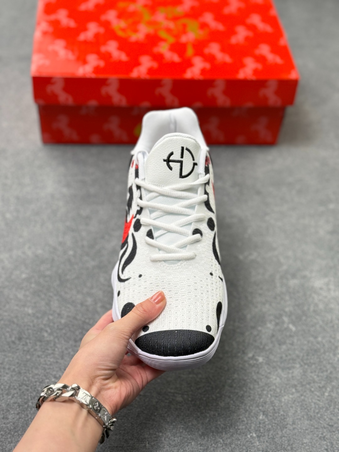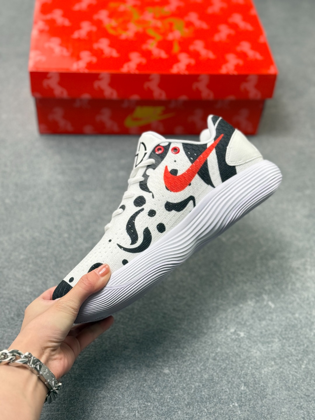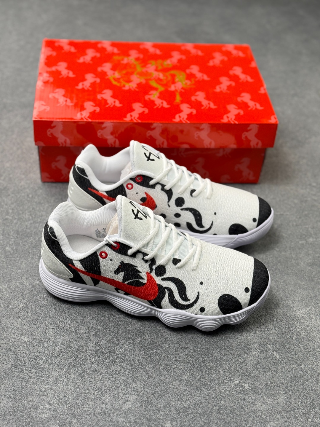 马年专属Nike战靴 帅到炸街的球场利器 当国风马纹撞上街头运动风 这双Nike战靴直接把新年氛围感拉满 白黑水墨质感的鞋身 勾勒出骏马奔腾的灵动线条 一抹亮橙Swoosh瞬间点亮视觉 既藏着马年的祥瑞寓意 又透着不服输的球场锐气 鞋面采用透气针织材质 贴合脚面还能时刻保持清爽 波浪纹中底搭载缓震科技 起跳落地都能感受到稳稳的回弹 不管是实战对抗还是日常出街 都能轻松hold住