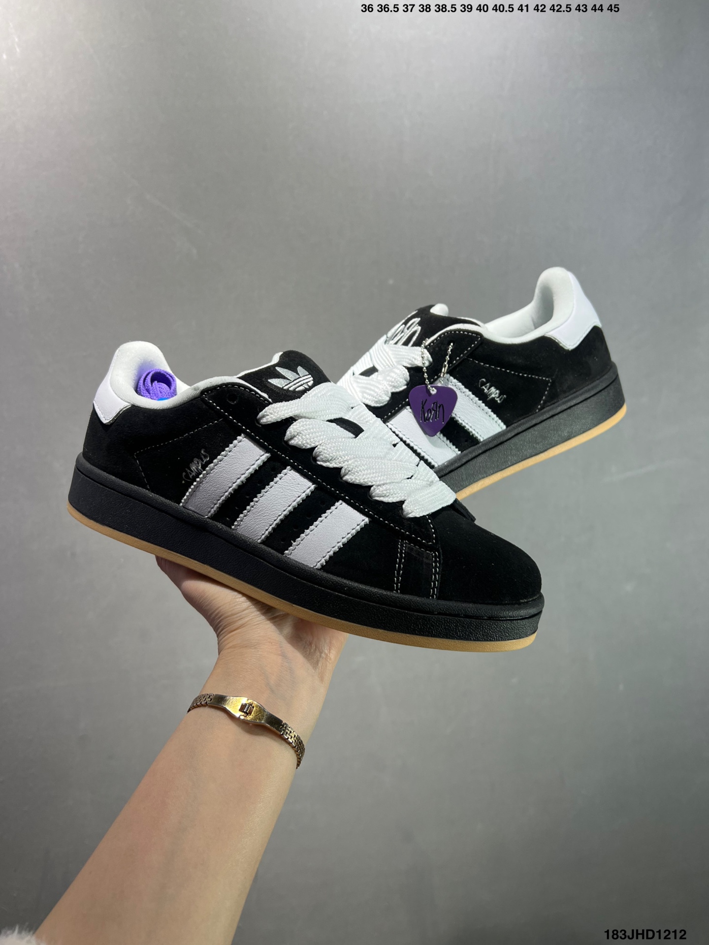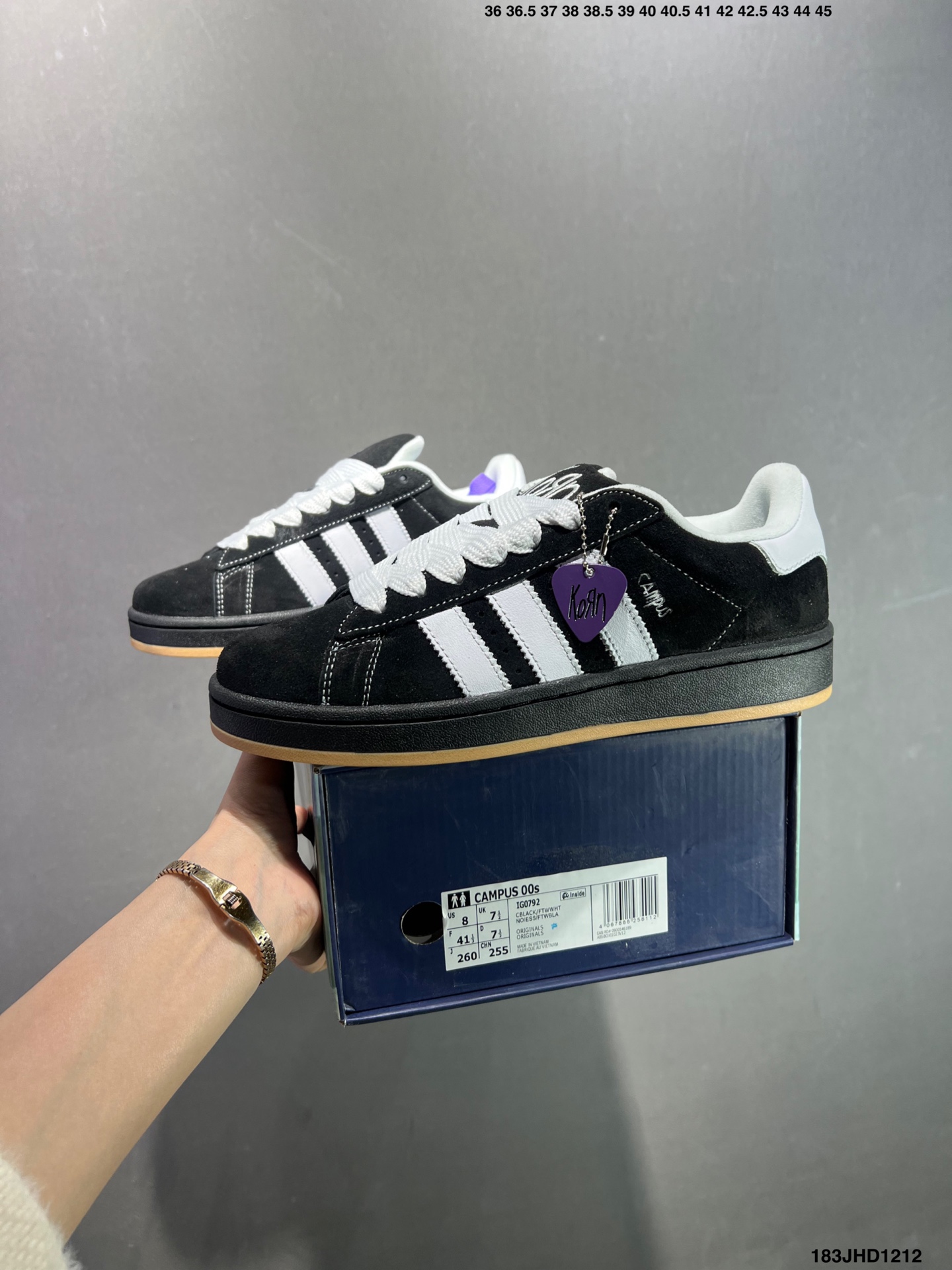 Adidas 阿迪达斯 男女鞋半码制 原楦开发版型 采用绒面翻毛革组合牛剖革饰片鞋面材质 外置耐磨橡胶大底时隔25年首次复刻 这双 重磅联名鞋 摇滚科恩乐队Korn x Adidas Originals Campus 00s Black 学院系列面包风经典复古低帮百搭休闲运动板鞋 联名绒面黑白生胶底 IG0792